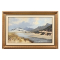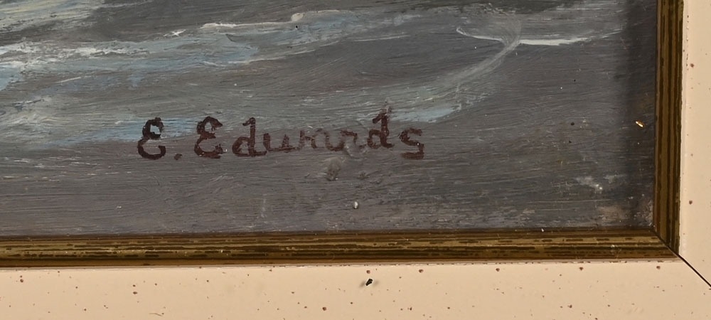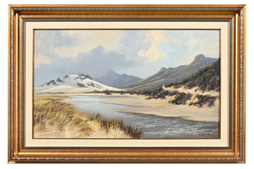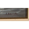 E Edwards, oil on board of a shoreline inlet. 54 cm x 22 cm, framed mounted and glazed.