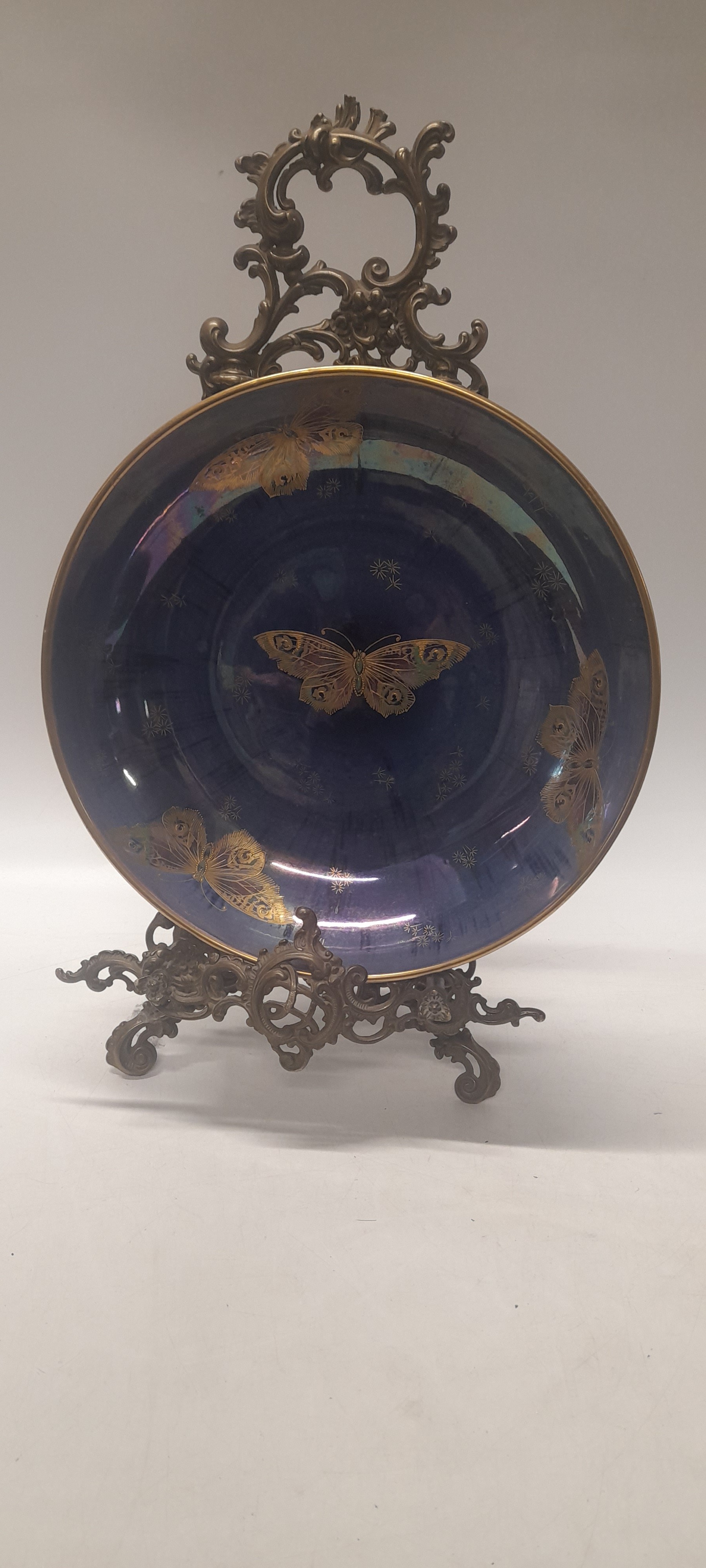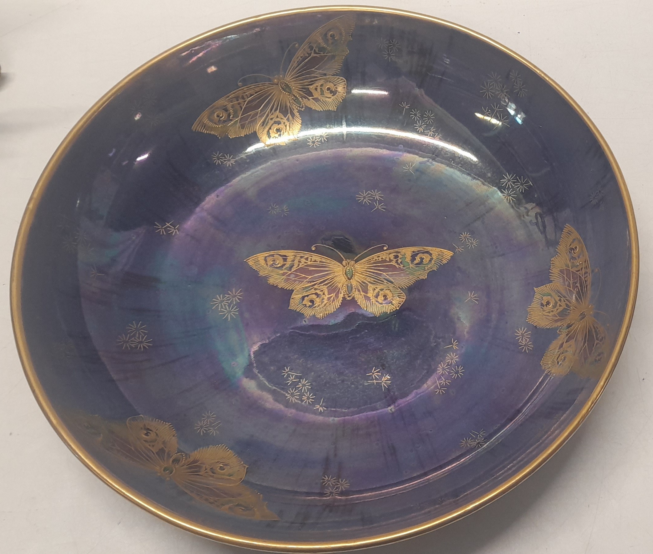 A Shelley porcelain bowl, blue lustre decorated in gilt enamel with butterflies, signed to the base Walter Slater - 12in. dia.