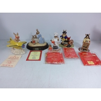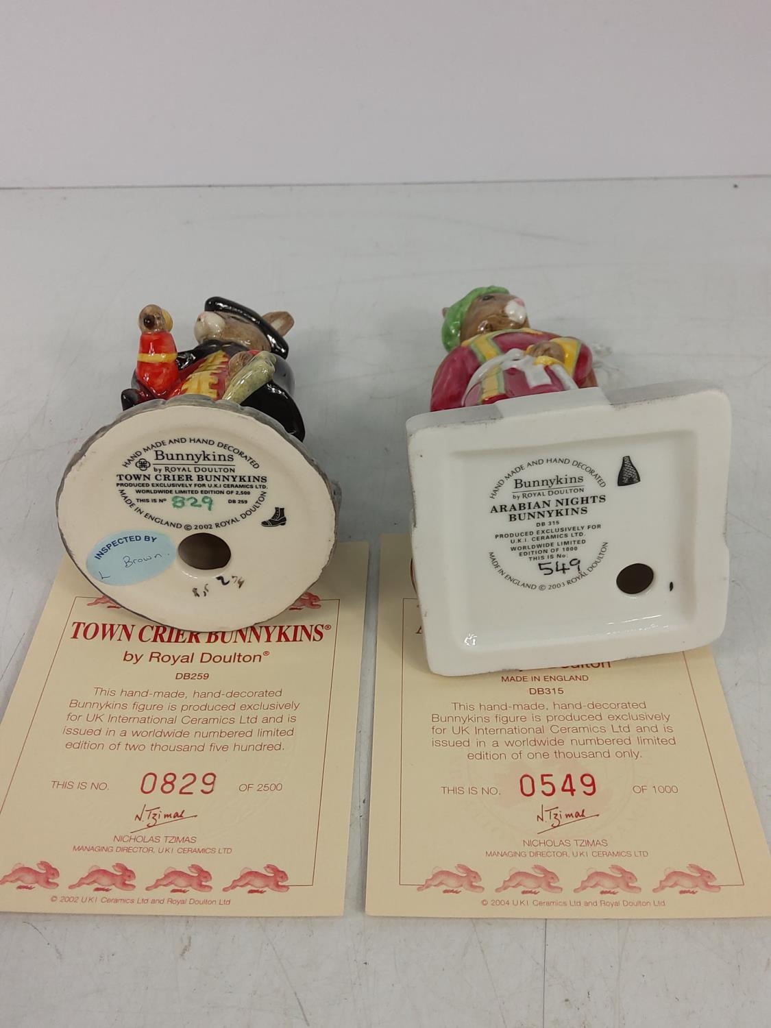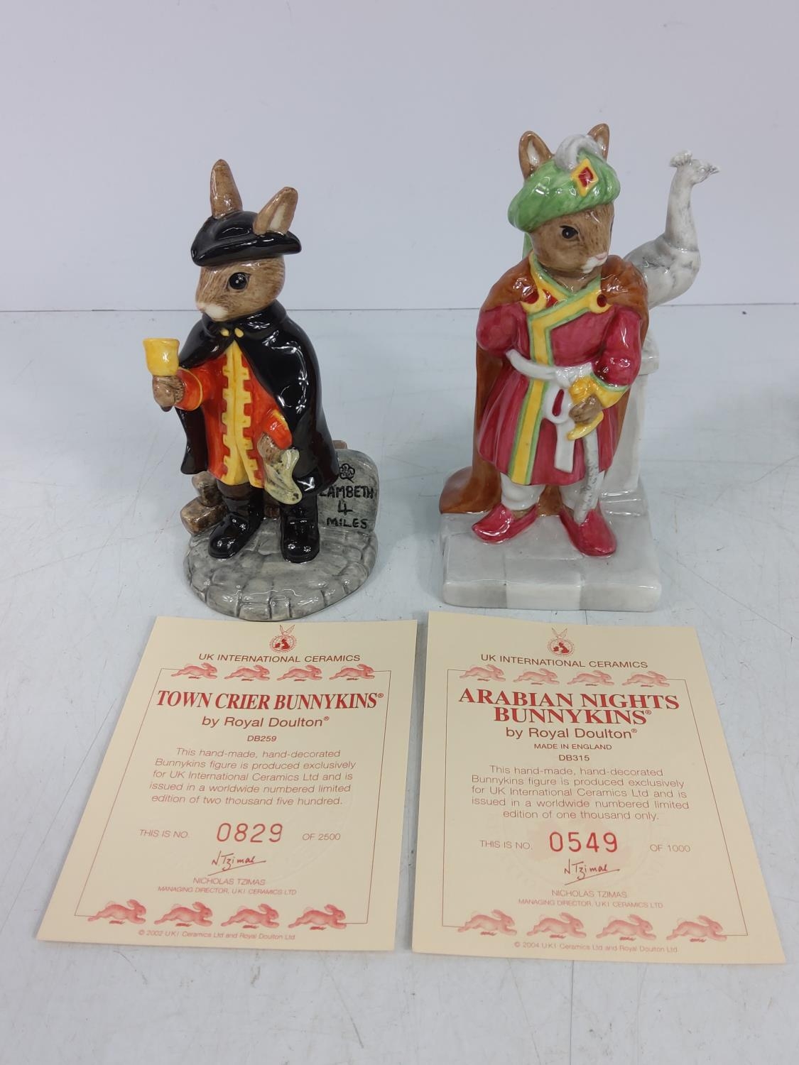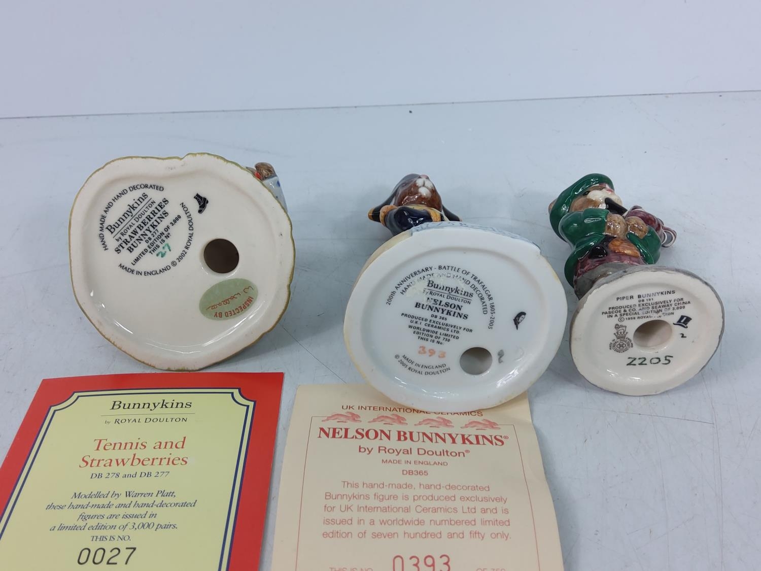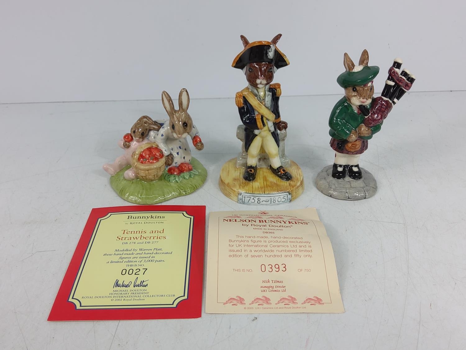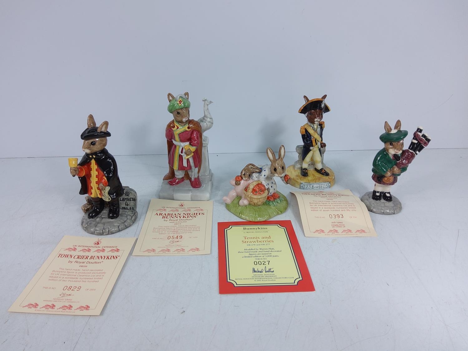 5 various boxed Bunnykin figures, Town Crier DB259, Arabian Nights DB315, Tennis & Strawberries (only Strawberries DB277), Lord Nelson DB365 & Piper DB191, some with certificates