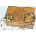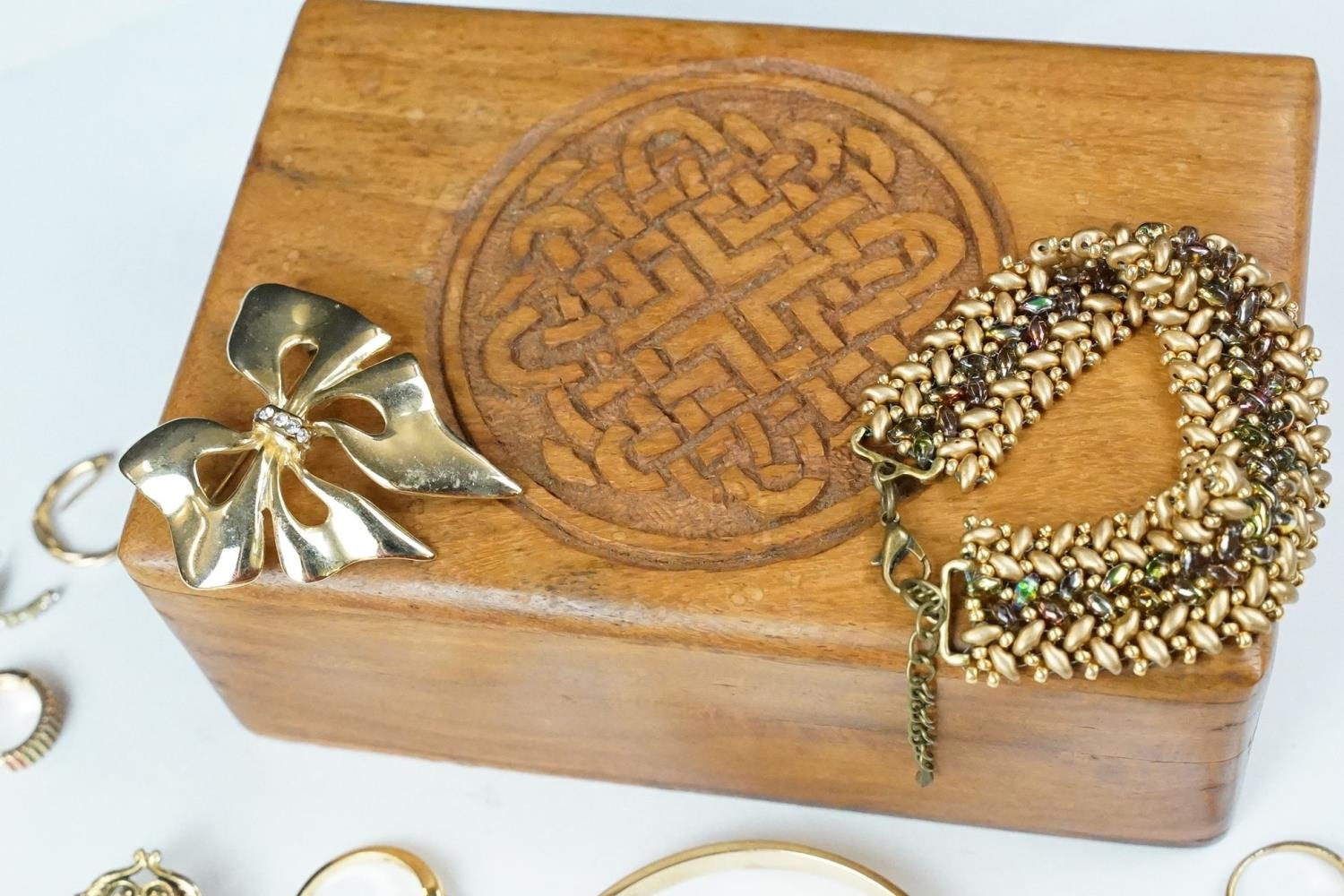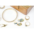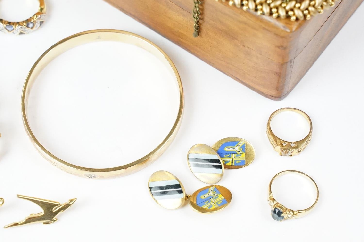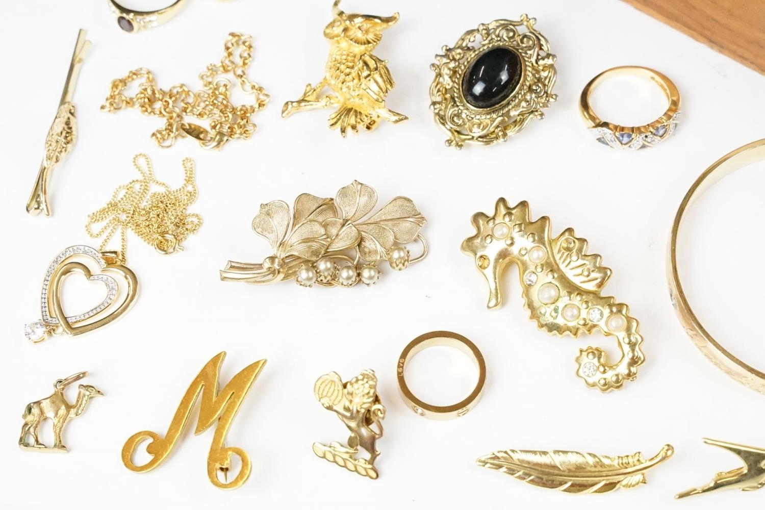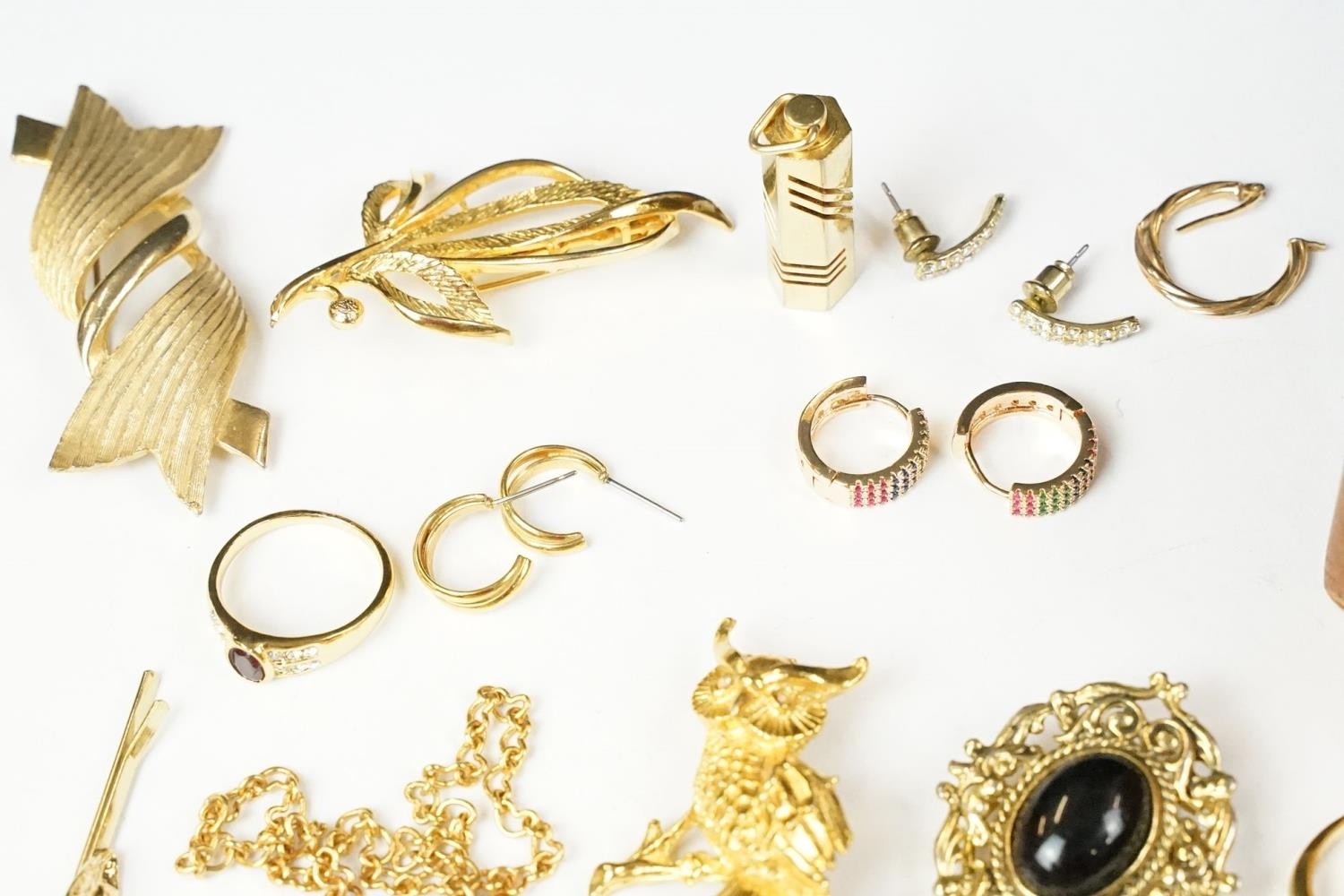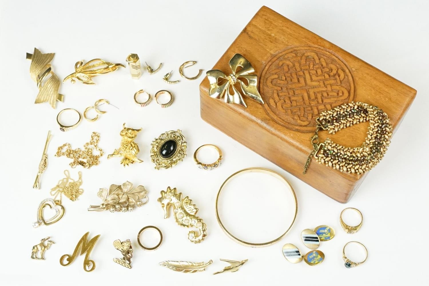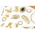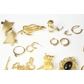 Collection of gilt yellow metal and gold jewellery including brooches and bangles