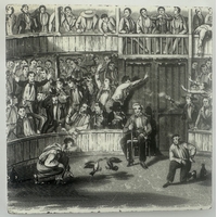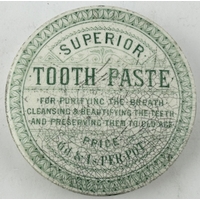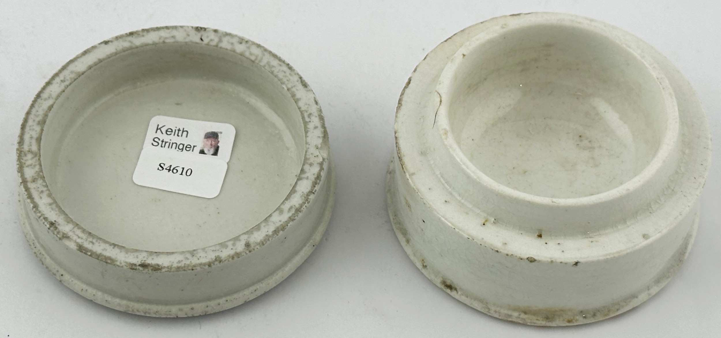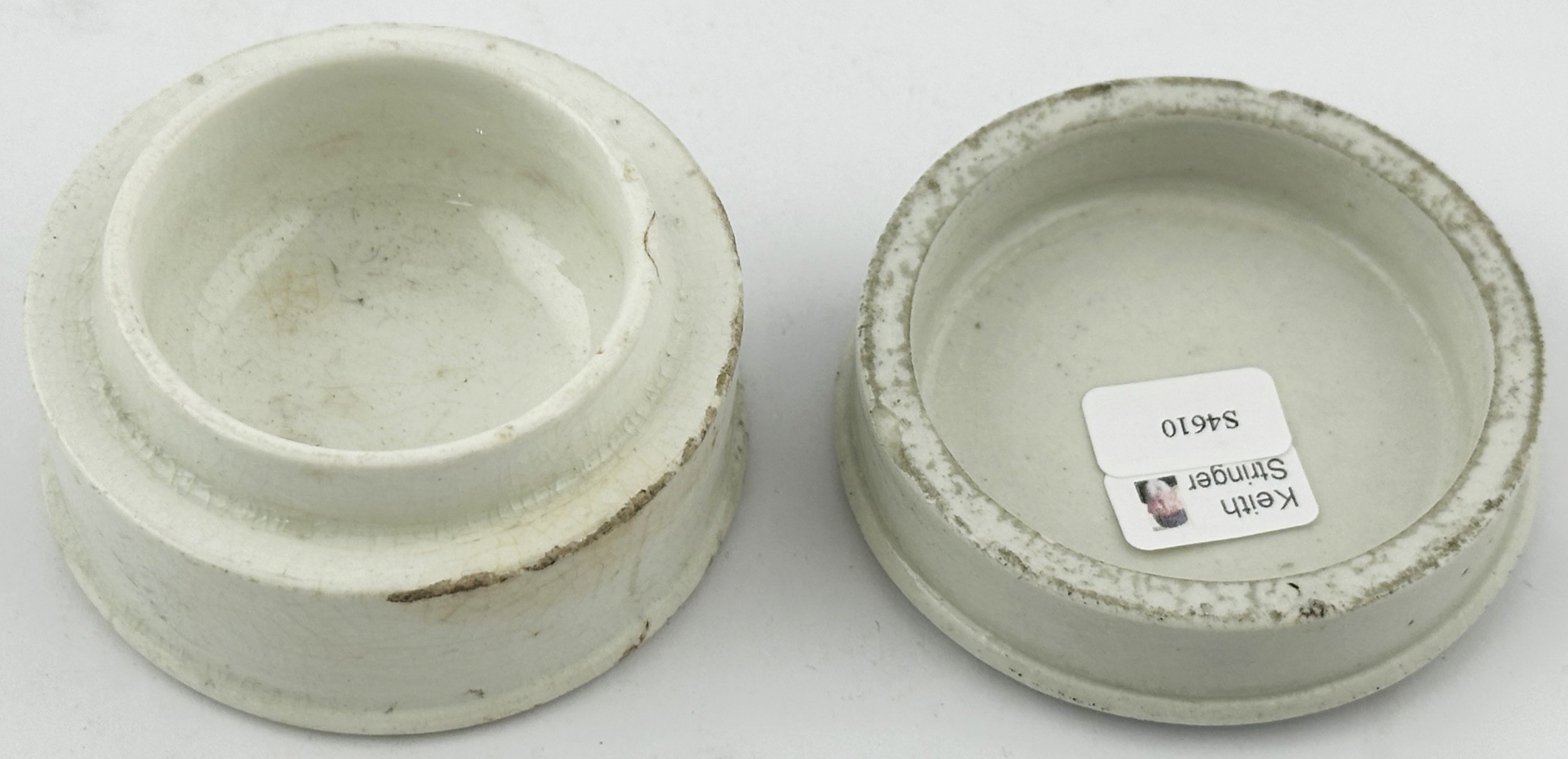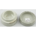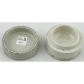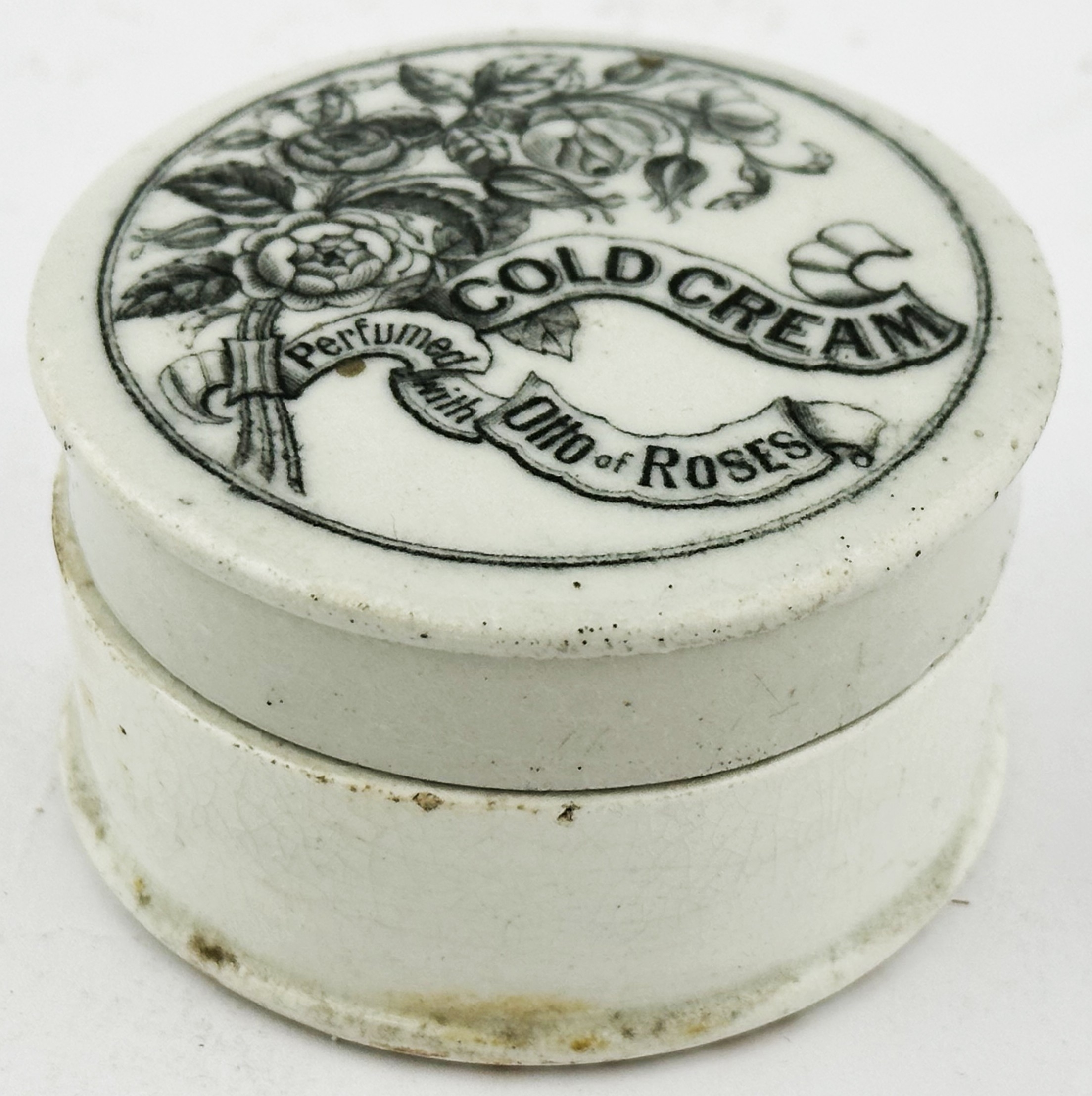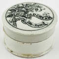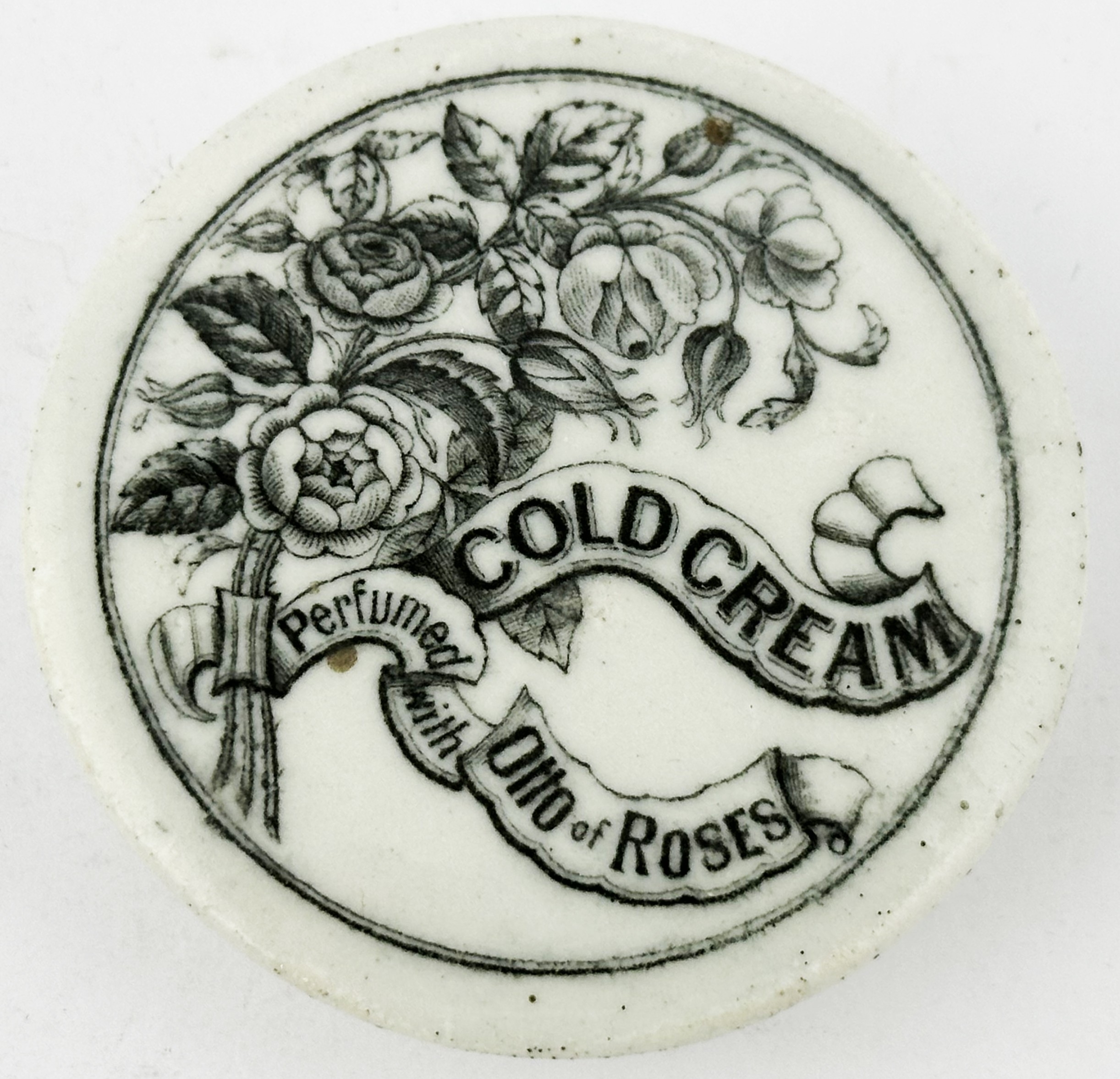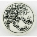 GENERIC COLD CREAM POT LID WITH BASE. (APL p134, 66) 2.5ins diam. Black transfer with solid border. Pict f loral bouquet with ribbon. Slight edge wear to glaze. Ex Keith Stringer collection.