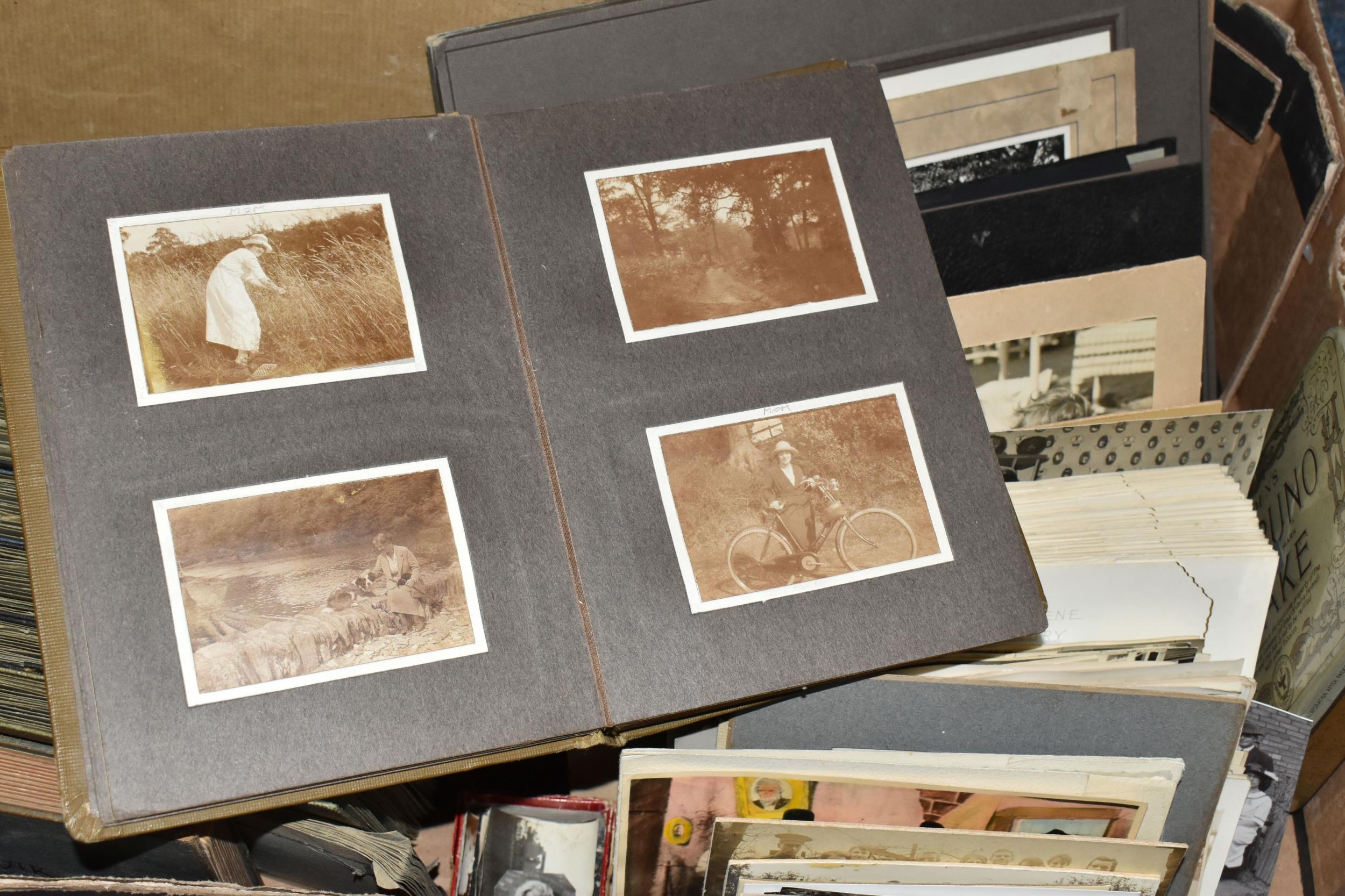 ONE BOX OF EPHEMERA to include a large collection of superb photographs taken in Great Britain and Europe, mainly of rural scenes with inhabitants and dating from the early-mid 20th century, Edwardian photographic portraiture, indentures/correspondence from the Victorian era to the mid-20th century, matchbox tops