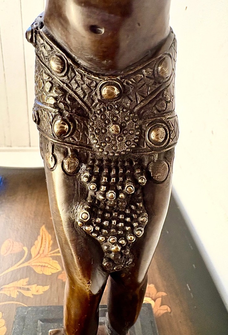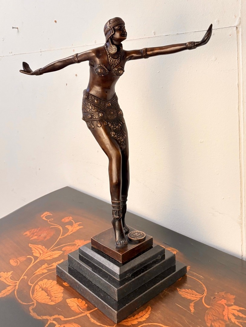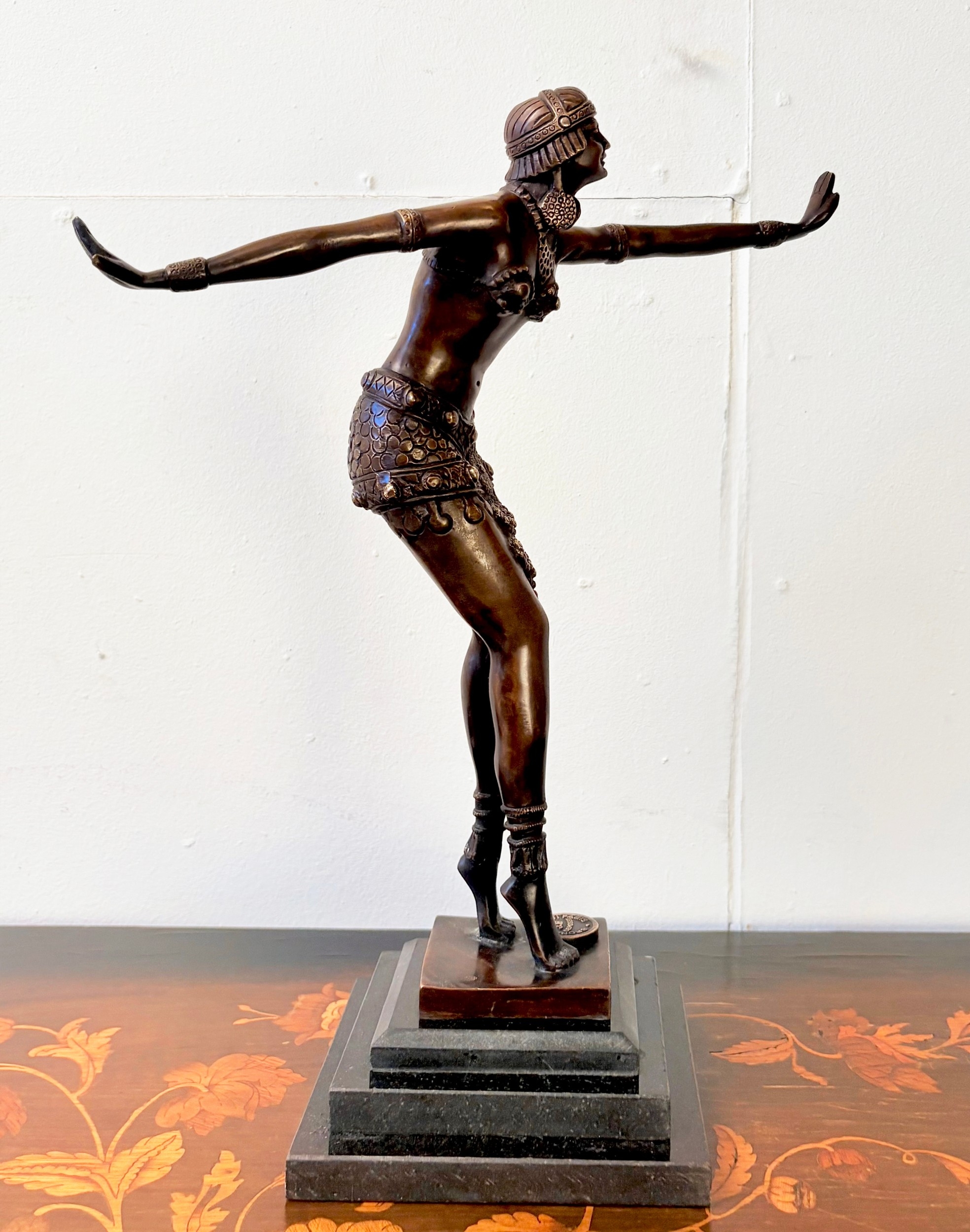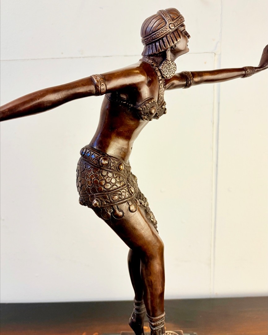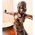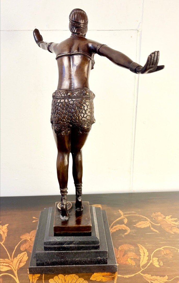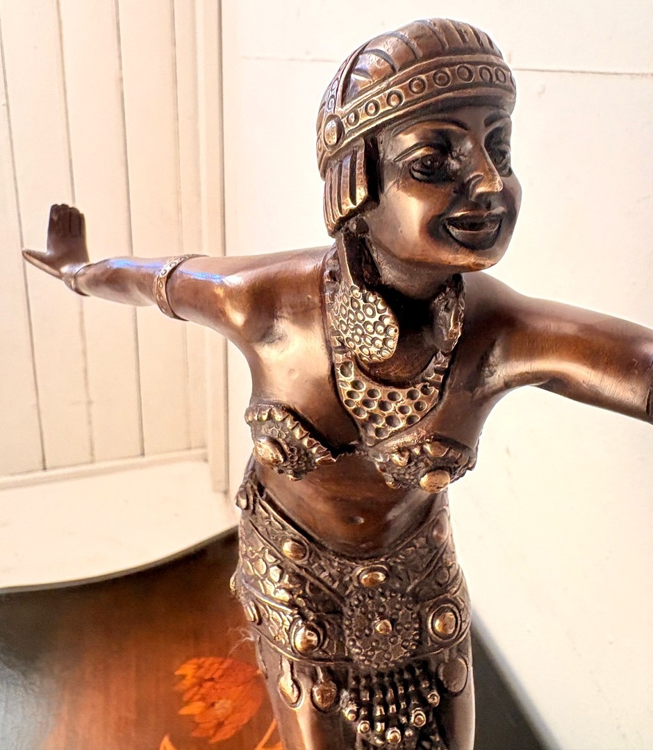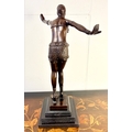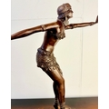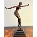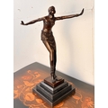 ART DECO STYLE BRONZE SCULPTURE OF A DANCER ON A STEPPED MARBLE BASE. 43cm H x 37cm W x 15cm D.