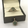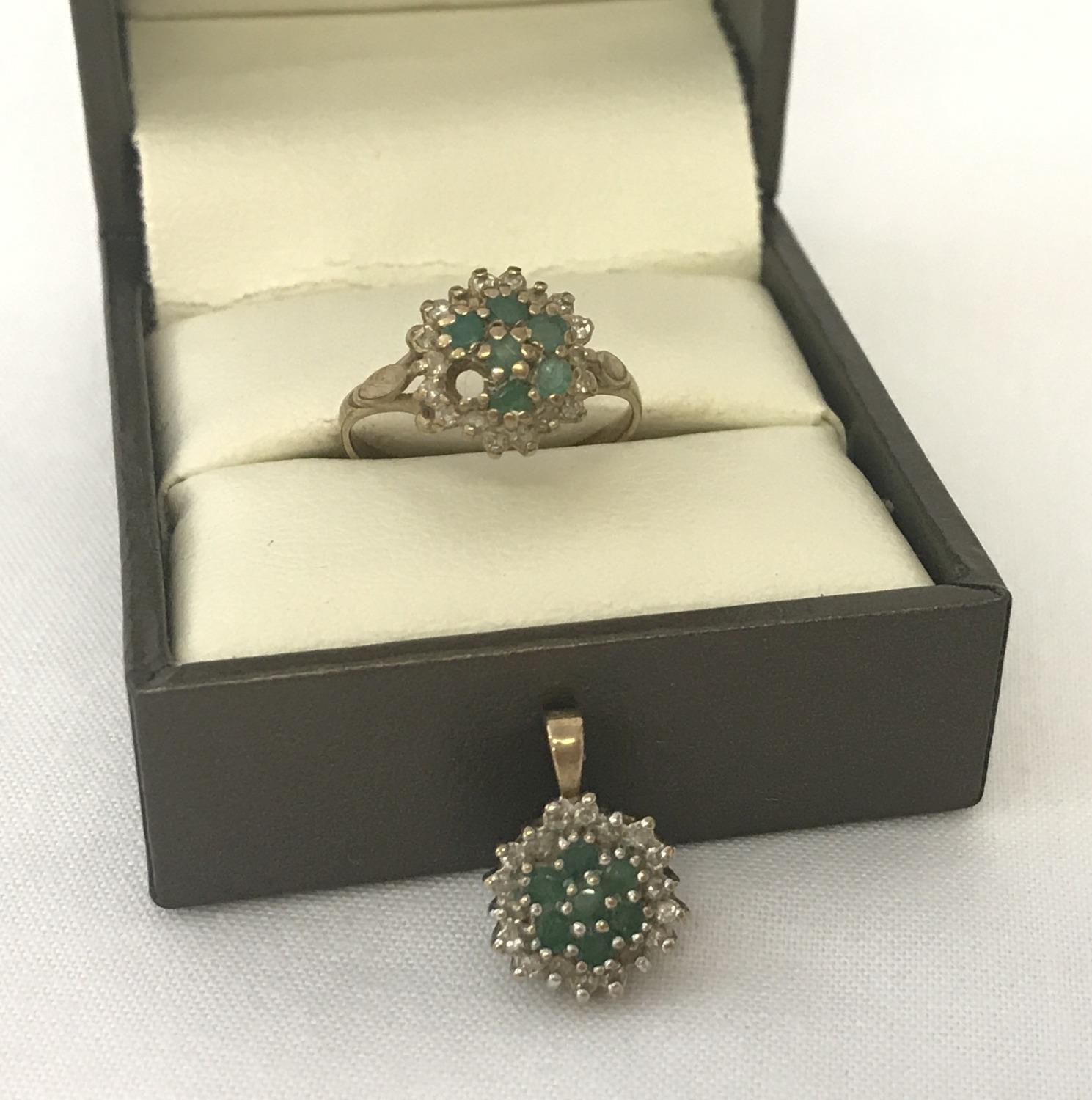 A 9ct gold dress ring and matching pendant, set with emeralds and diamonds. Both cluster design, each has 7 small round cut emeralds surrounded by 18 small round cut diamonds. Ring has one emerald missing. Ring size K. Total weight approx 2.8g