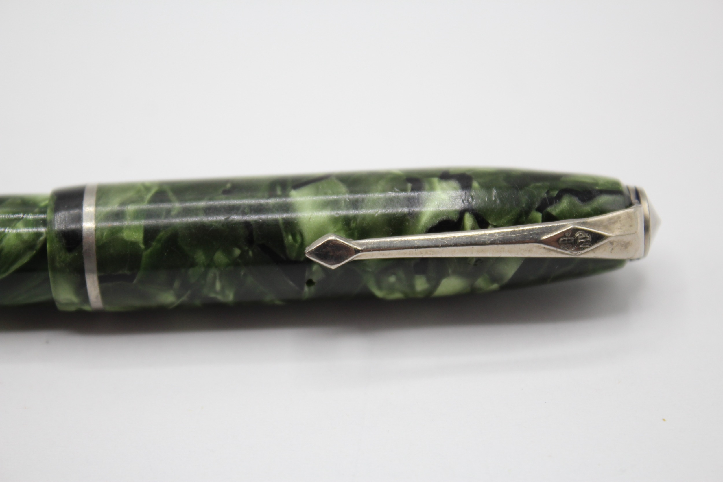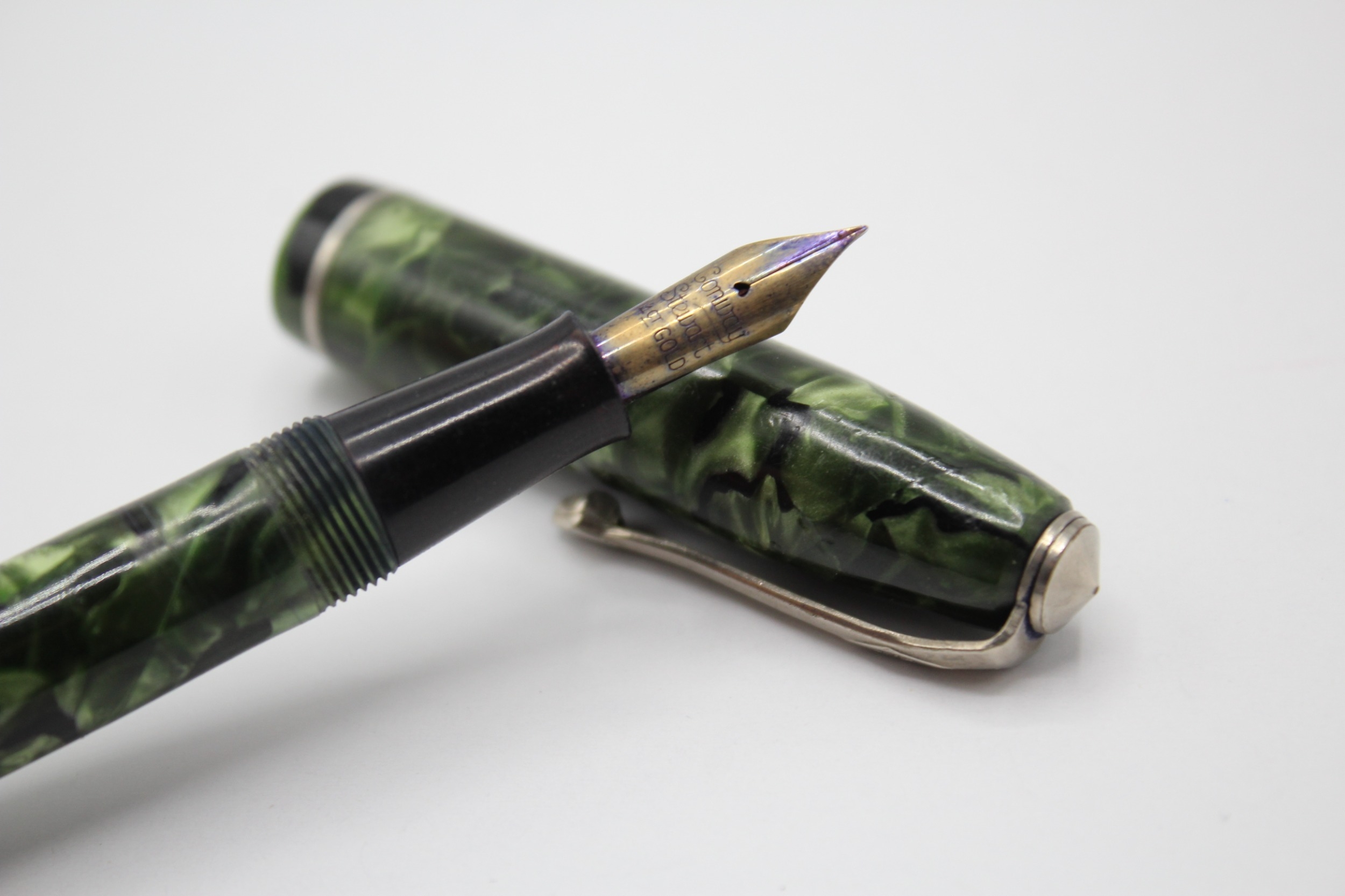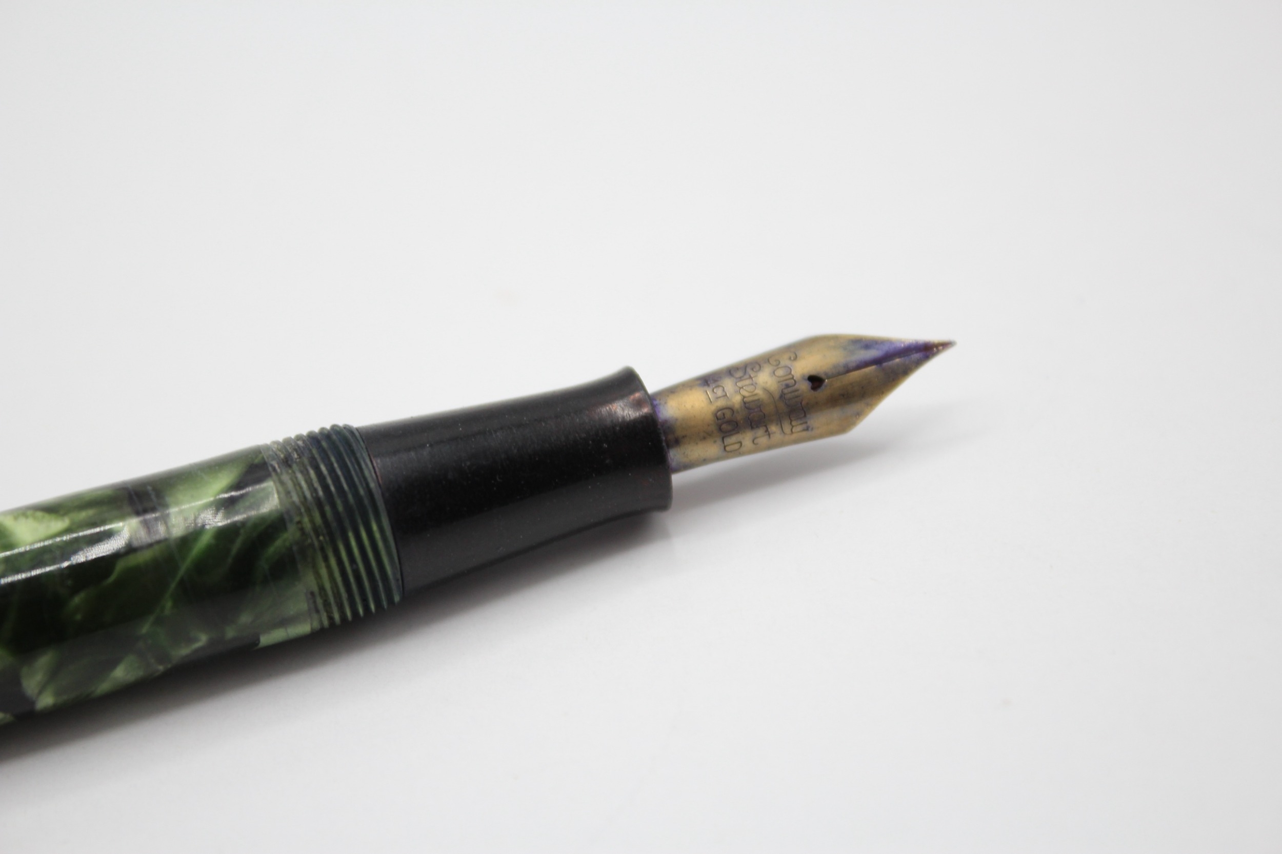 Conway Stewart - 75 Green Cased Fountain Pen, 14ct Gold Nib, Dip Tested & Writing. The pen is in good condition with signs of use & ink build-up. The ink filling system has not been tested.