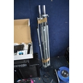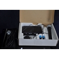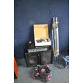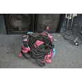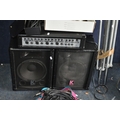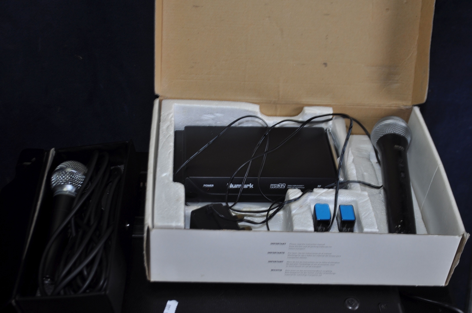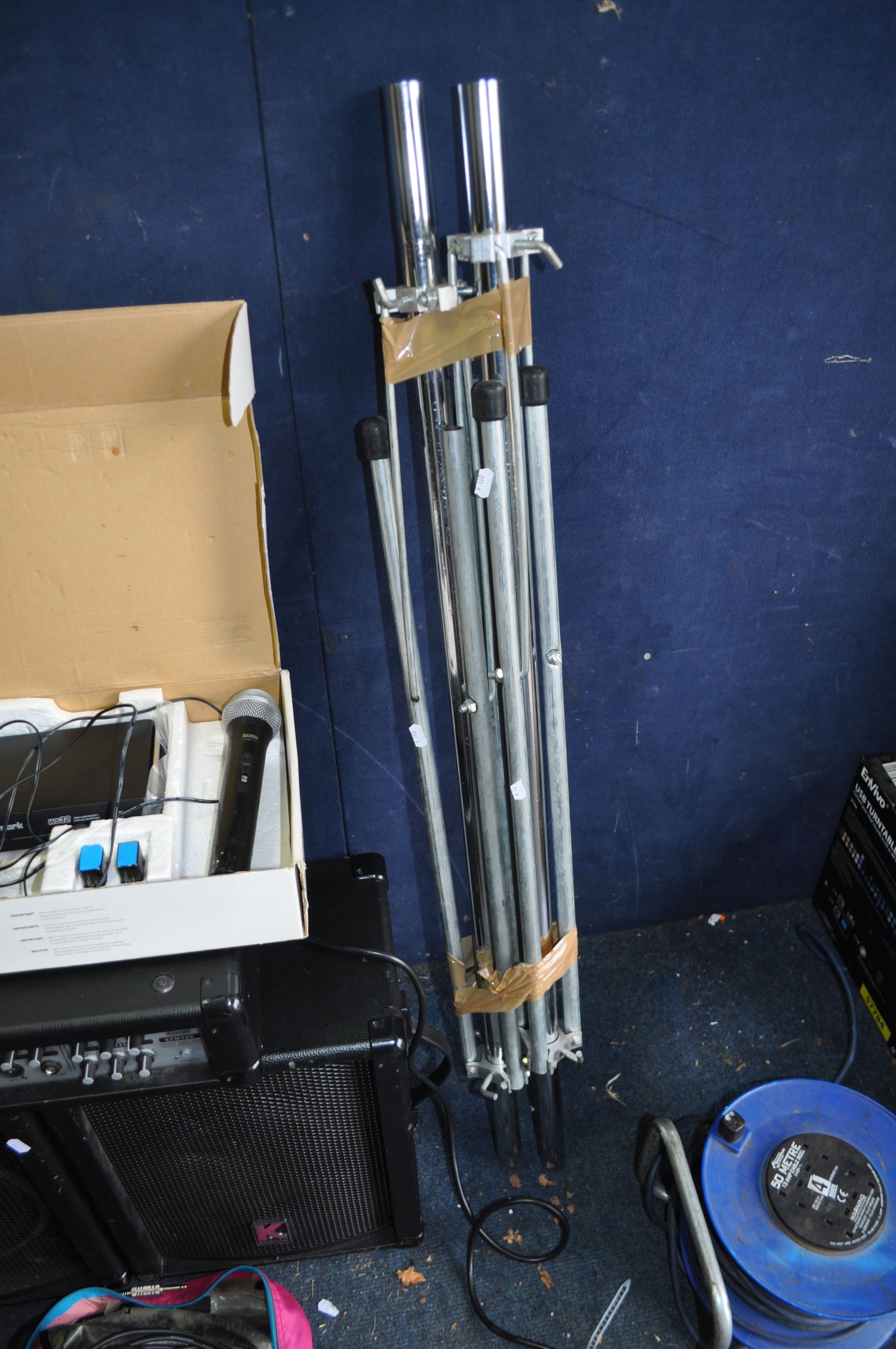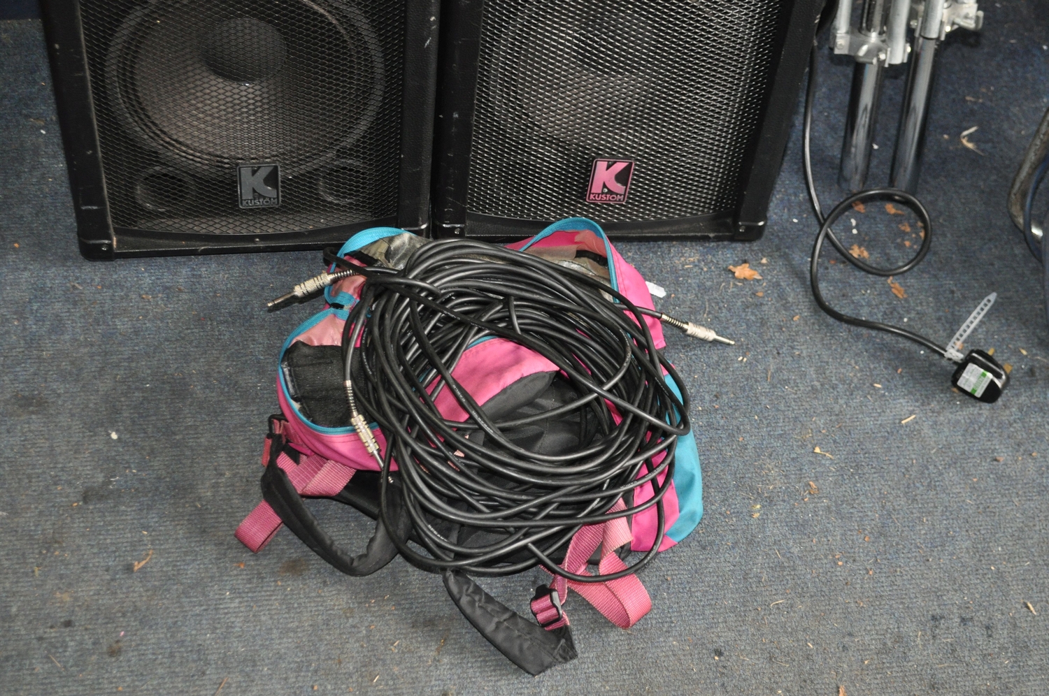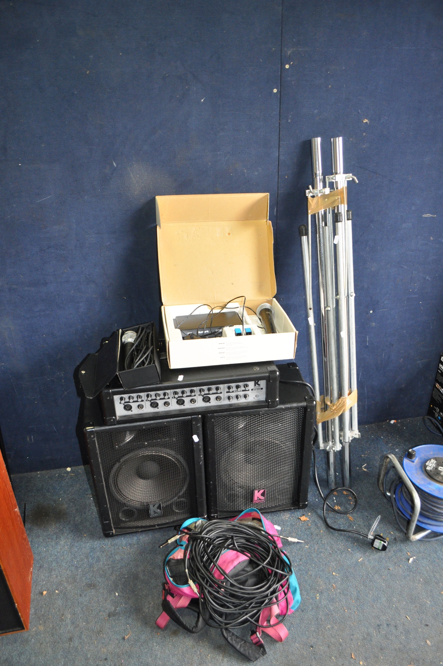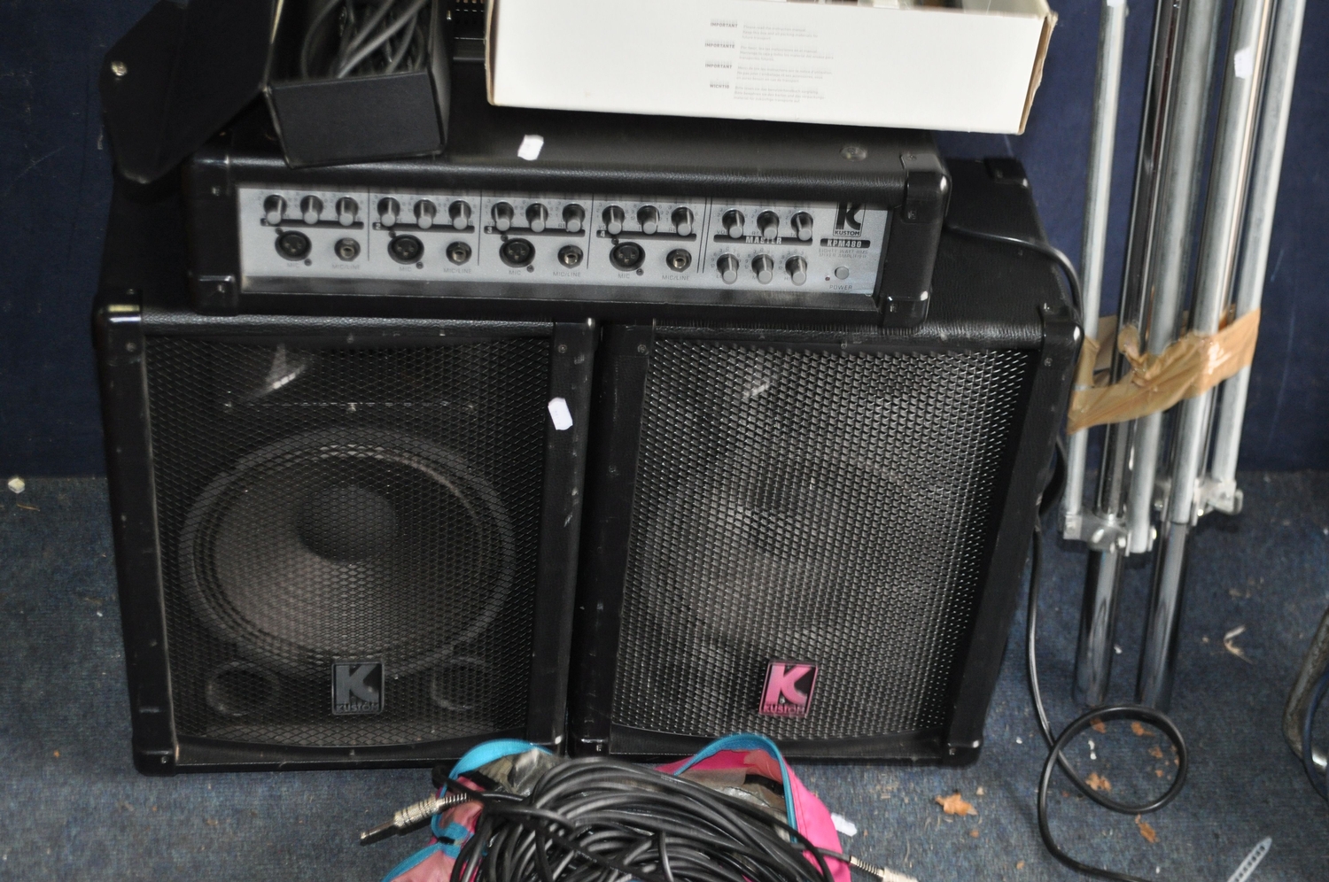 A KUSTOM KPM480 PA AMPLIFIER, a pair of Kustom speakers, two tripod stands, a Numark radio mic (handset rubber finish deteriorated), an Eagle cabled mic and a bag of cables (all previous PAT pass and working)