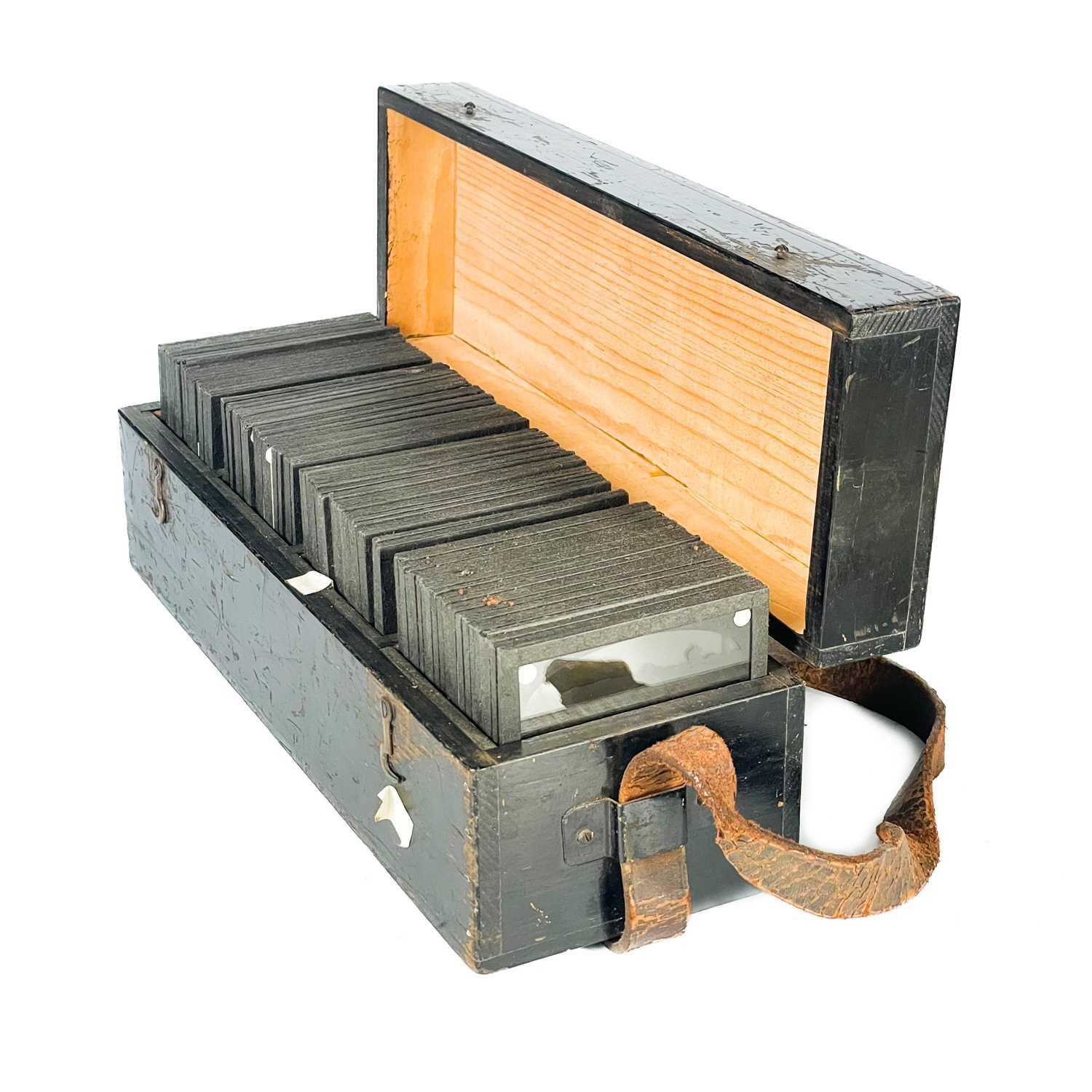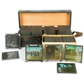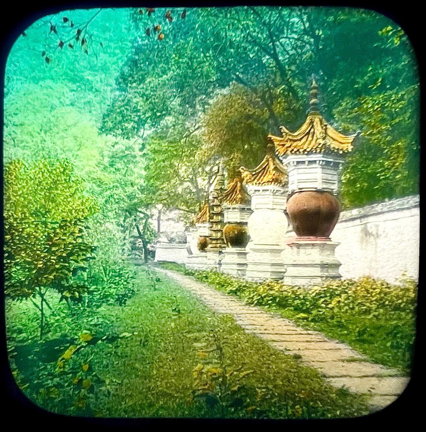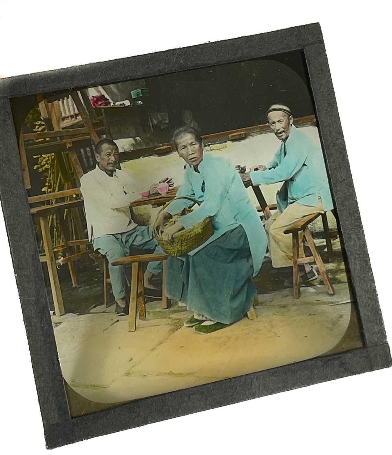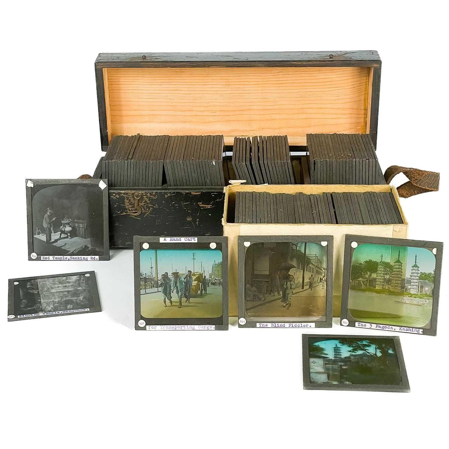 China interest. A collection of glass lantern slides. Over one hundred b+w glass slides in two boxes, with descriptions and numbers, some colour slides, showing temples, people, resturants, city scenes, processions, pagodas, the Summer Palace etc, [c.1900]. (100+)