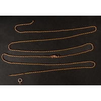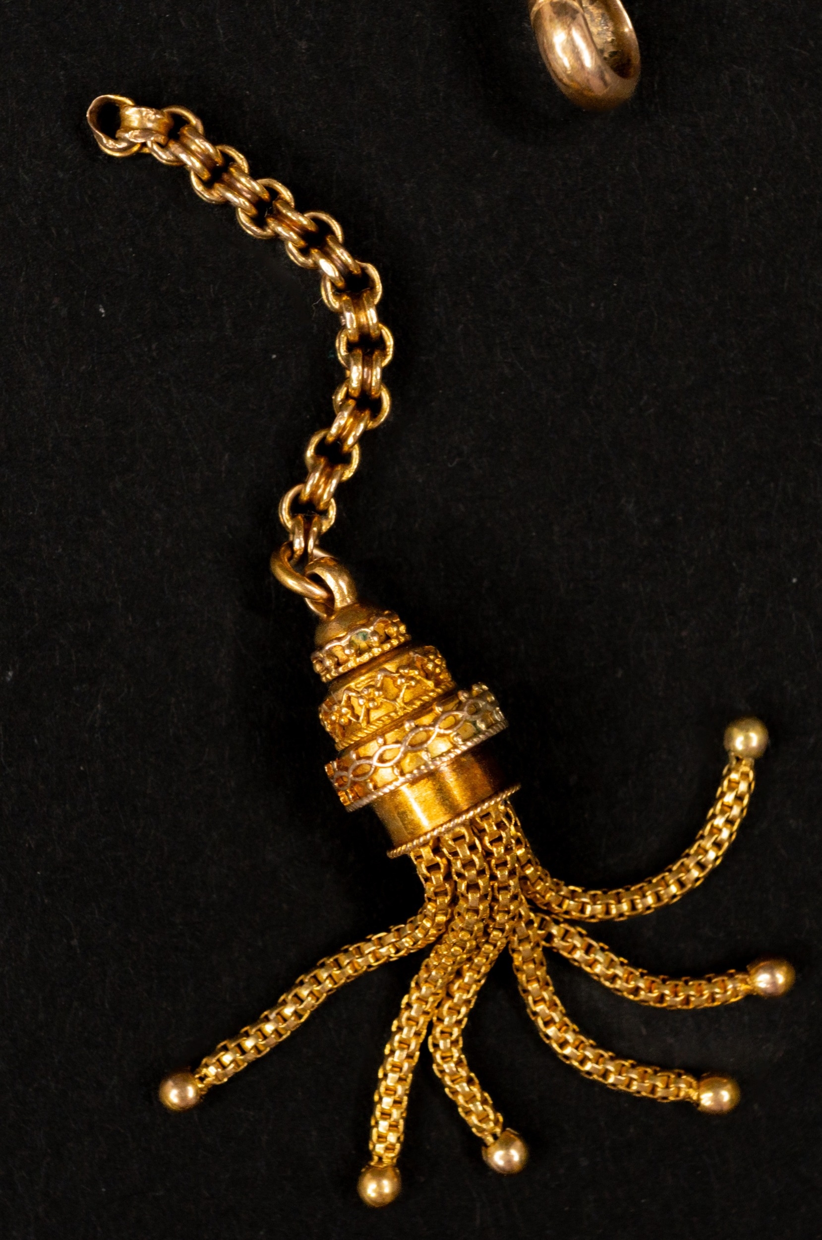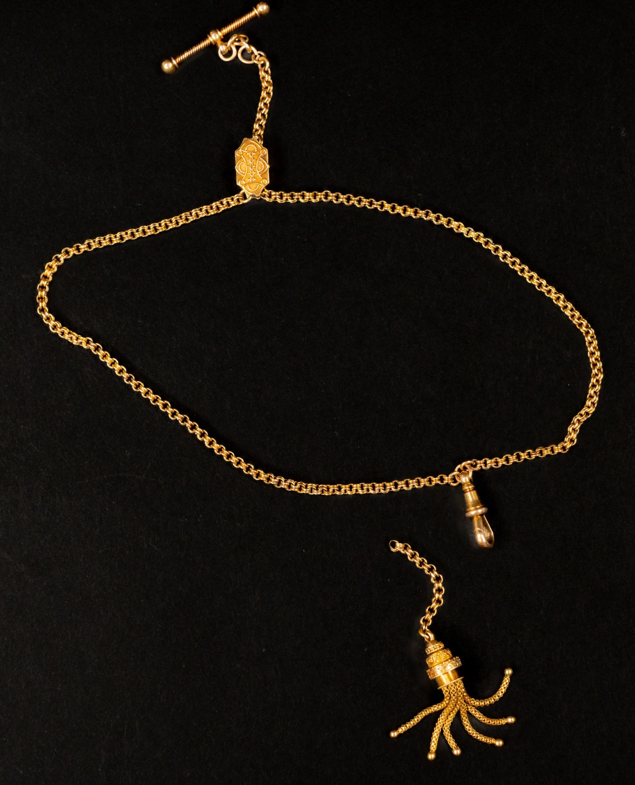 Jewellery: 15ct gold Albertina chain with slider, T bar and detached tassel, length 40cm, 15.6g.
