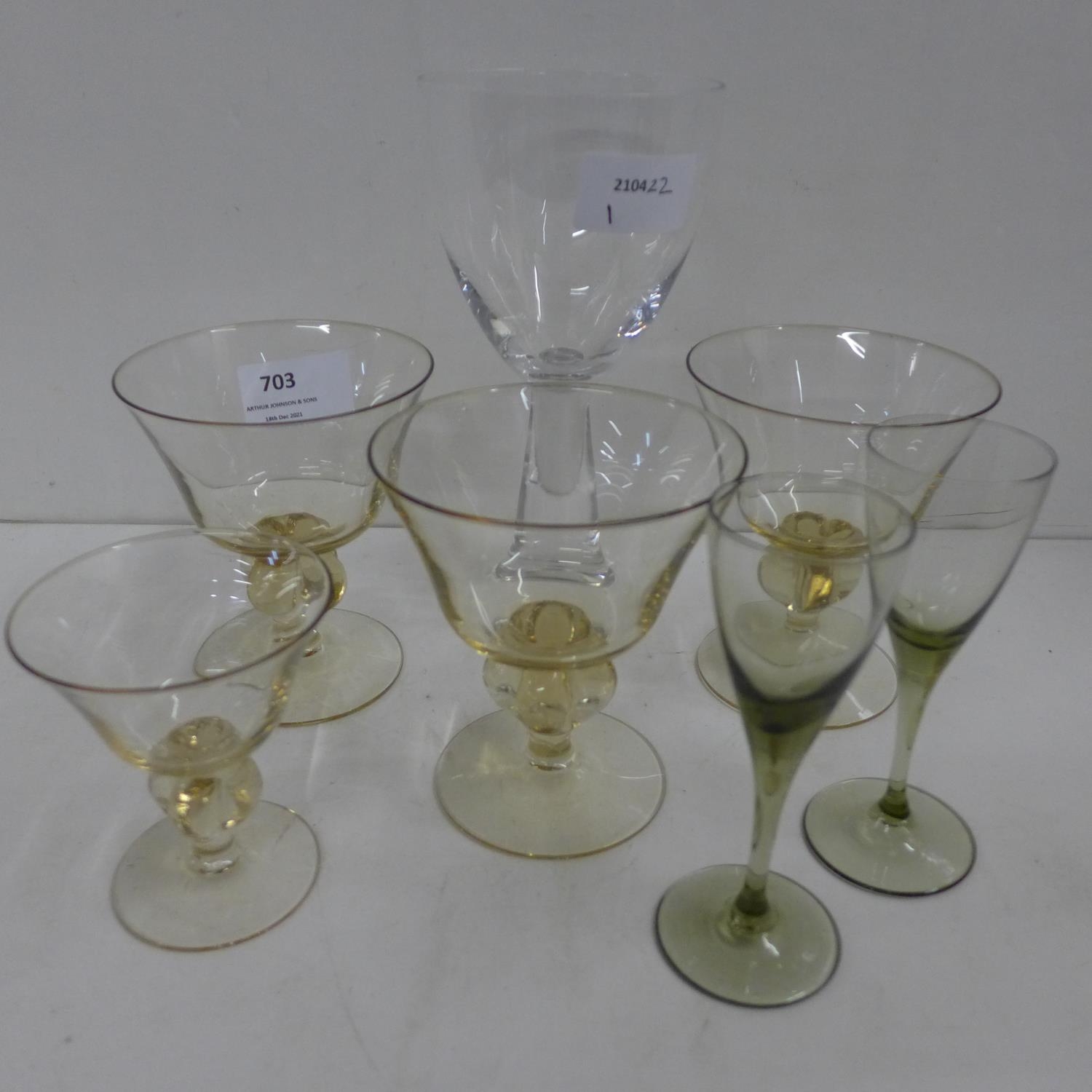 A set of three Swedish Skruff Champagne sherbet glasses, one other Skruff glass and three others