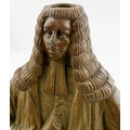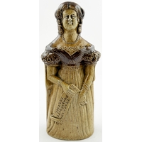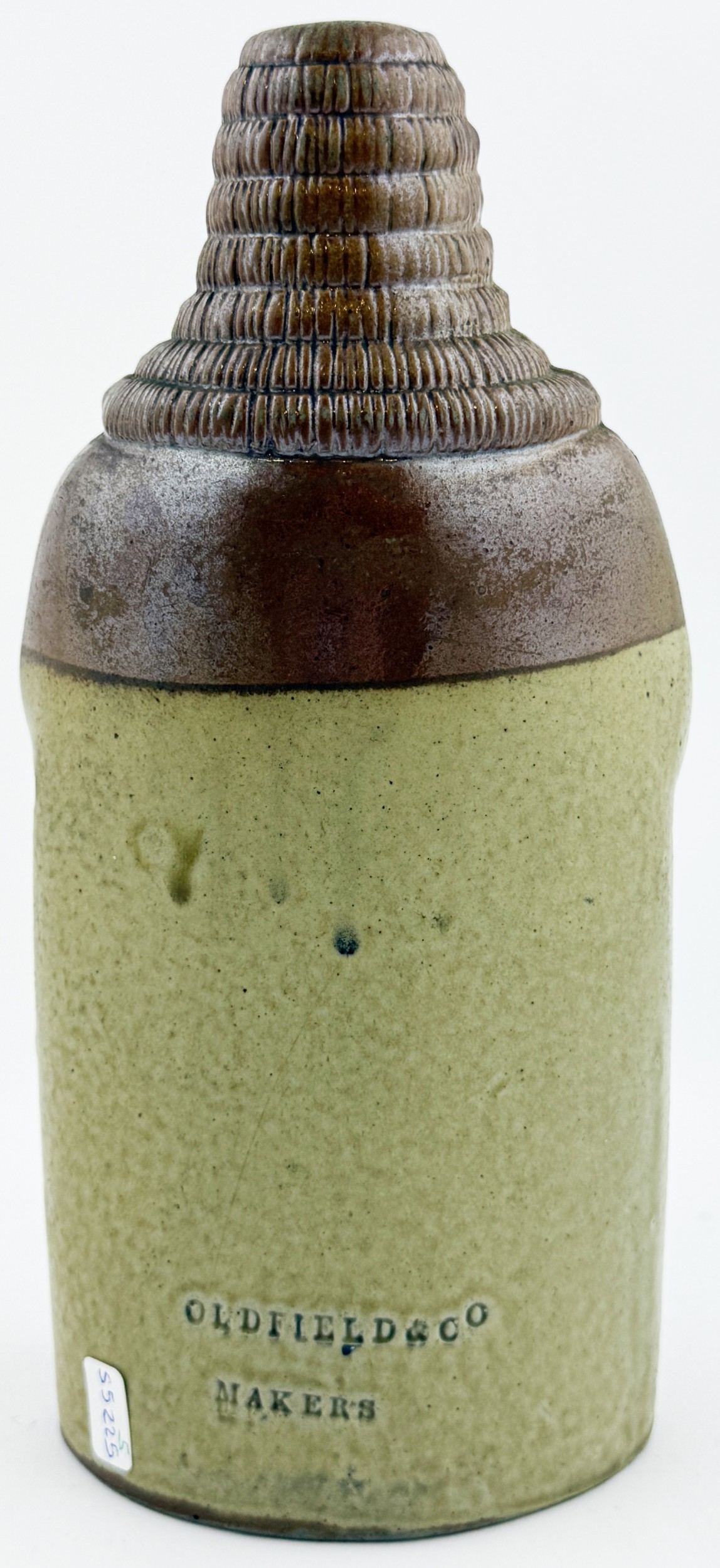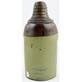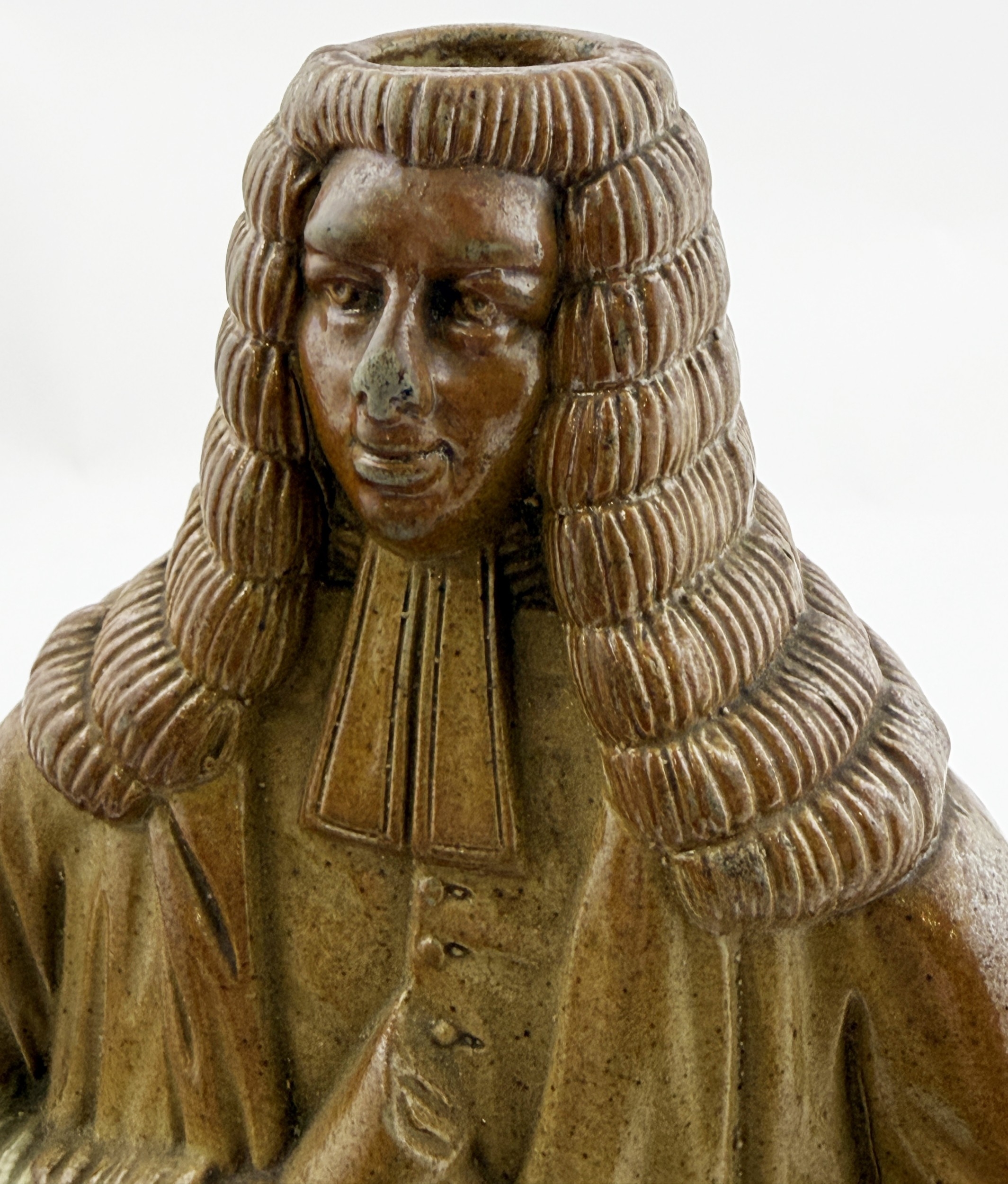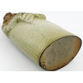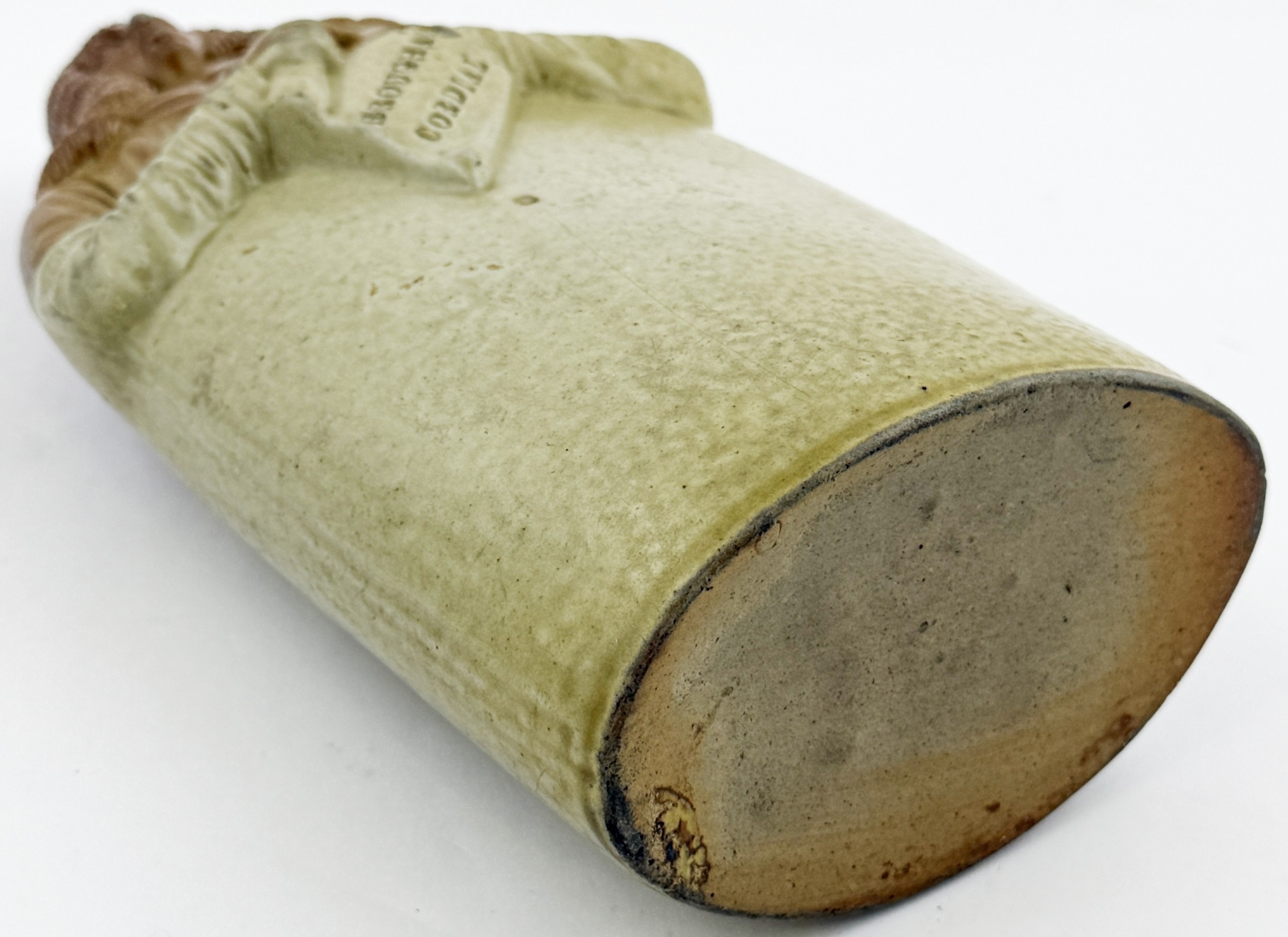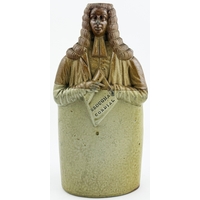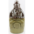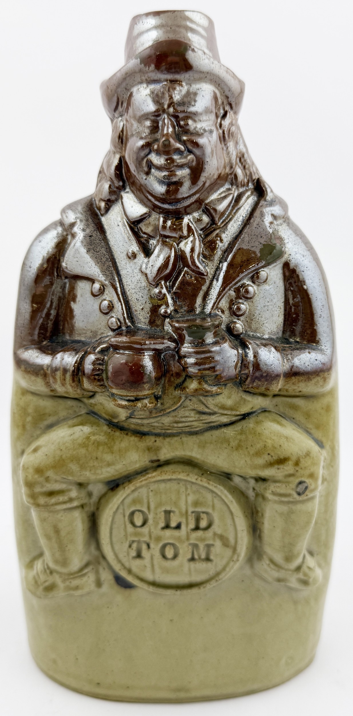 OLD TOM REFORM FLASK. RF p32. 8.5ins tall. Grey-green glaze flask modelled as a toper sitting astride a barrel of Old Tom gin. Hat & beaker high point repairs NR