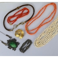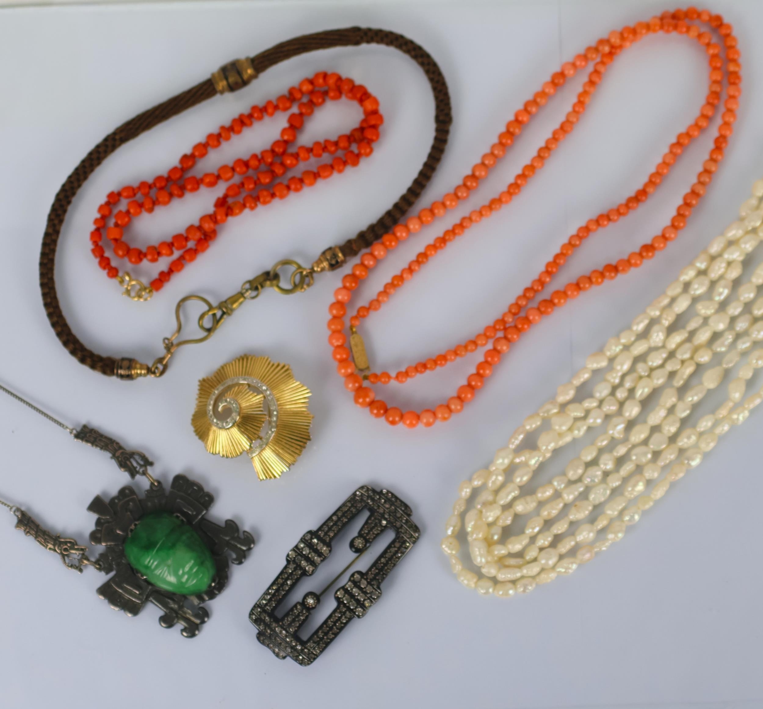 A selection of jewellery, including a Mexican ‘jade’ coloured pendant, of stylised form the carved ‘jade’ depicting face, unmarked, with coral beads, cultured pearls, hairwork necklace and further jewellery (qty) (at fault)