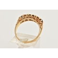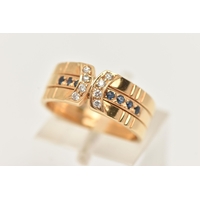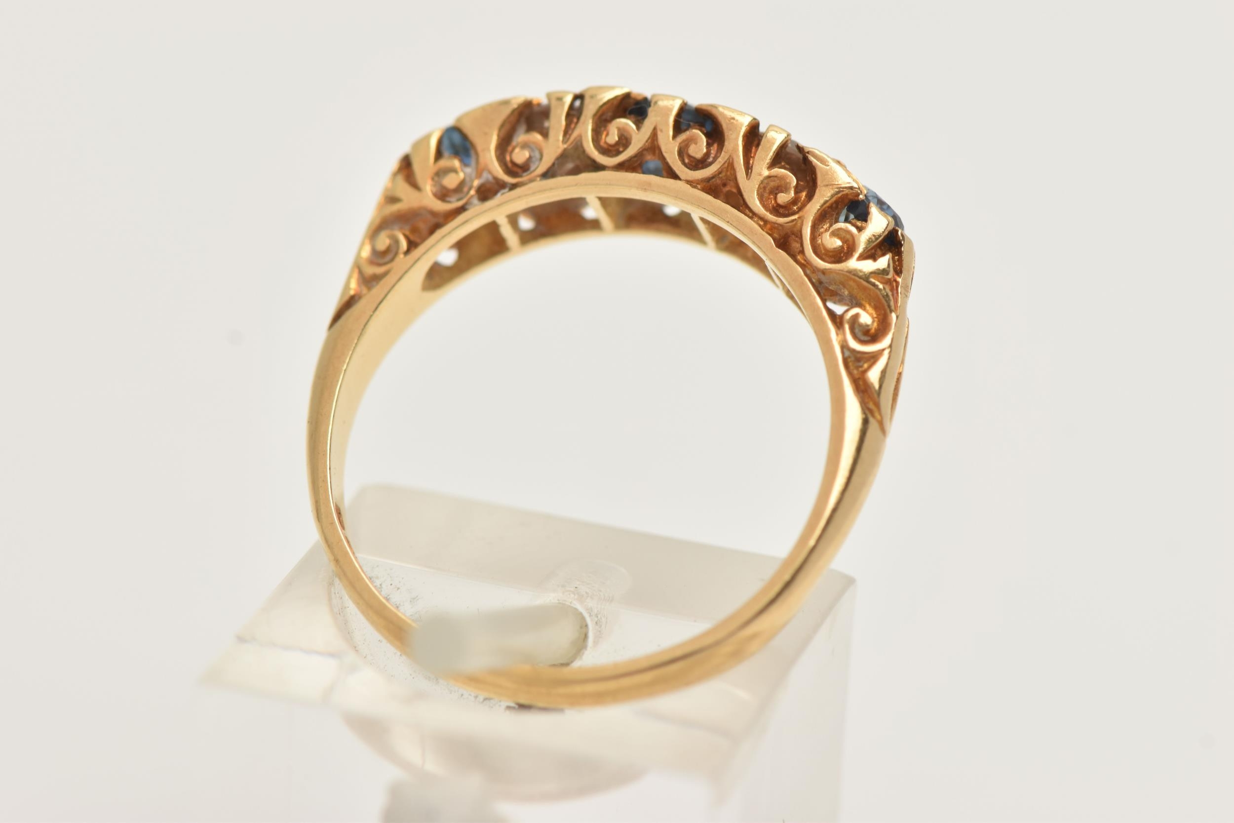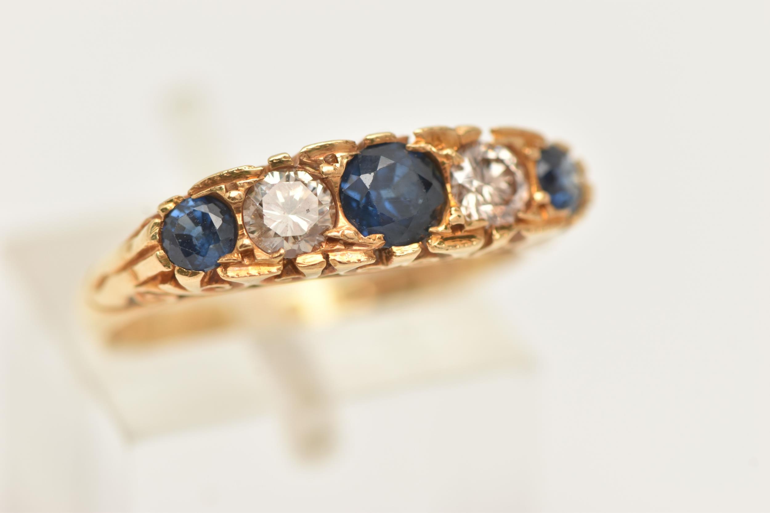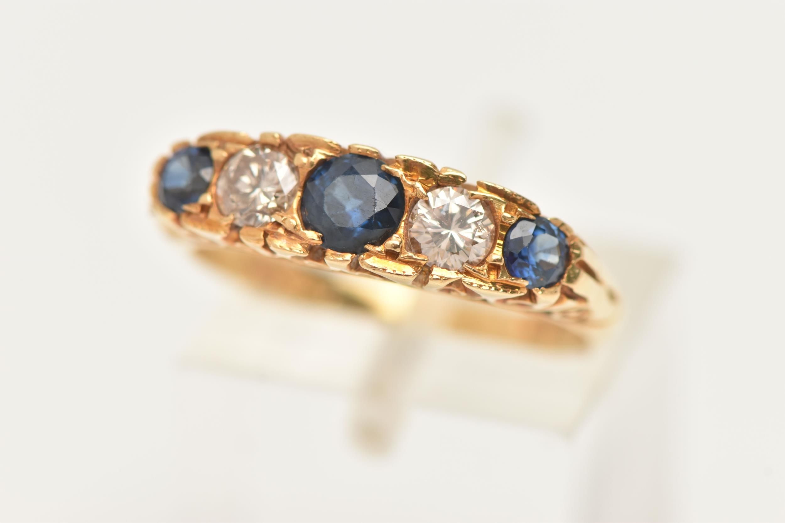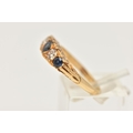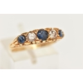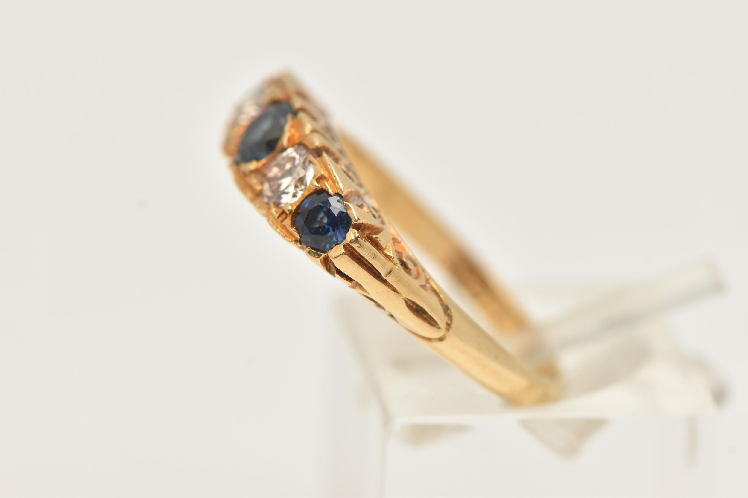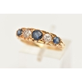 AN 18CT GOLD DIAMOND AND SAPPHIRE RING, set with three circular cut blue sapphires, interspaced with two round brilliant cut diamonds, estimated total diamond weight 0.30ct, to the scrolling gallery and polished band, hallmarked 18ct London 1975, ring size N, approximate gross weight 4.8 grams (condition report: general light wear, stones secure)