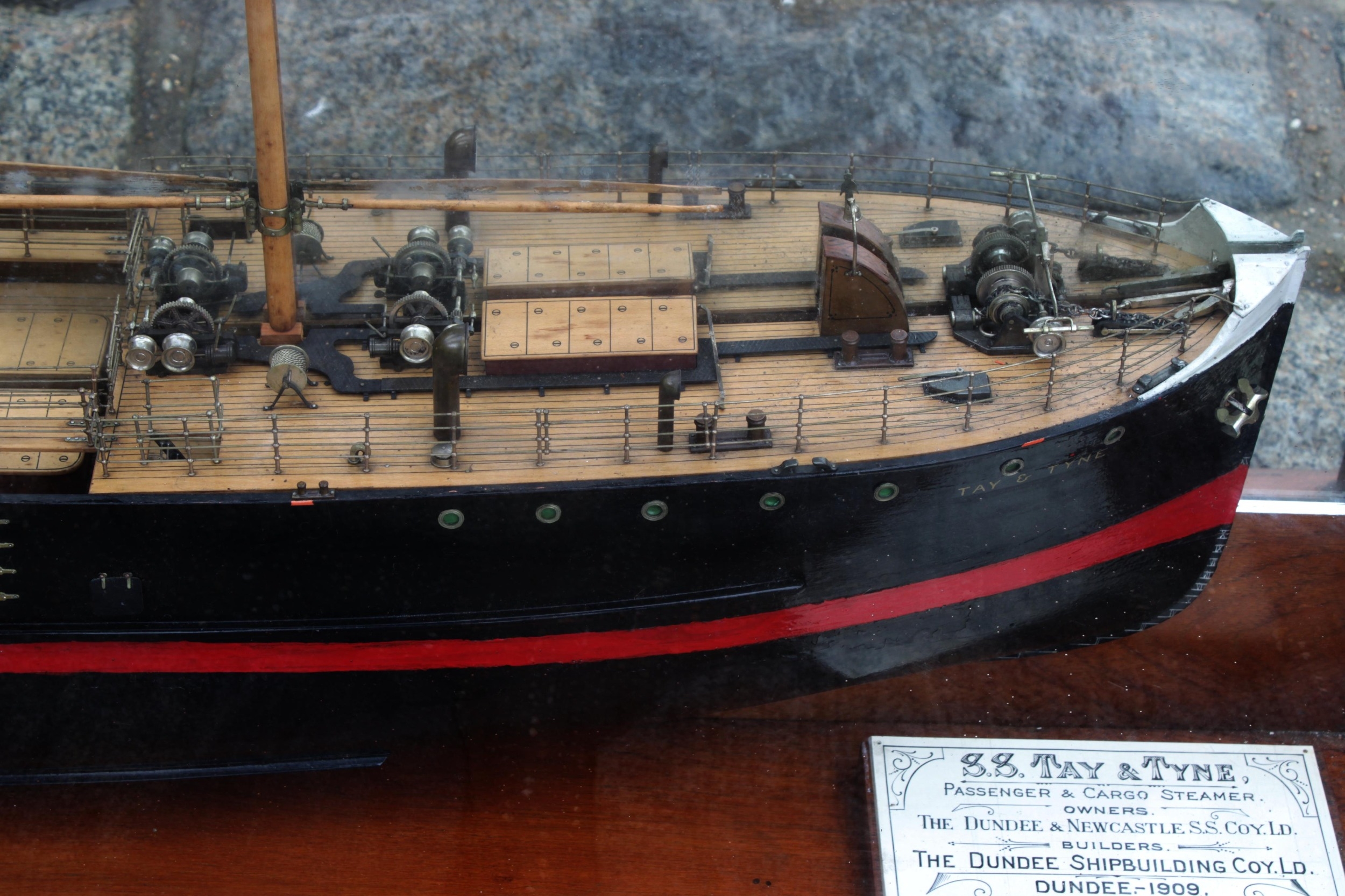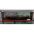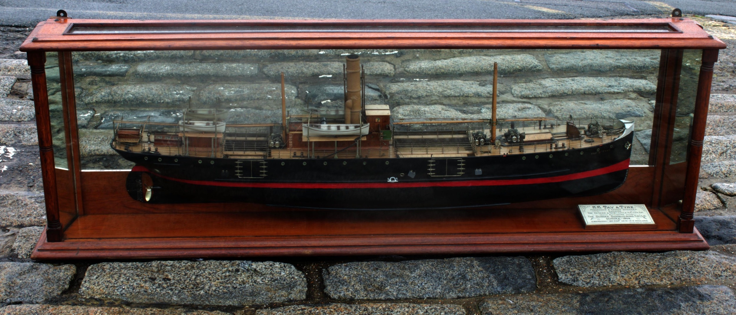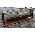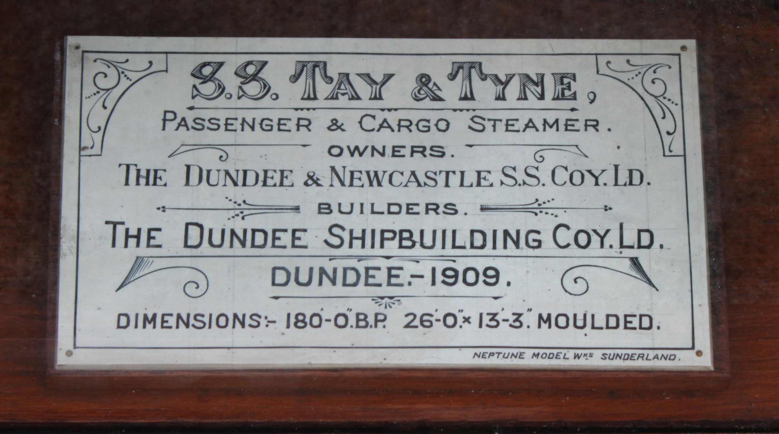 An early 20th century half model of the passenger and cargo steamer S.S. Tay & Tyne, made by the Neptune Model Works, Sunderland, 1909, inscribed on plaque "SS TAY & TYNE. Passenger & Cargo Steamer. Owners The Dundee & Newcastle S.S. Coy. Ld. Builders. The Dundee Shipbuilding Coy. Ld. Dundee - 1909. Dimensions: 180 O.B.P. 26-0" x 13-3." Moulded. Neptune Model Wks Sunderland", mahogany case with turned front supports, mirrored back and sides, 152 x 21cm. x 49cm. high.