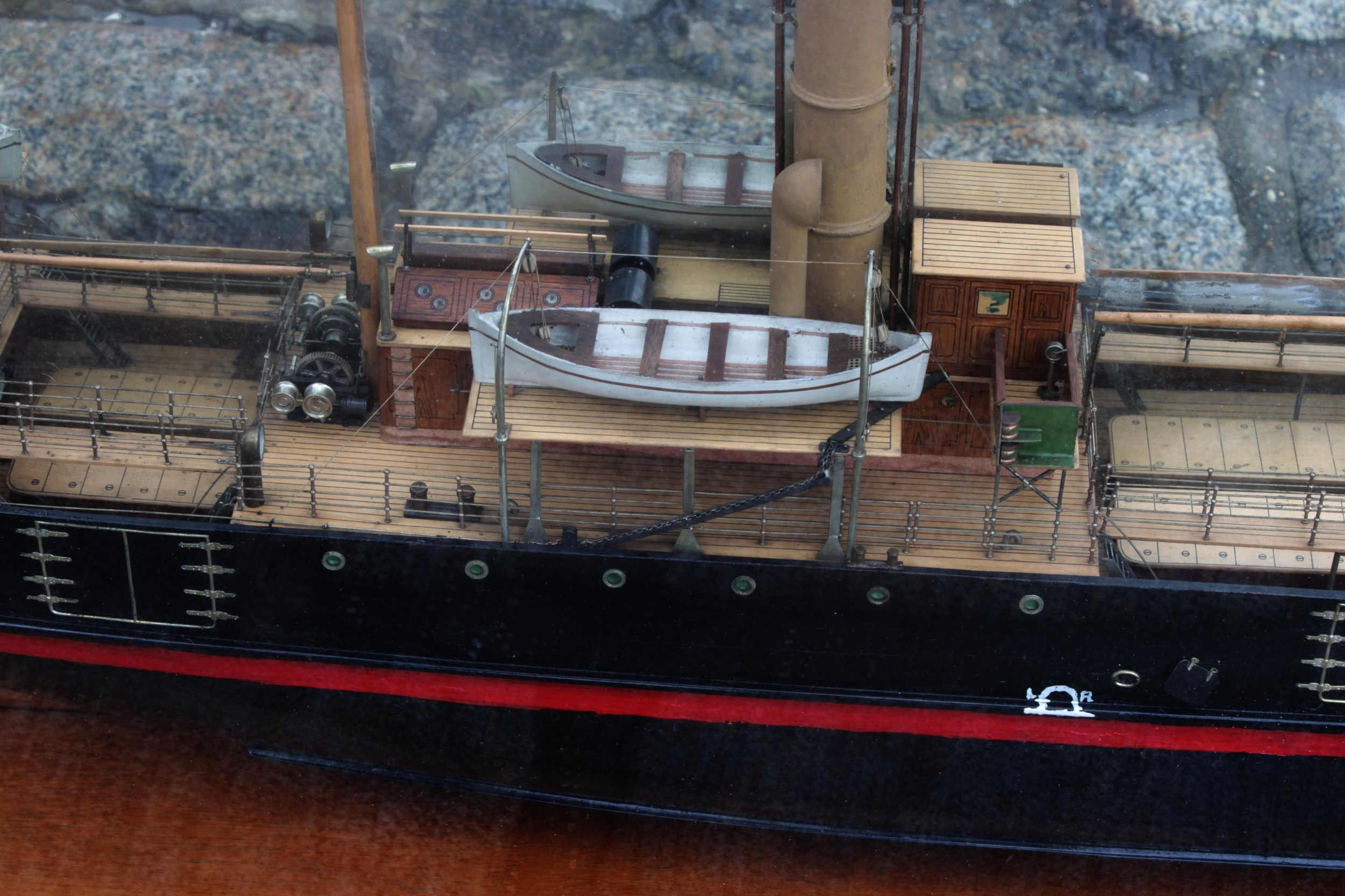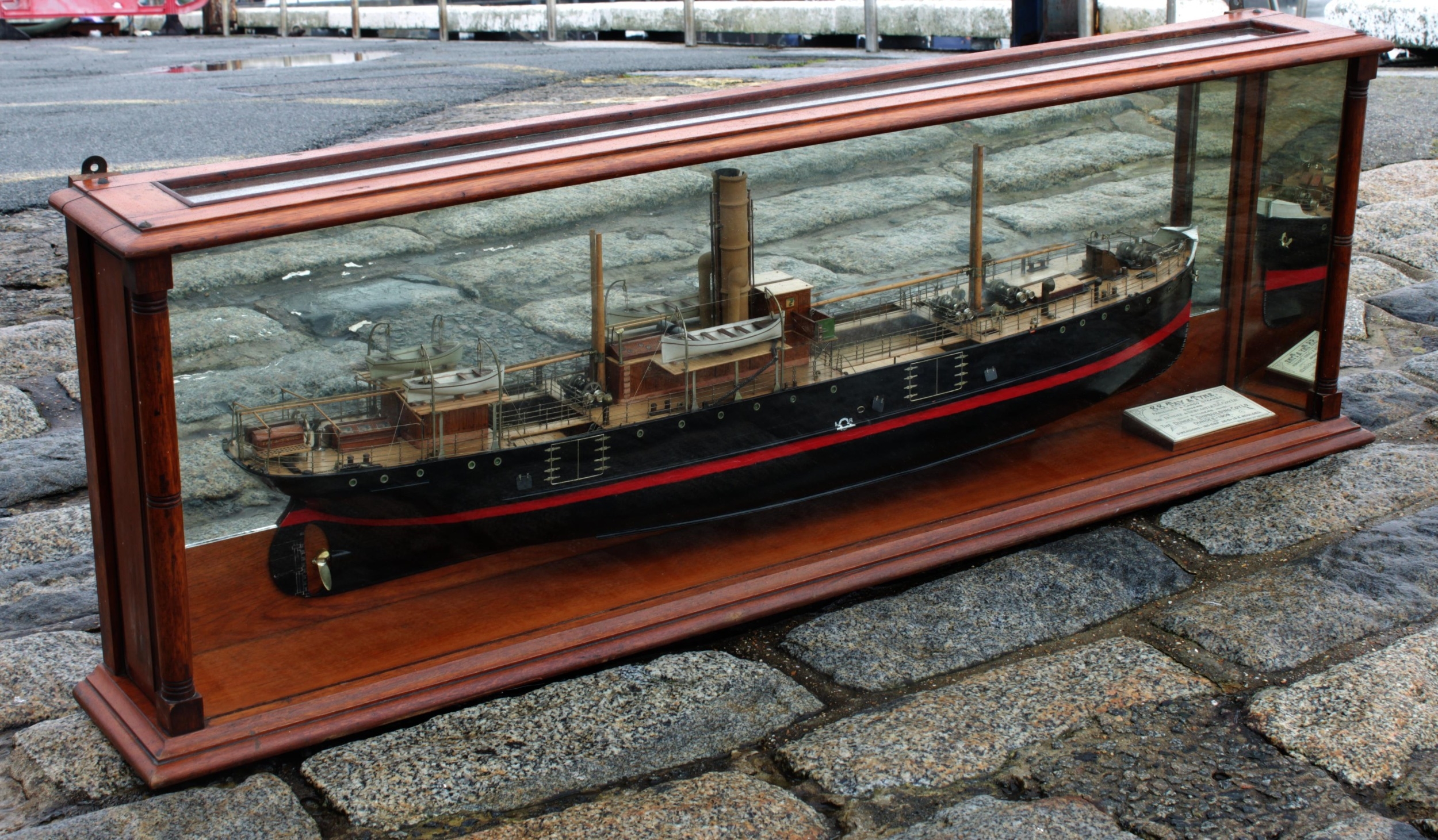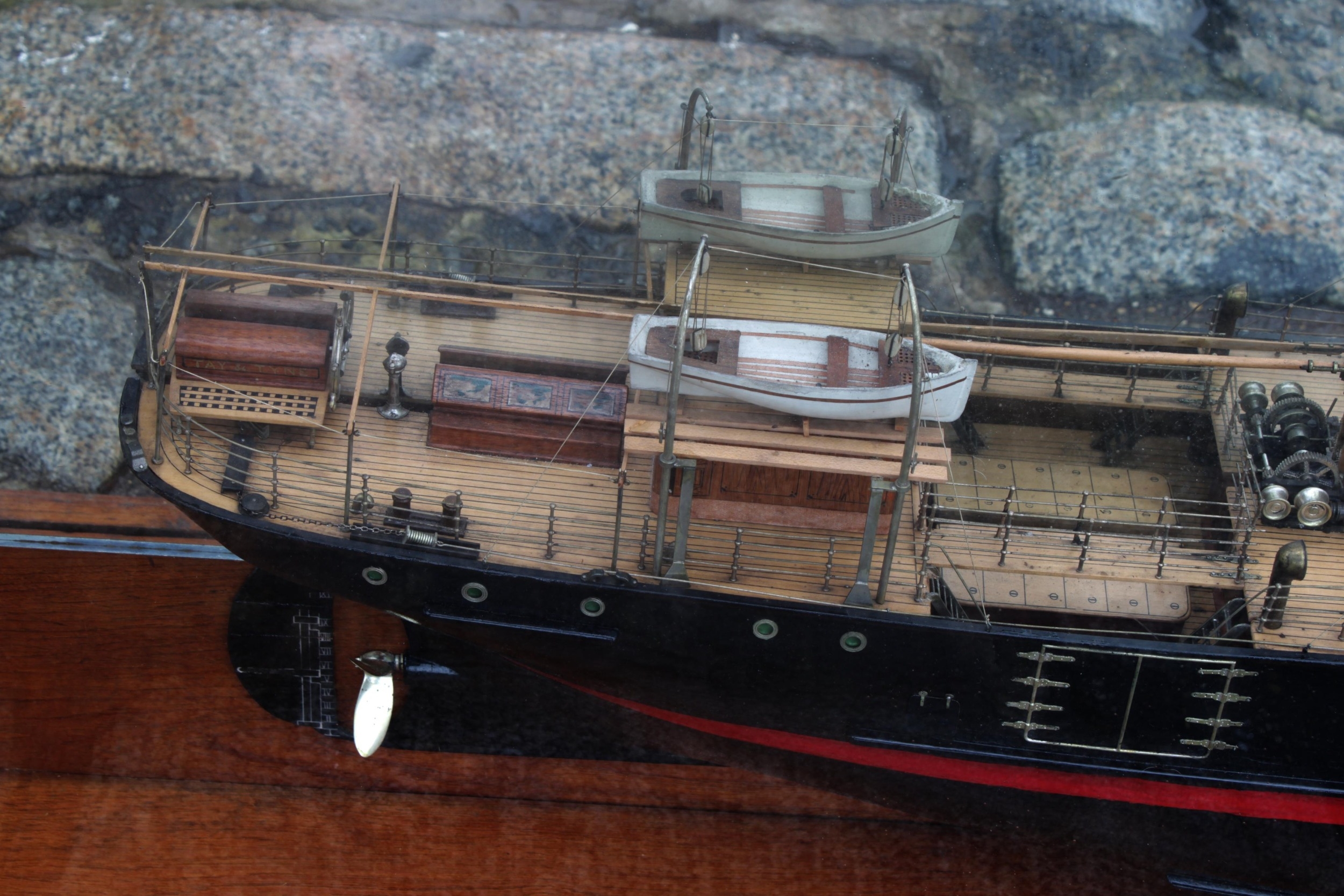 An early 20th century half model of the passenger and cargo steamer S.S. Tay & Tyne, made by the Neptune Model Works, Sunderland, 1909, inscribed on plaque "SS TAY & TYNE. Passenger & Cargo Steamer. Owners The Dundee & Newcastle S.S. Coy. Ld. Builders. The Dundee Shipbuilding Coy. Ld. Dundee - 1909. Dimensions: 180 O.B.P. 26-0" x 13-3." Moulded. Neptune Model Wks Sunderland", mahogany case with turned front supports, mirrored back and sides, 152 x 21cm. x 49cm. high.