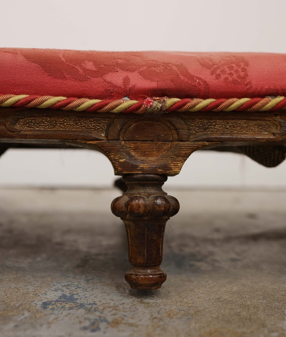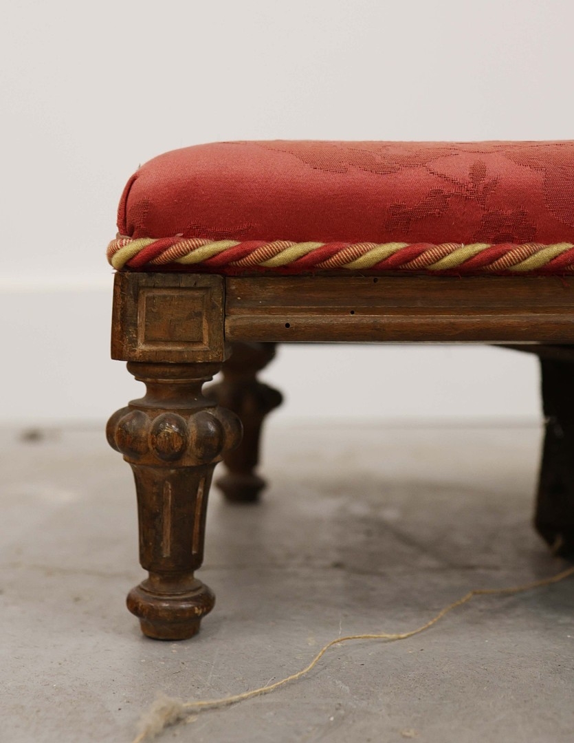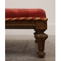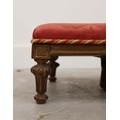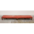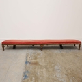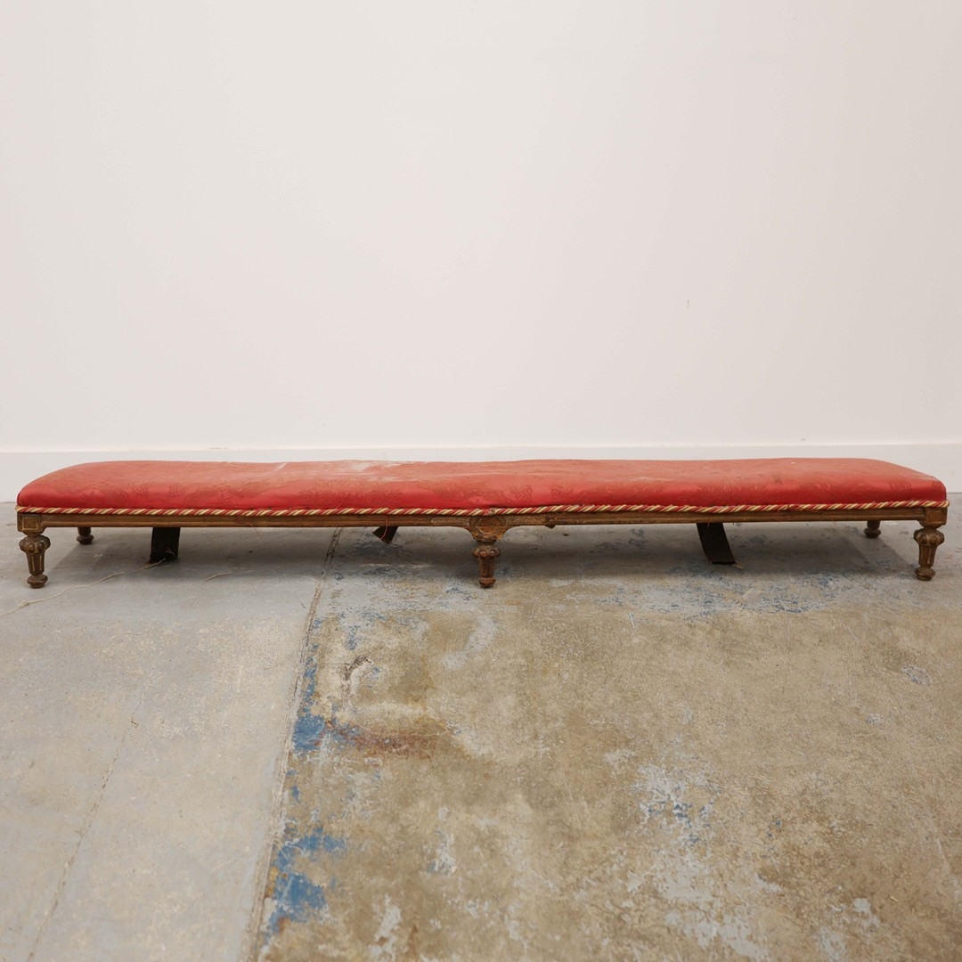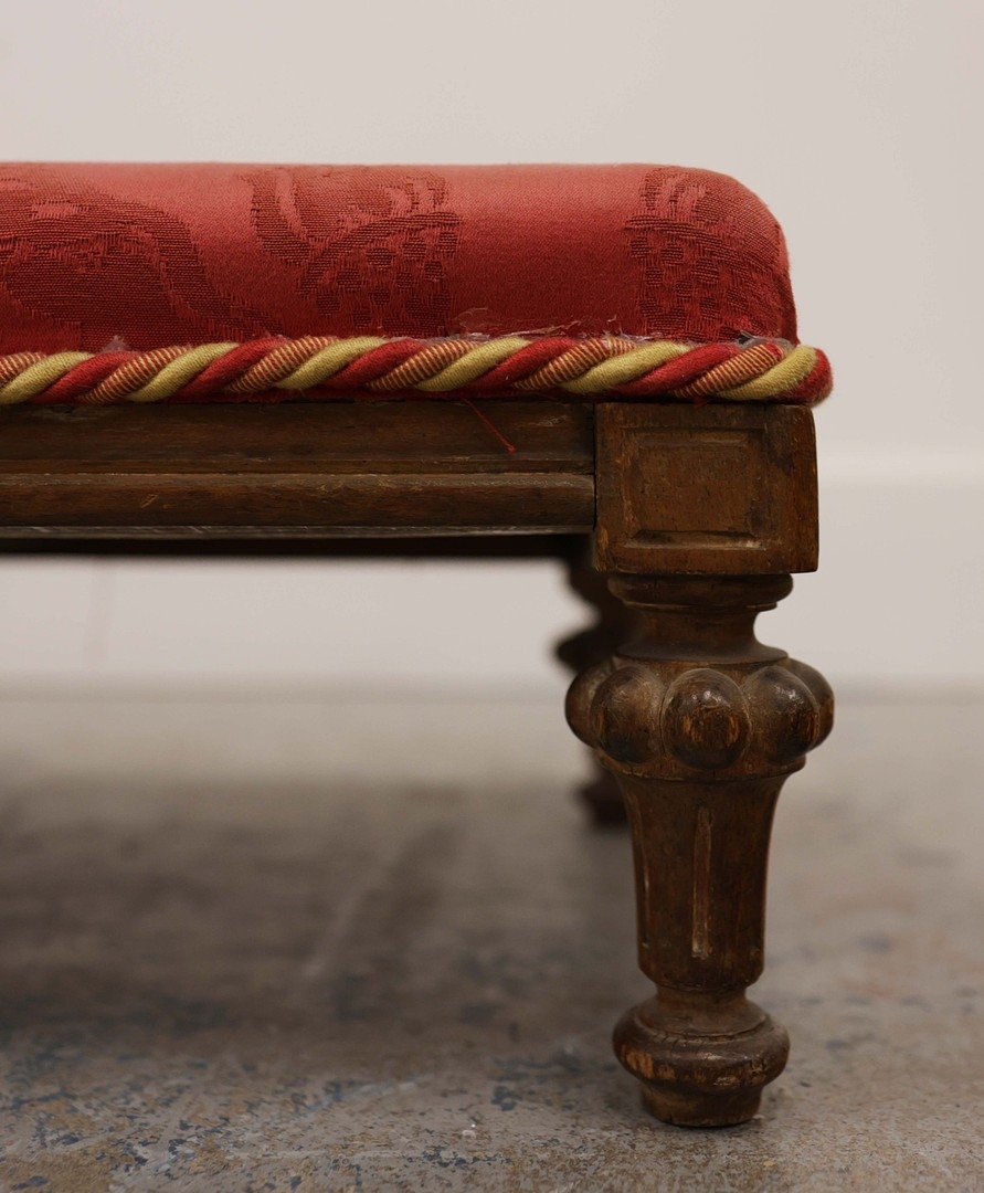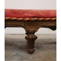 19TH CENTURY FRENCH BEECHWOOD HEARTH STOOL. long and low in crimson damask with six decoratively carved supports 163cm l x 29cm d x 163cm l.