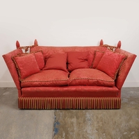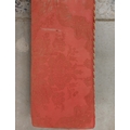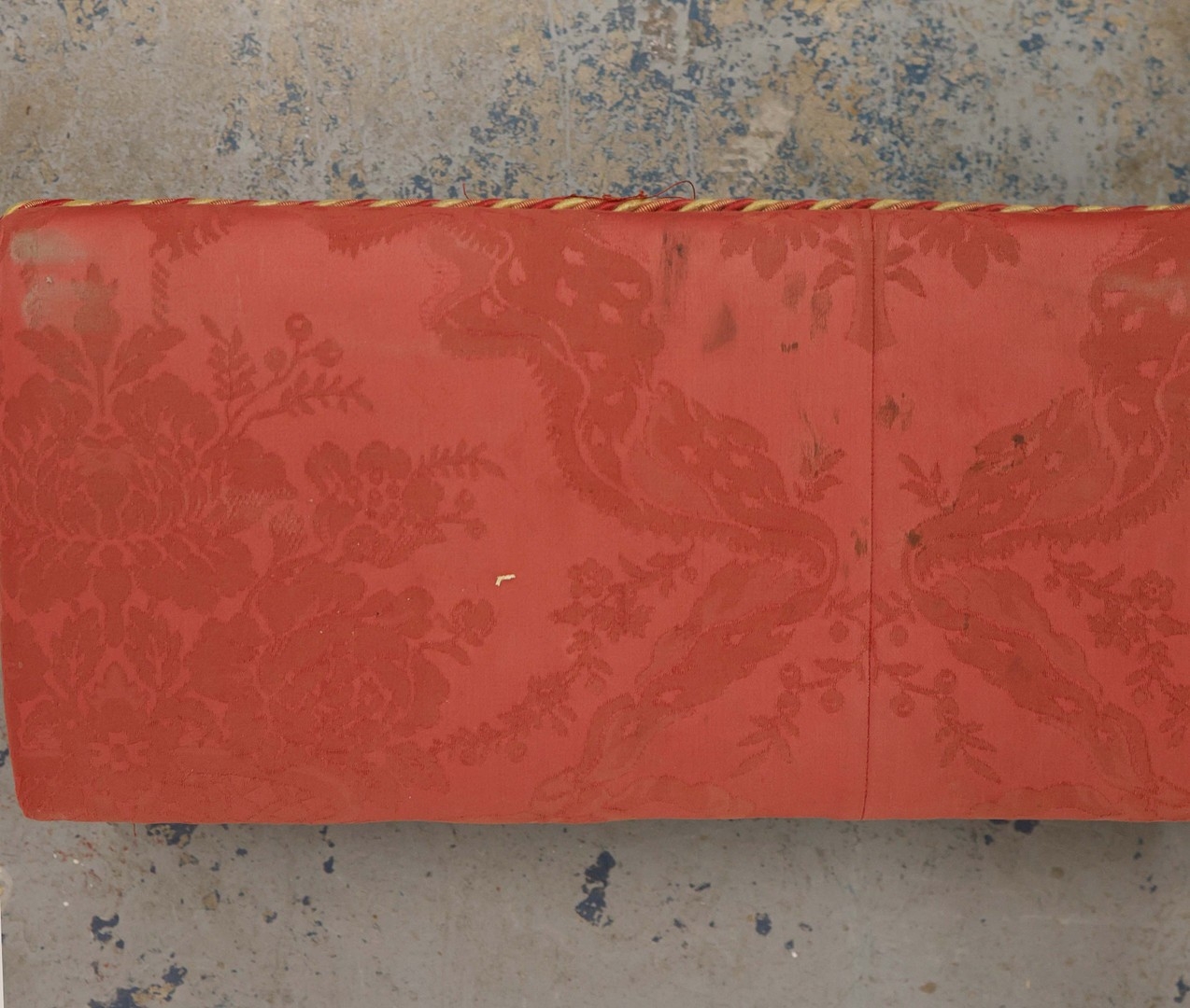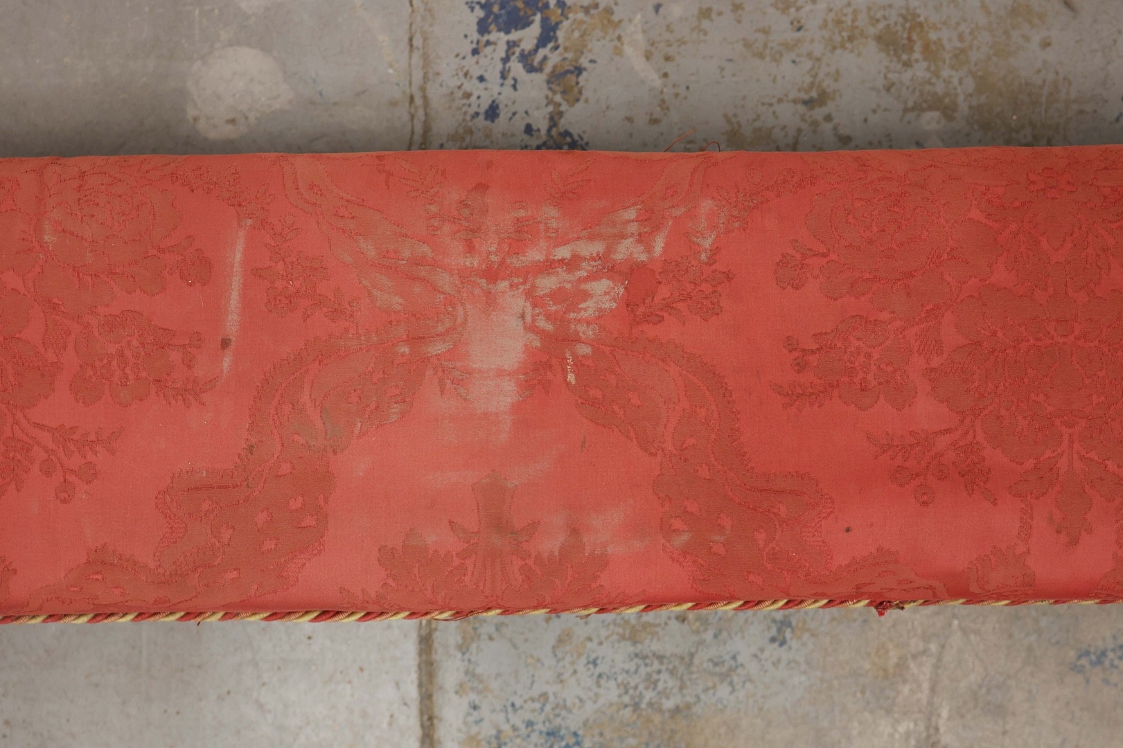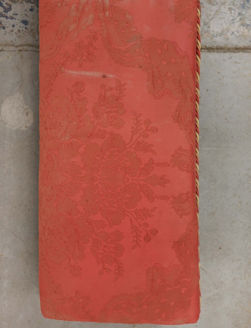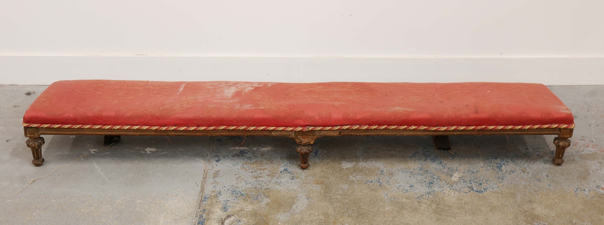 19TH CENTURY FRENCH BEECHWOOD HEARTH STOOL. long and low in crimson damask with six decoratively carved supports 163cm l x 29cm d x 163cm l.