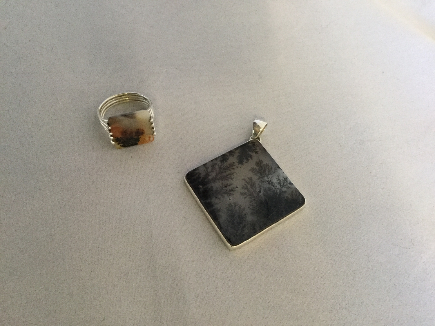 A silver mounted dendritic agate pendant,together with a similar ring (2) -
