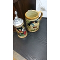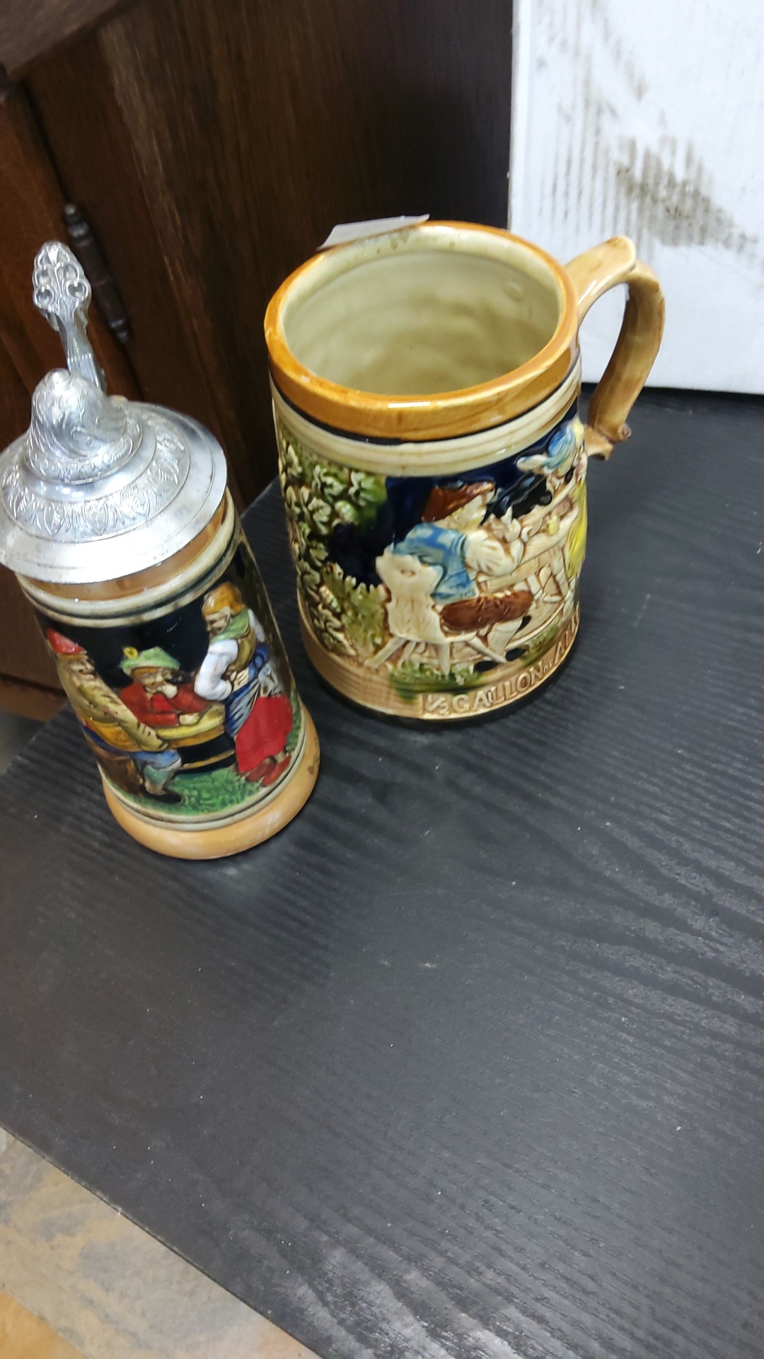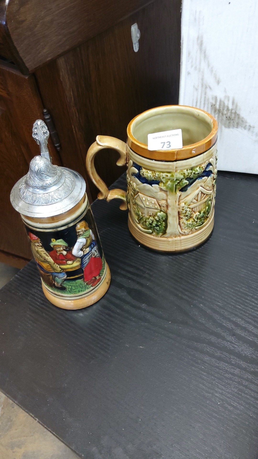 Two German moulded pottery beer steins, one open, one with hinged pewter lid, each with polychrome relief tavern and village scenes, early–mid 20th century.