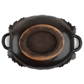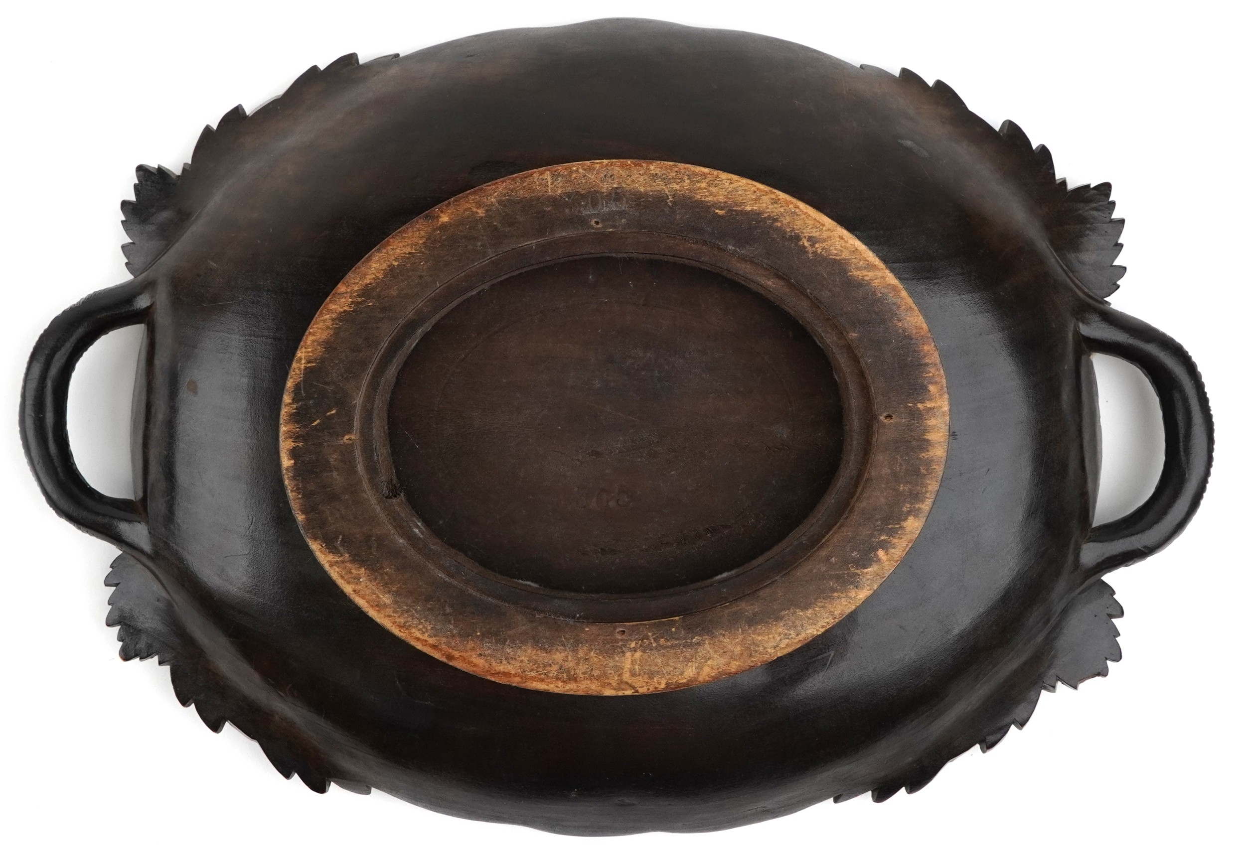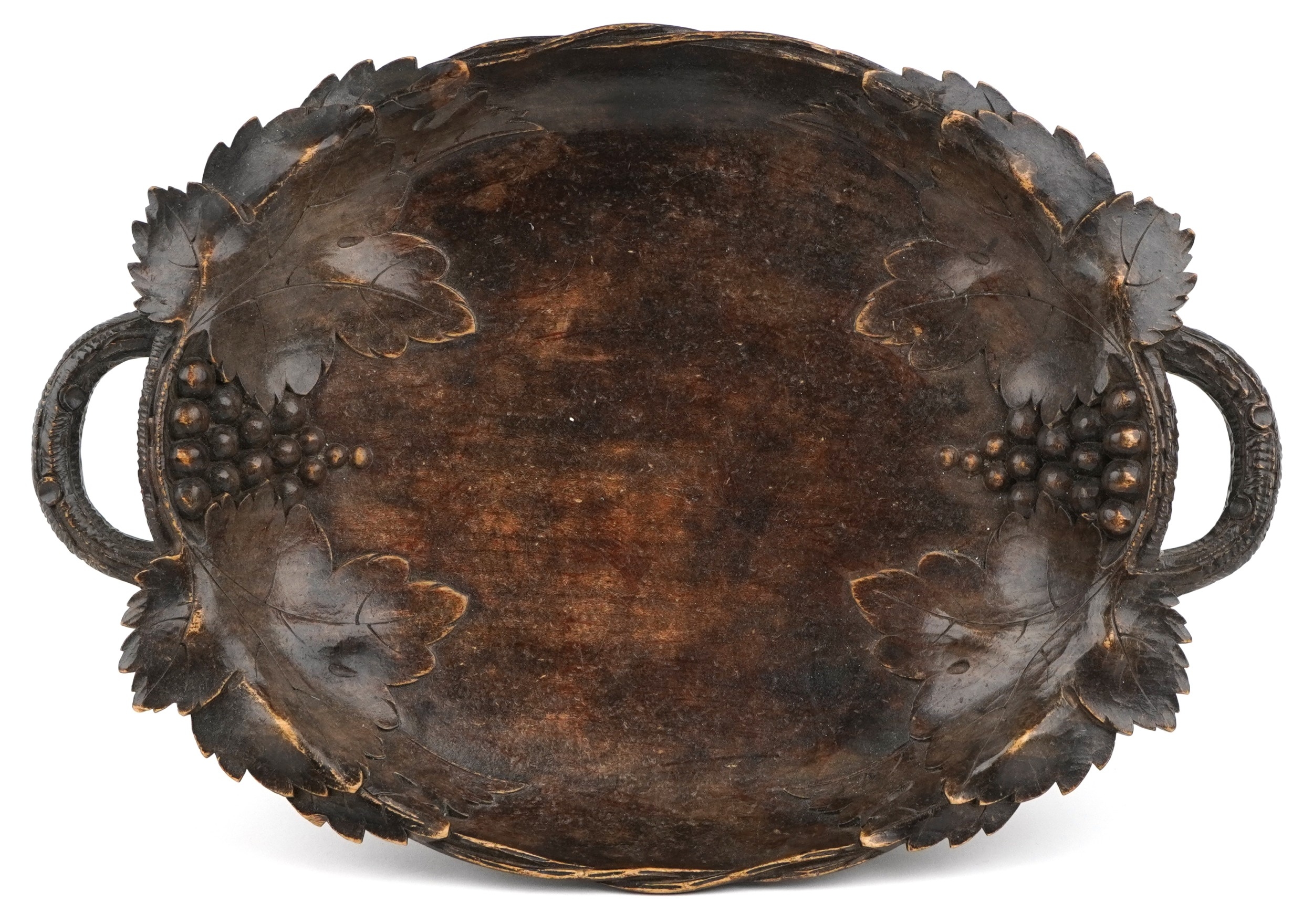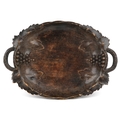 An early 20th century beech oval centrepiece bowl carved with leaves, with pierced handles, 9cm high x 39cm wide.
