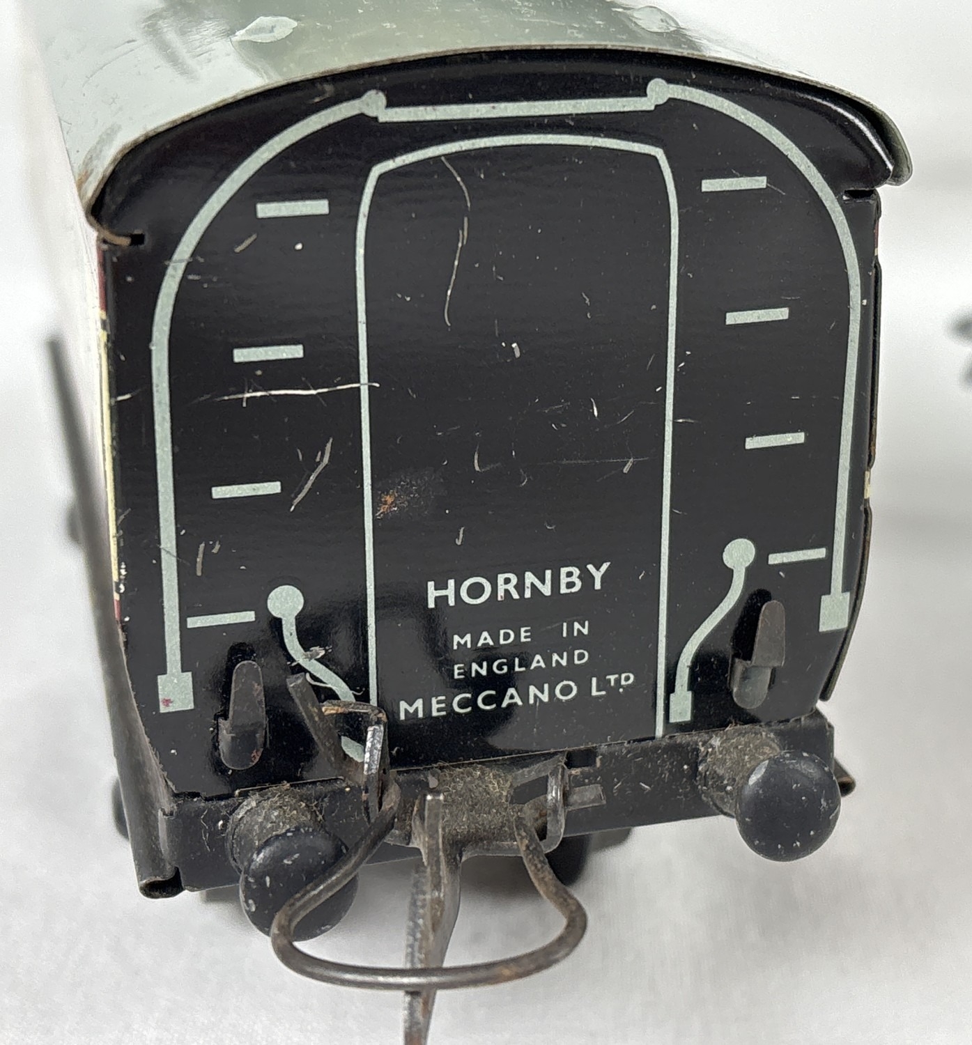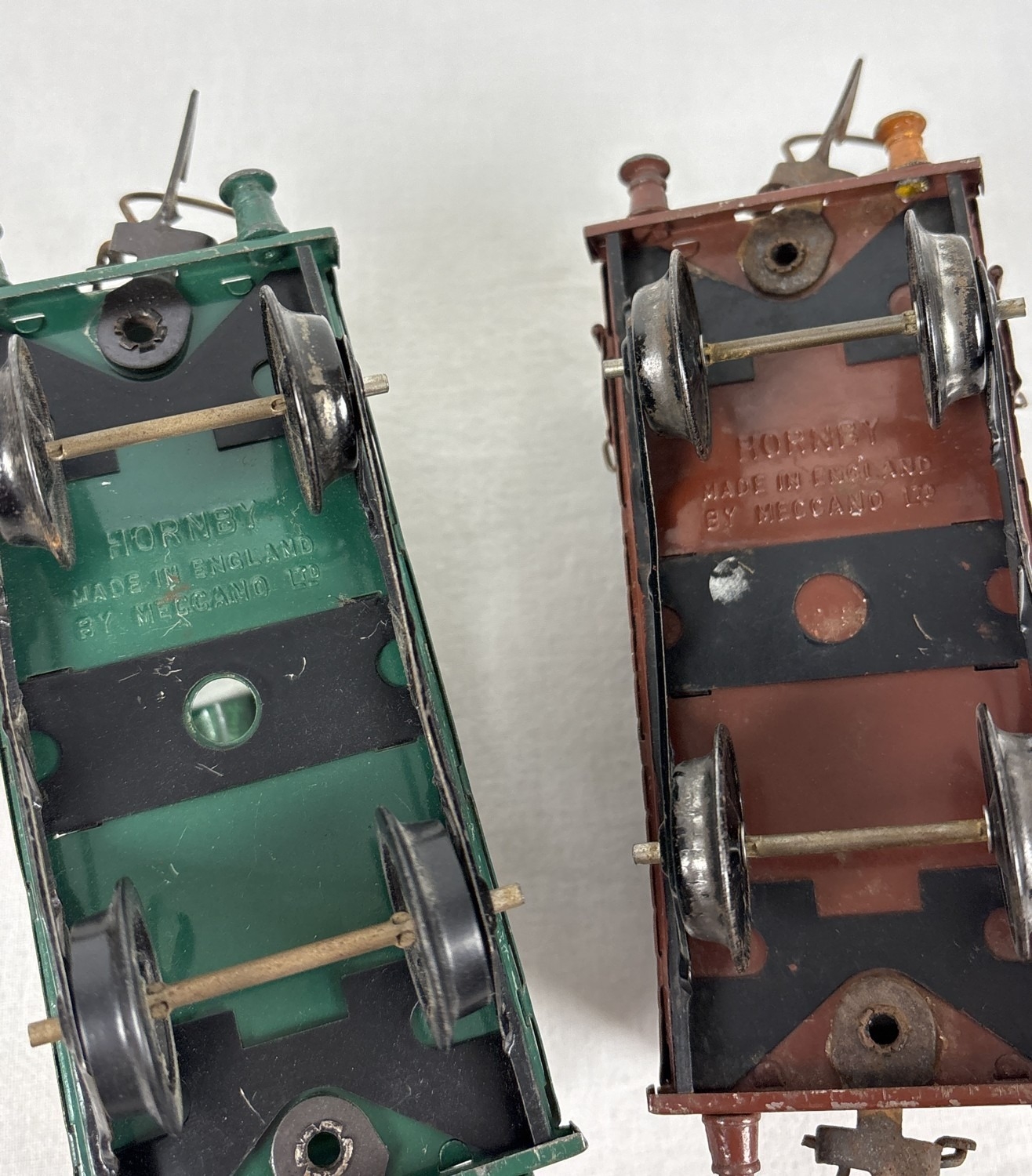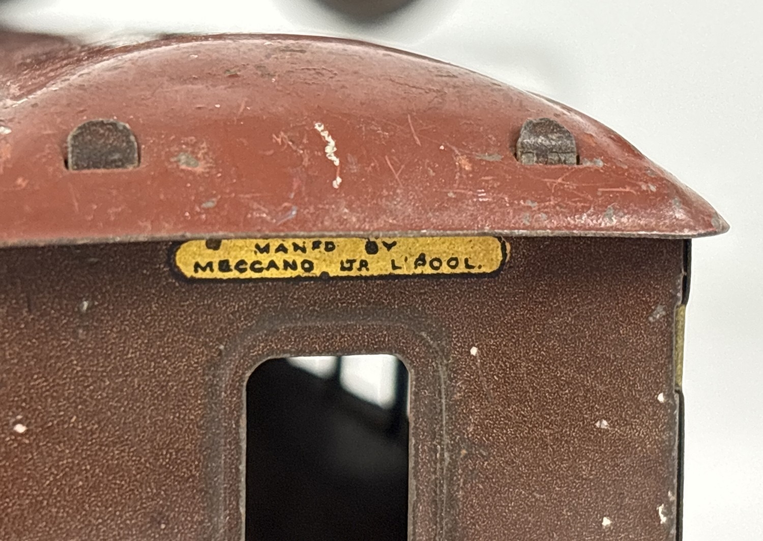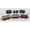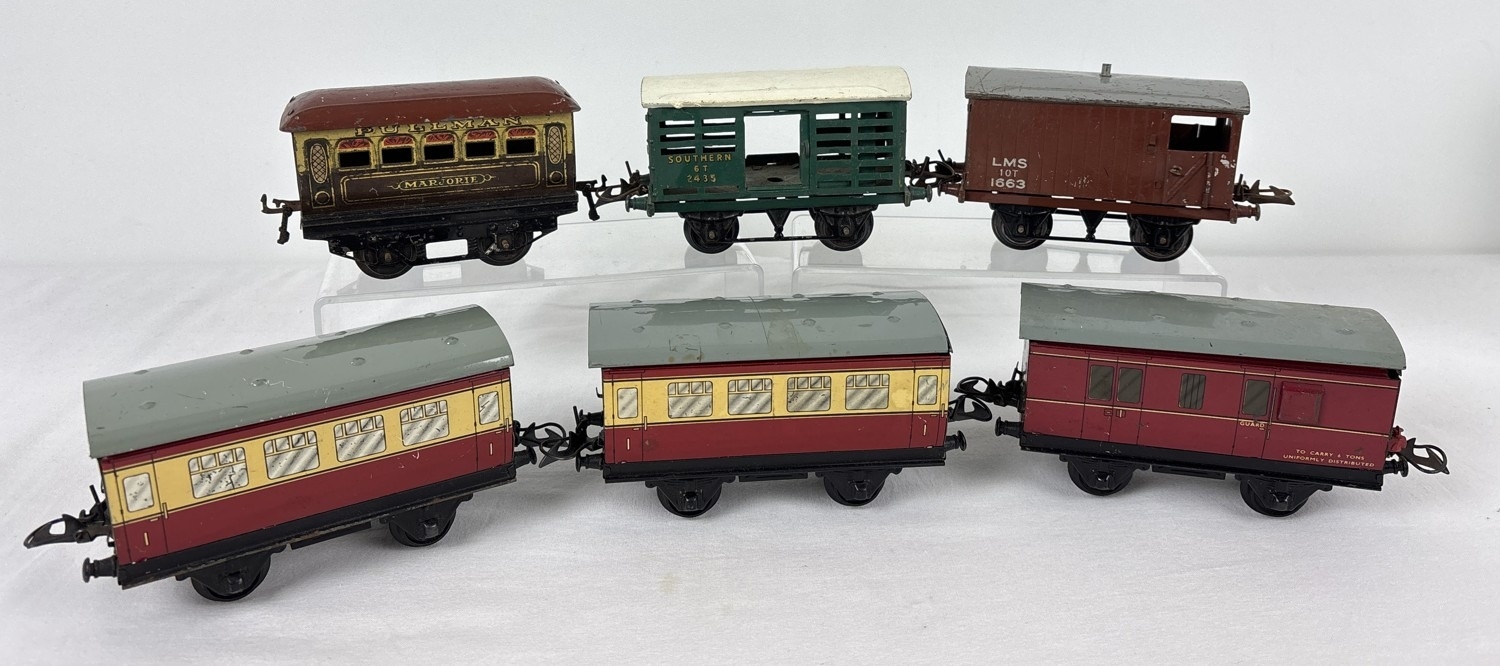 6 assorted vintage Hornby/Meccano O gauge model railway coaches. To include Brake end passenger coach, 1st class coaches, Pullman coach 'Marjorie' and LMS Goods Brake van.
