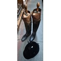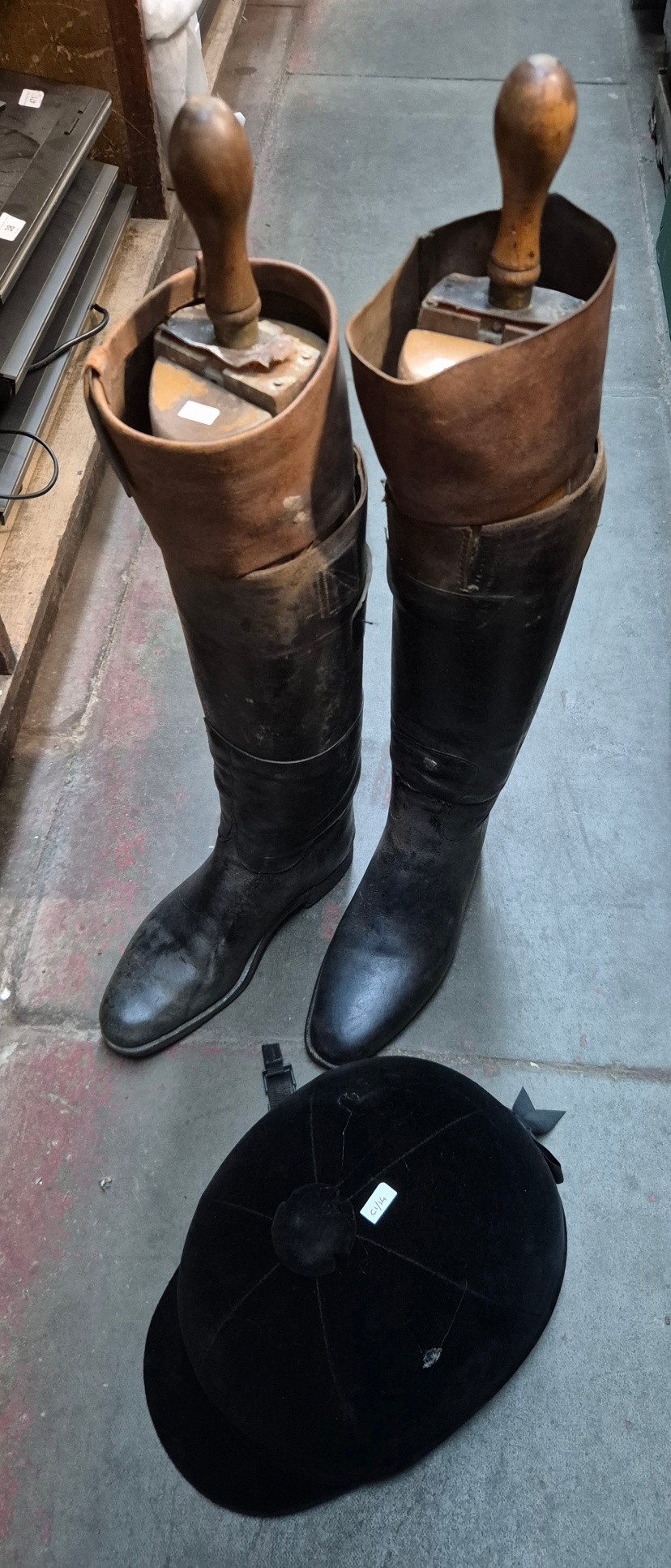 A pair of old leather top boots with wooden trees, and a Charles Owen gents riding hat size 7 3/8