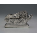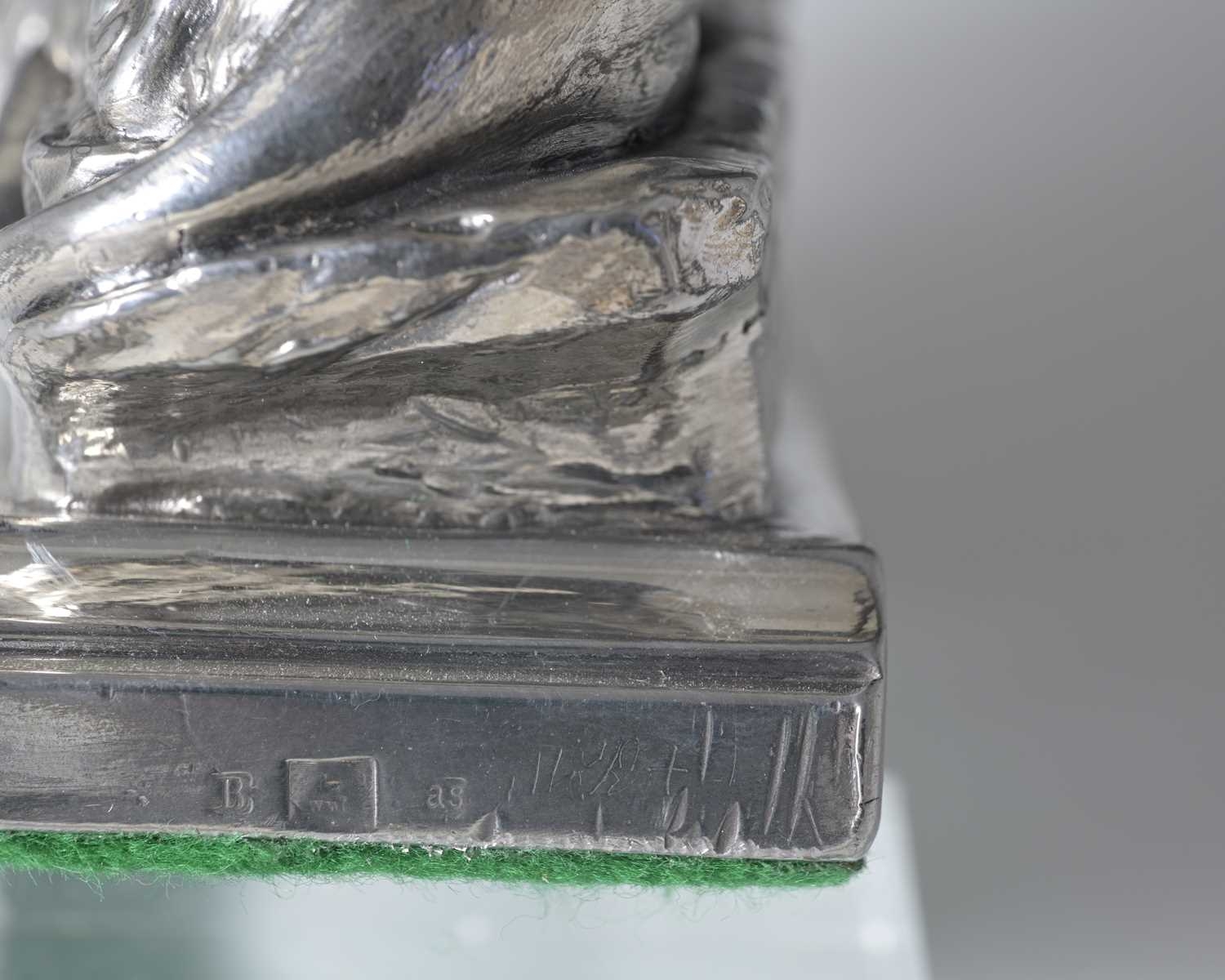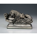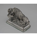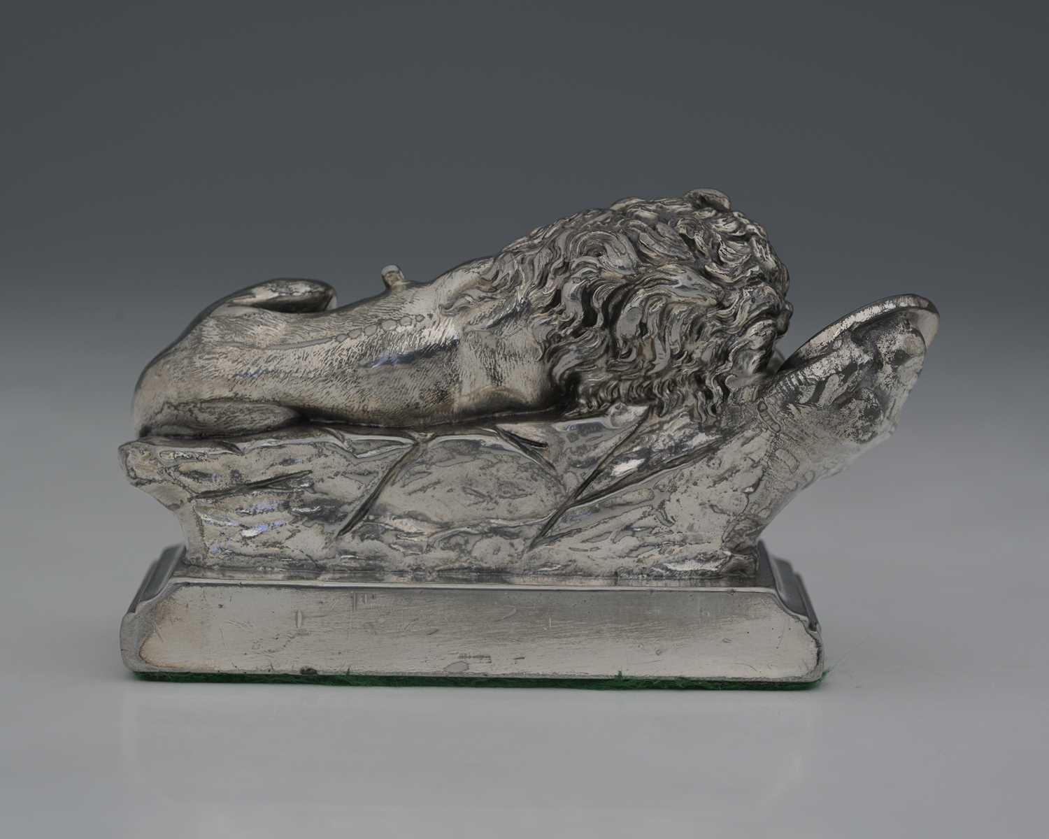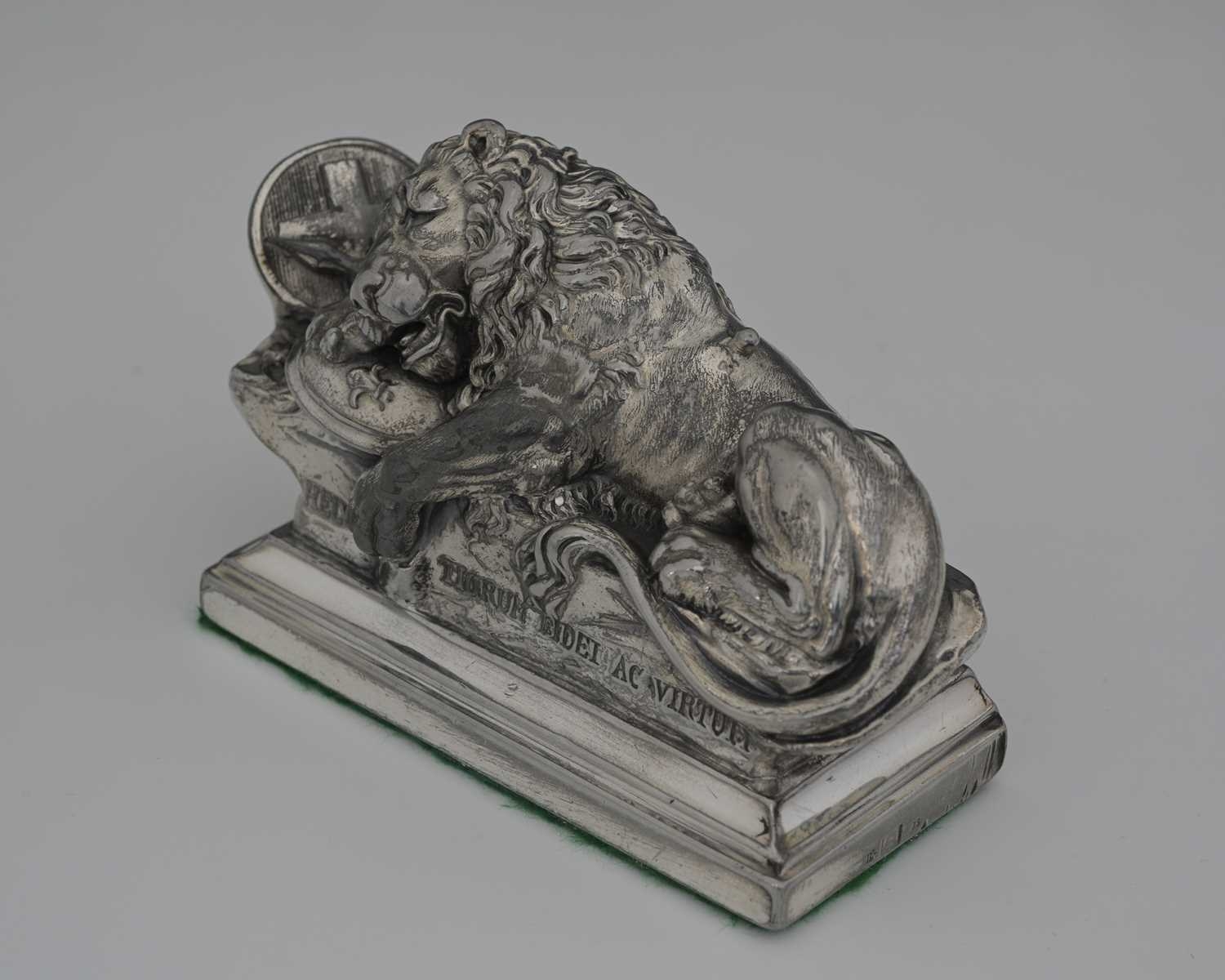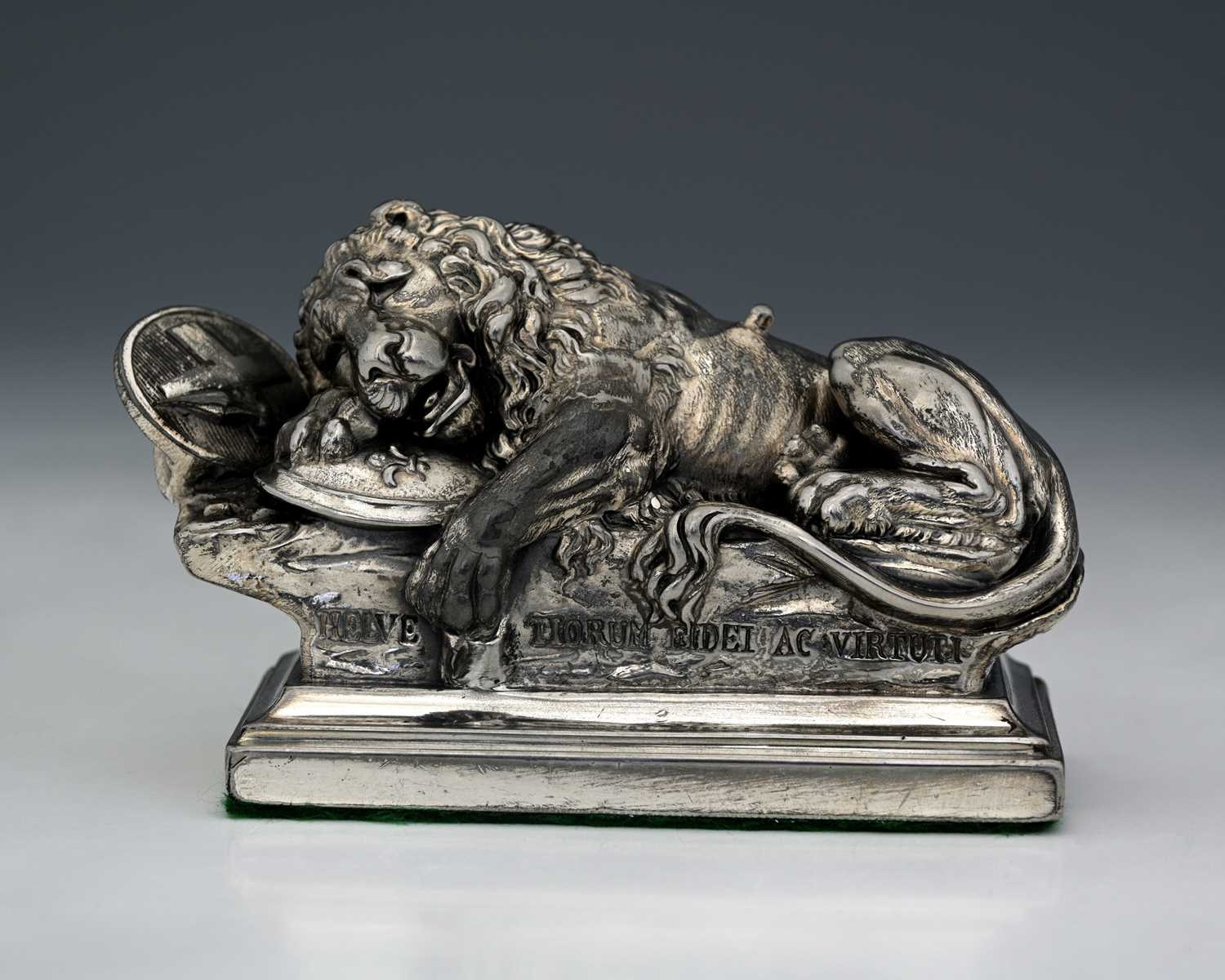 WMF, a twentieth-century model of the 'Lion Monument', with dedication "Helvetiorum Fidei ac Virtuti" (To the loyalty and bravery of the Swiss), atop a rectangular weighted base with baize lining, length 12cm approx Note: The Lion Monument, or the Lion of Lucerne, is a rock relief in Lucerne, Switzerland, designed by Bertel Thorvaldsen and hewn in 182021 by Lukas Ahorn. It commemorates the Swiss Guards who were killed in 1792 during the French Revolution, when revolutionaries stormed the Tuileries Palace in Paris.