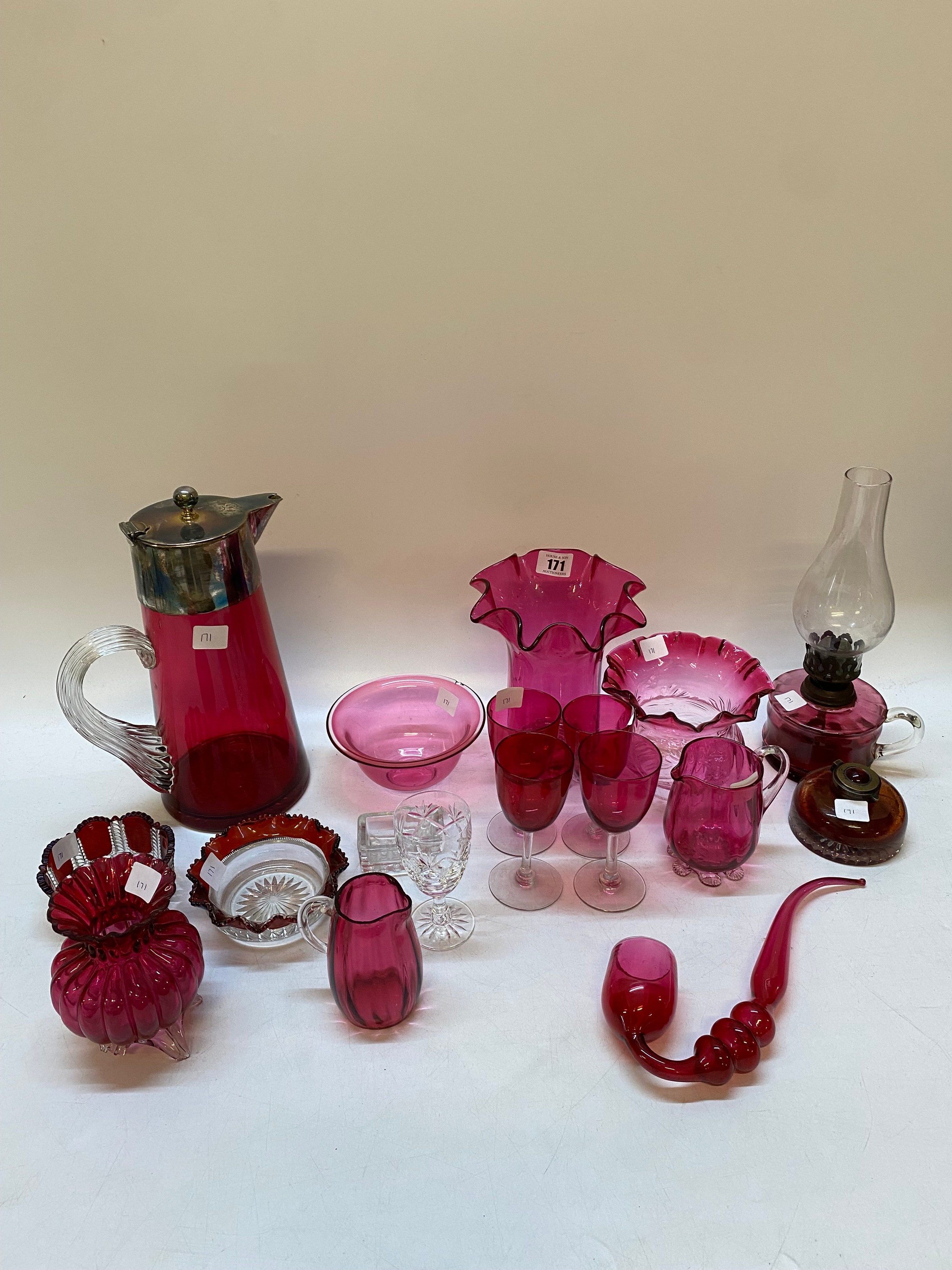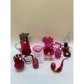 Cranberry glass comprising:- iced water jug with silver plated mounts, oil lamp, vases, wines, pipe etc..