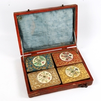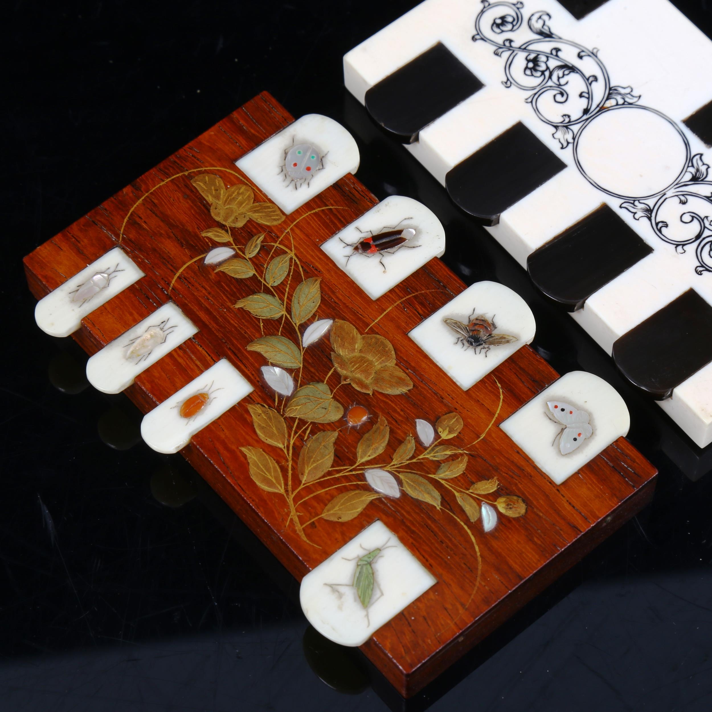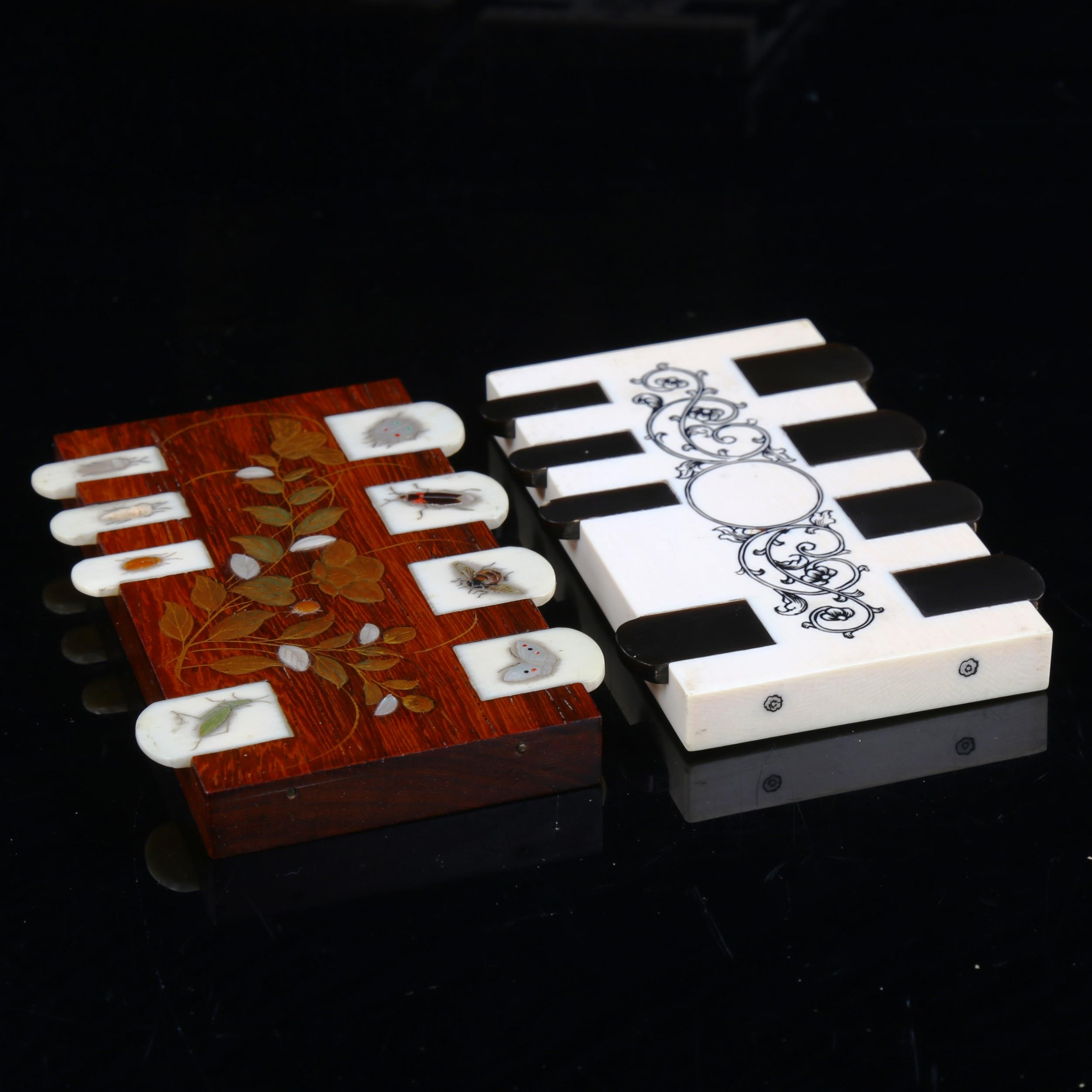 A Shibayama bezique counter, rosewood and ivory with inset hardstone insects, length 9cm, and an Art Deco ivory and black horn bezique marker (2)