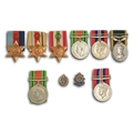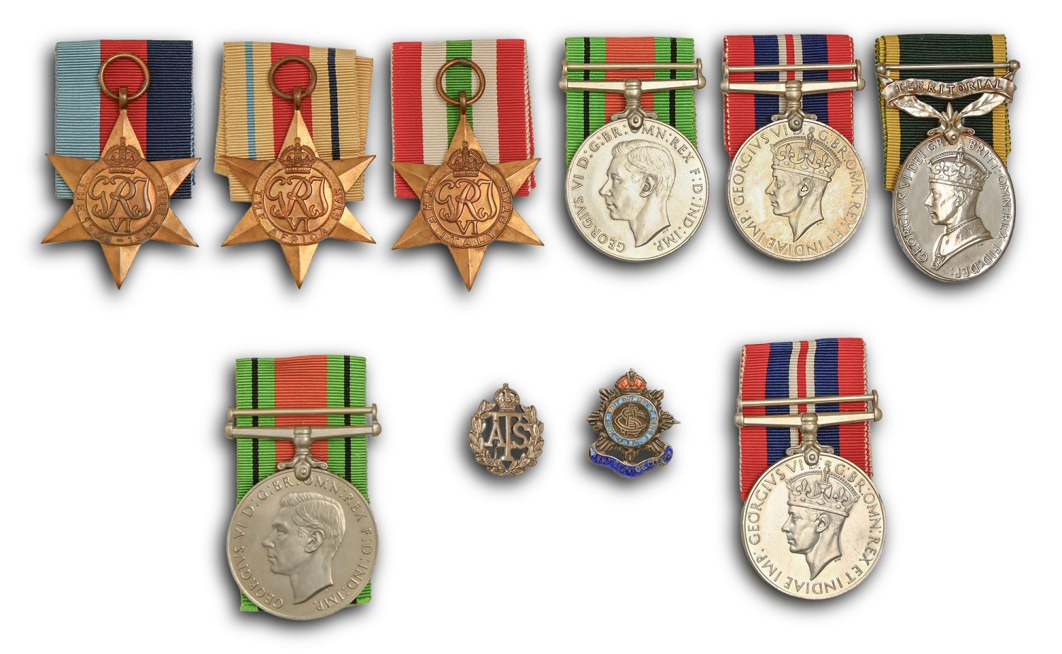WWII attributed group of six, 1939-1945 Star, Africa Star, Italy Star, Defence Medal, War Medal and Efficiency Medal, Territorial suspender, GVIR W13908 Sjt D Townsend (on clasp), silver A T S badge 23243, Army Service Corps silver and enamel badge, card, box and part registered envelope addressed Miss D Townsend, Chester and two other WWII medals