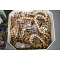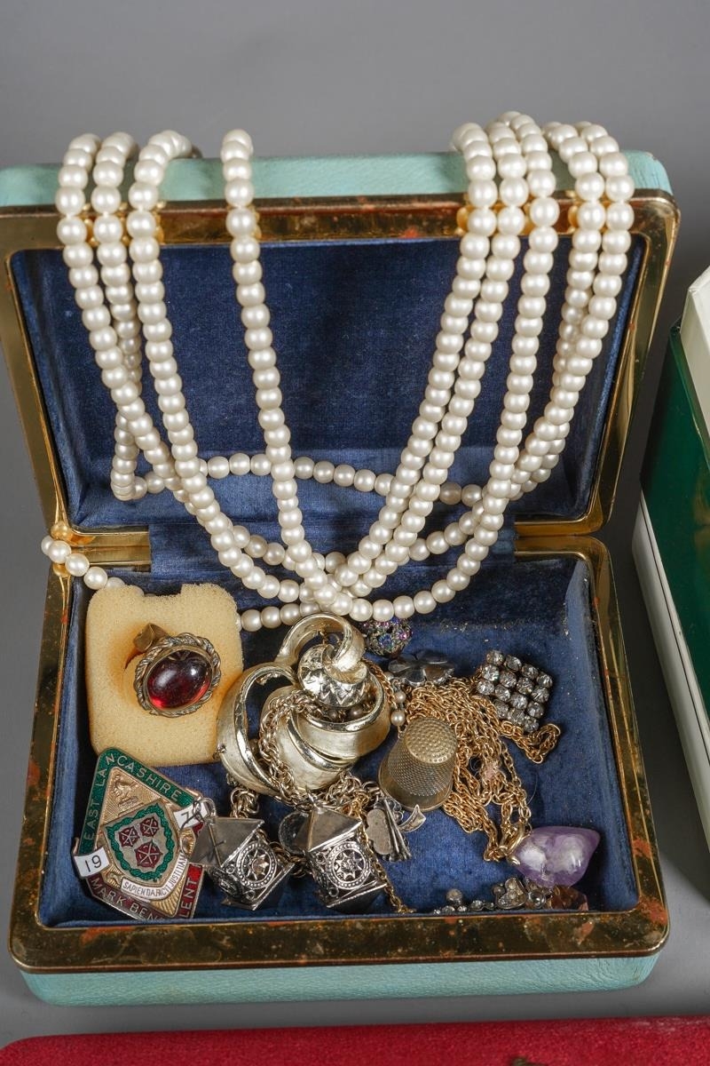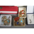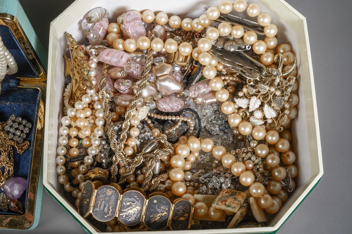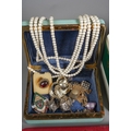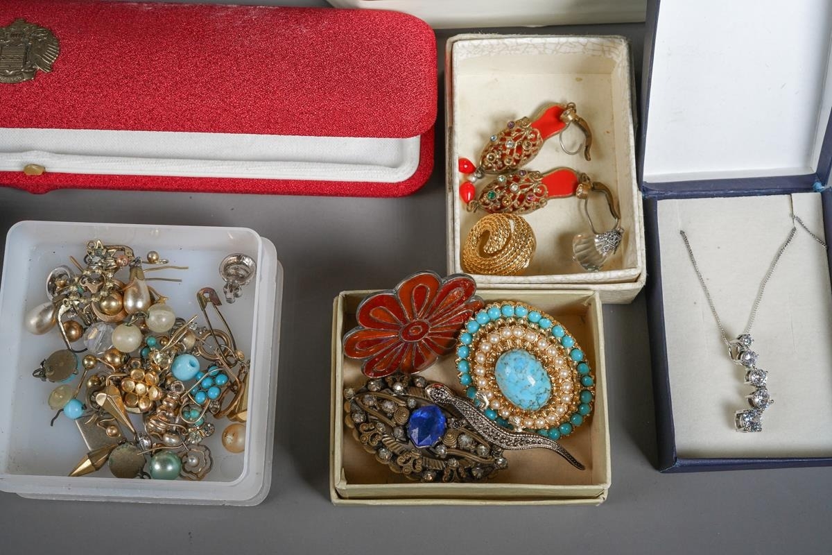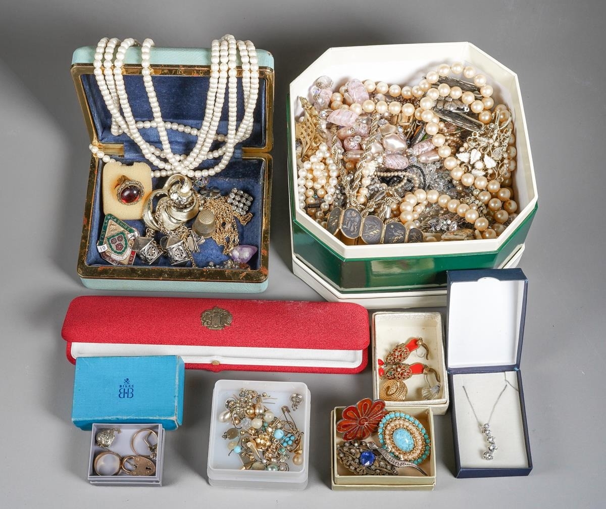 A quantity of vintage and modern costume jewellery, including a silver paste set nependant necklace, the chain stamped 925, a two section EPNS nurse's buckle, asoorted paste set brooches, bead necklaces, rolled gold items, etc (1 bag)