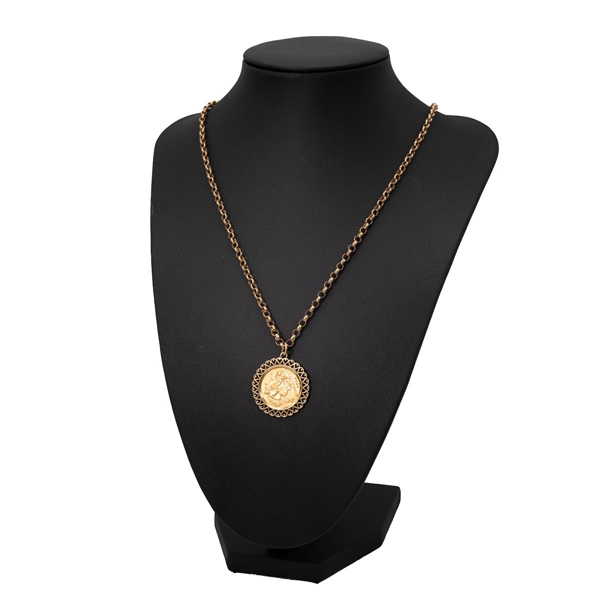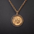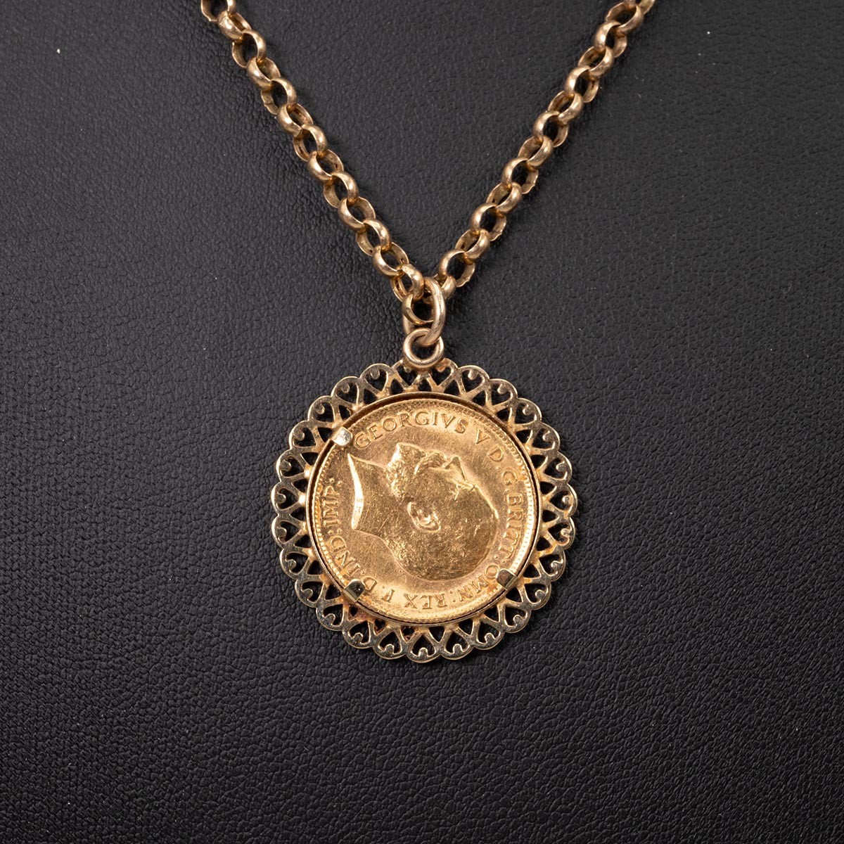 A 1914 George V half sovereign pendant on a 9ct gold 'O' link gold necklace, with lobster claw clasp, drop 27cm, gross weight 8.94 grams.
