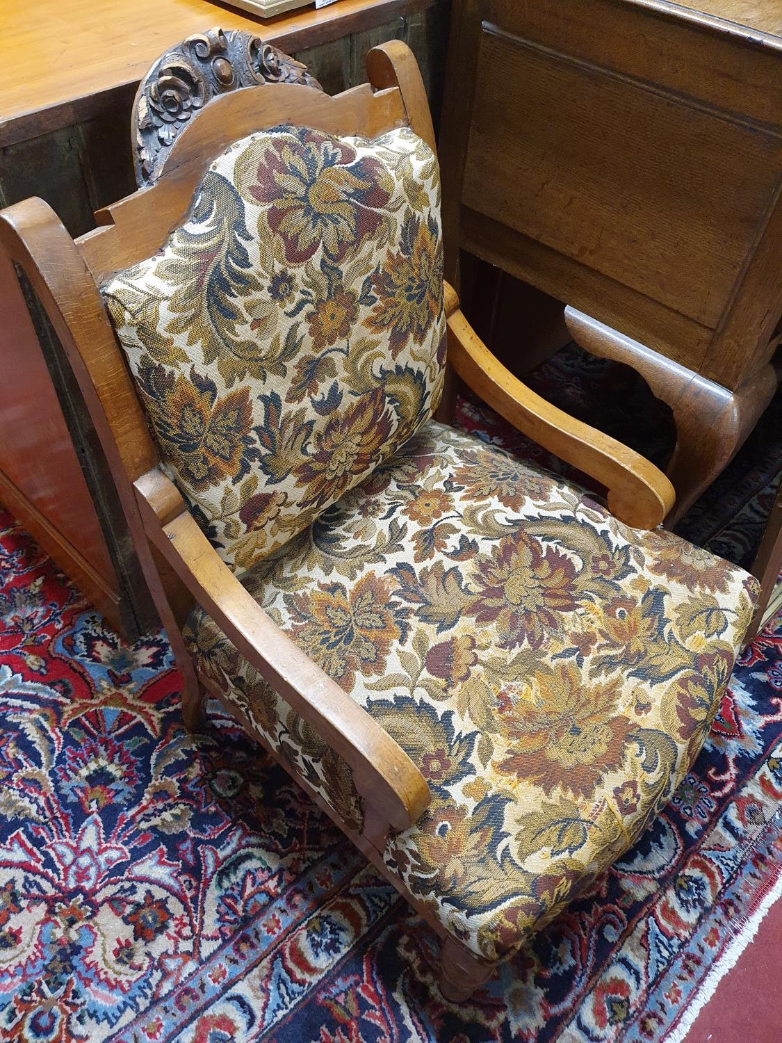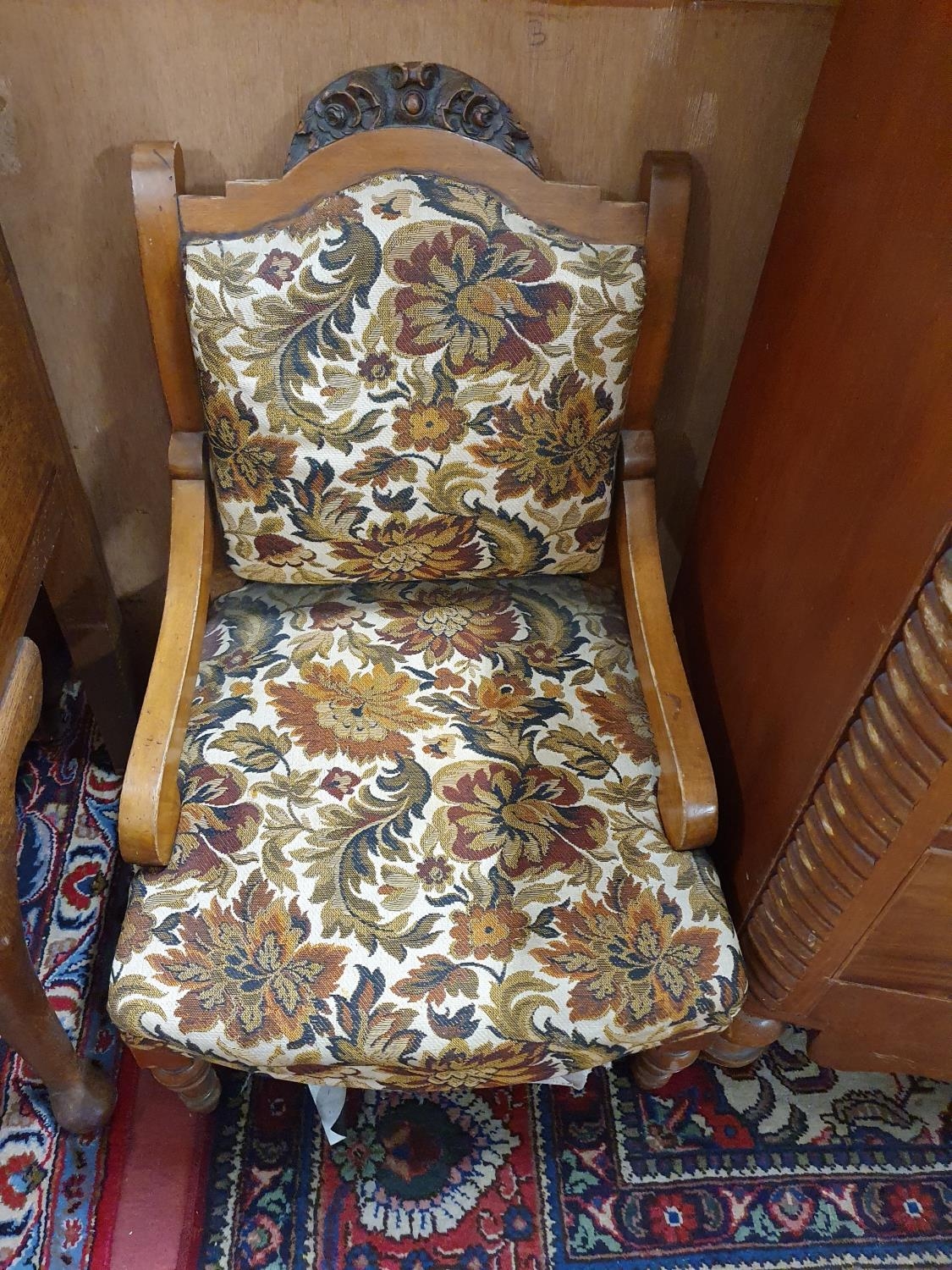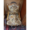 A good pair of 19th Century Walnut Bedroom Armchairs with floral tapestry style upholstery. H 36 cms approx.