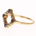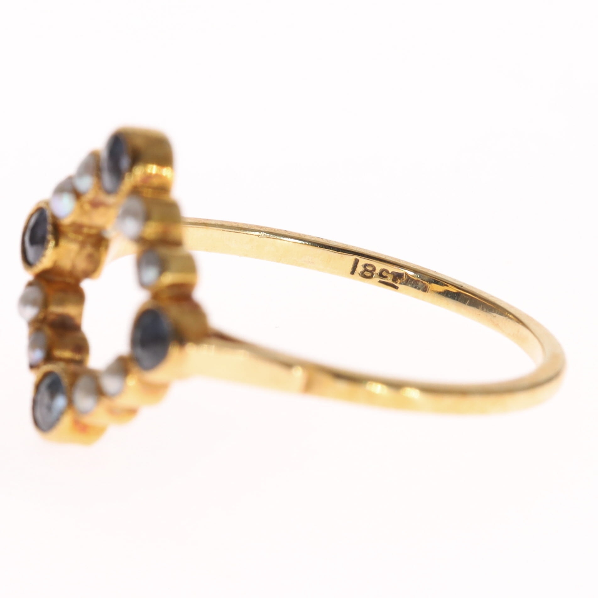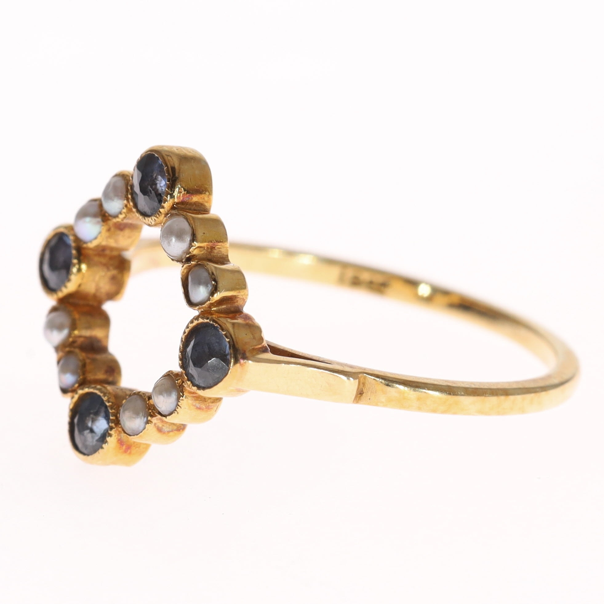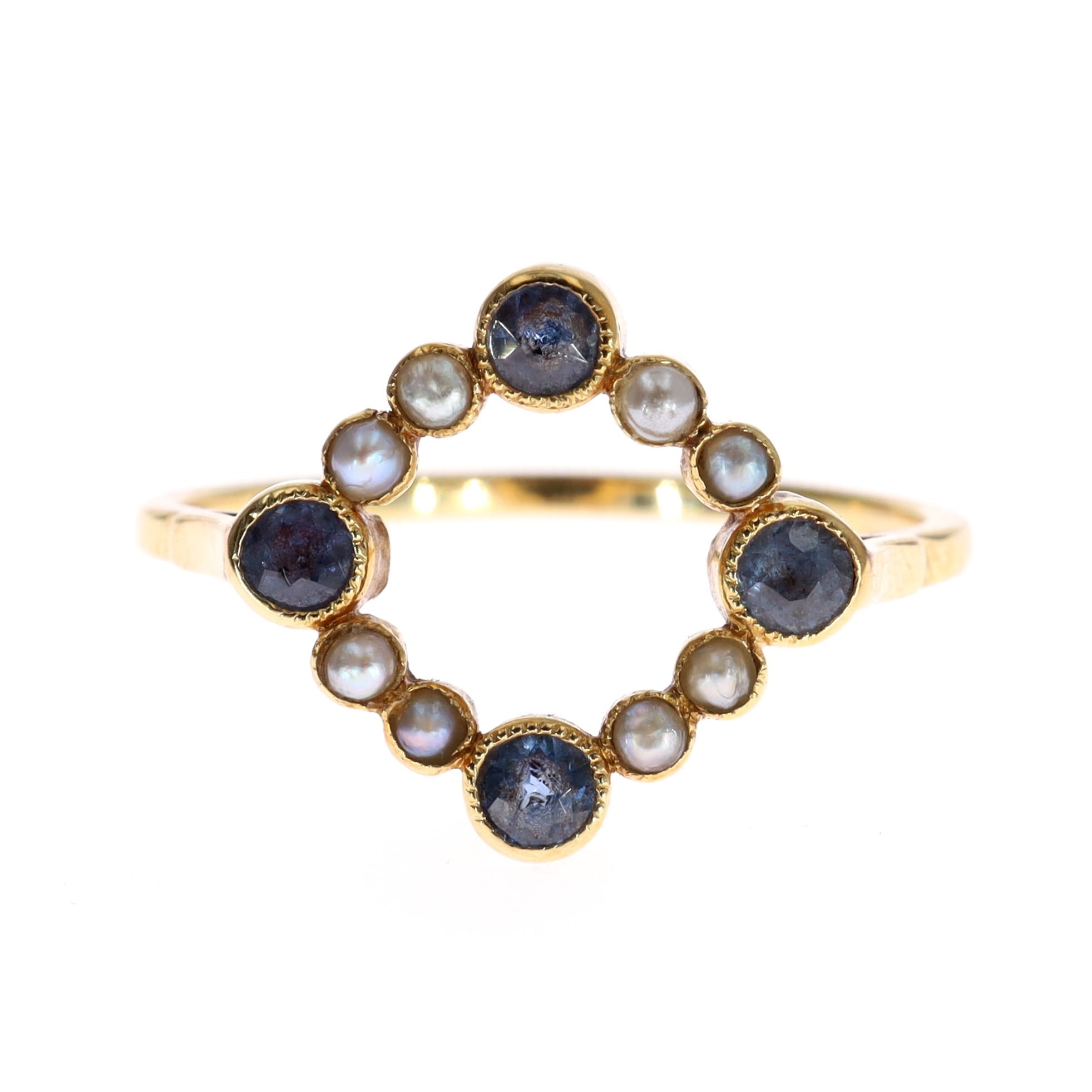Sapphire and Pearl 18ct Gold Ring. Stamped 18ct on the inner band. UK ring size R, weighs in total 2.3g.