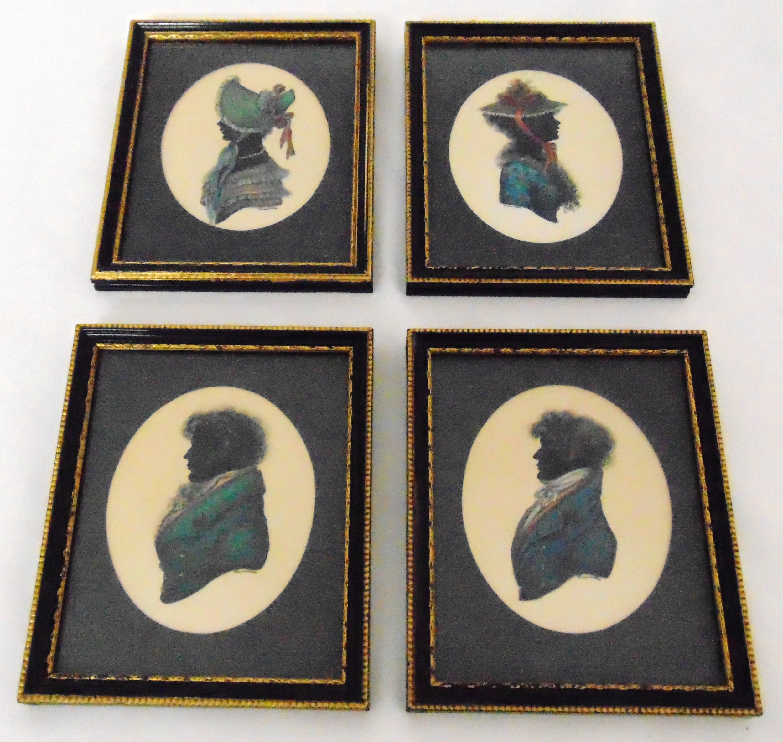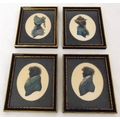 Four framed and glazed polychromatic silhouettes of ladies and gentlemen in 19th century dress, 9.5 x 7.5cm