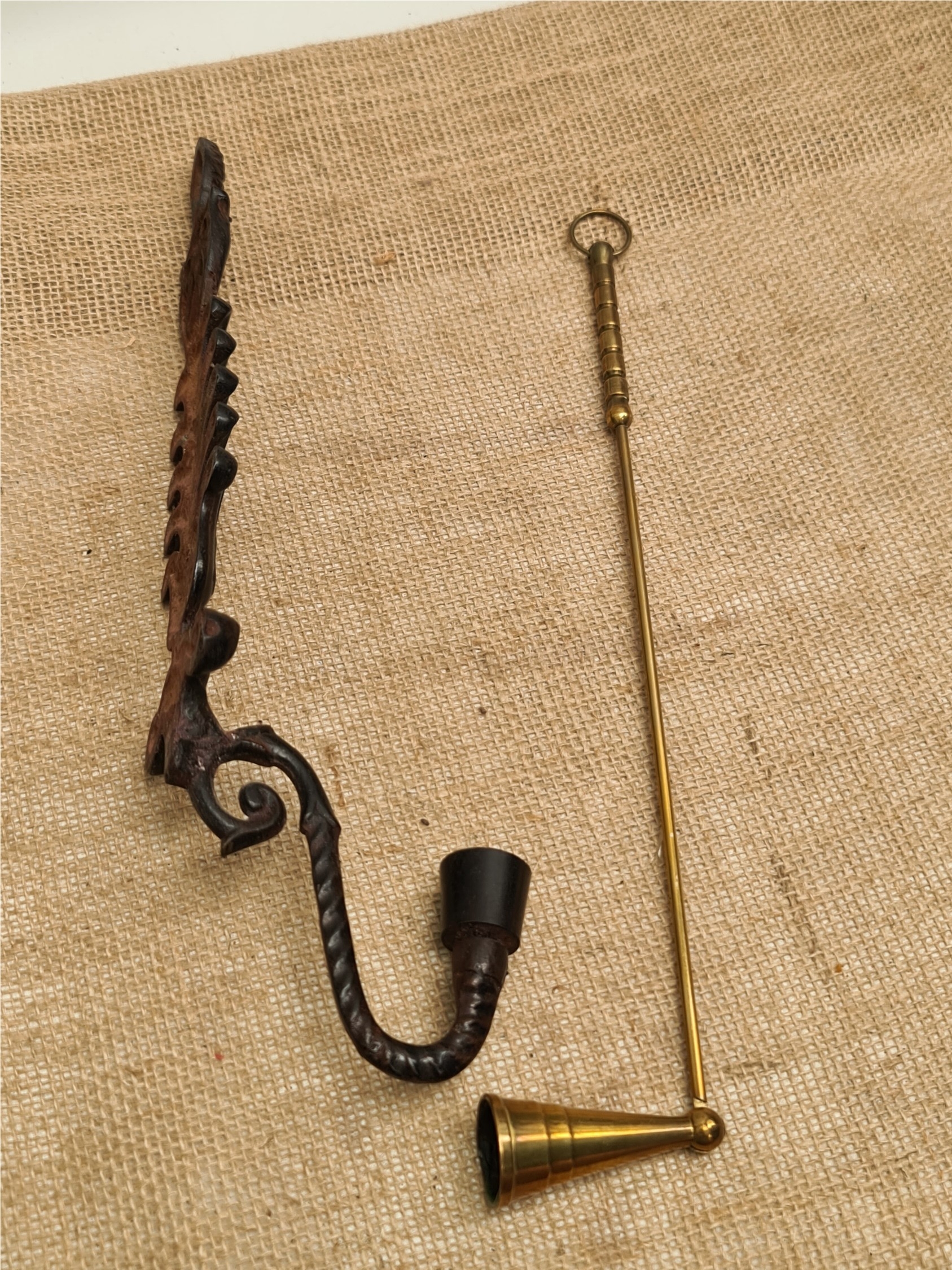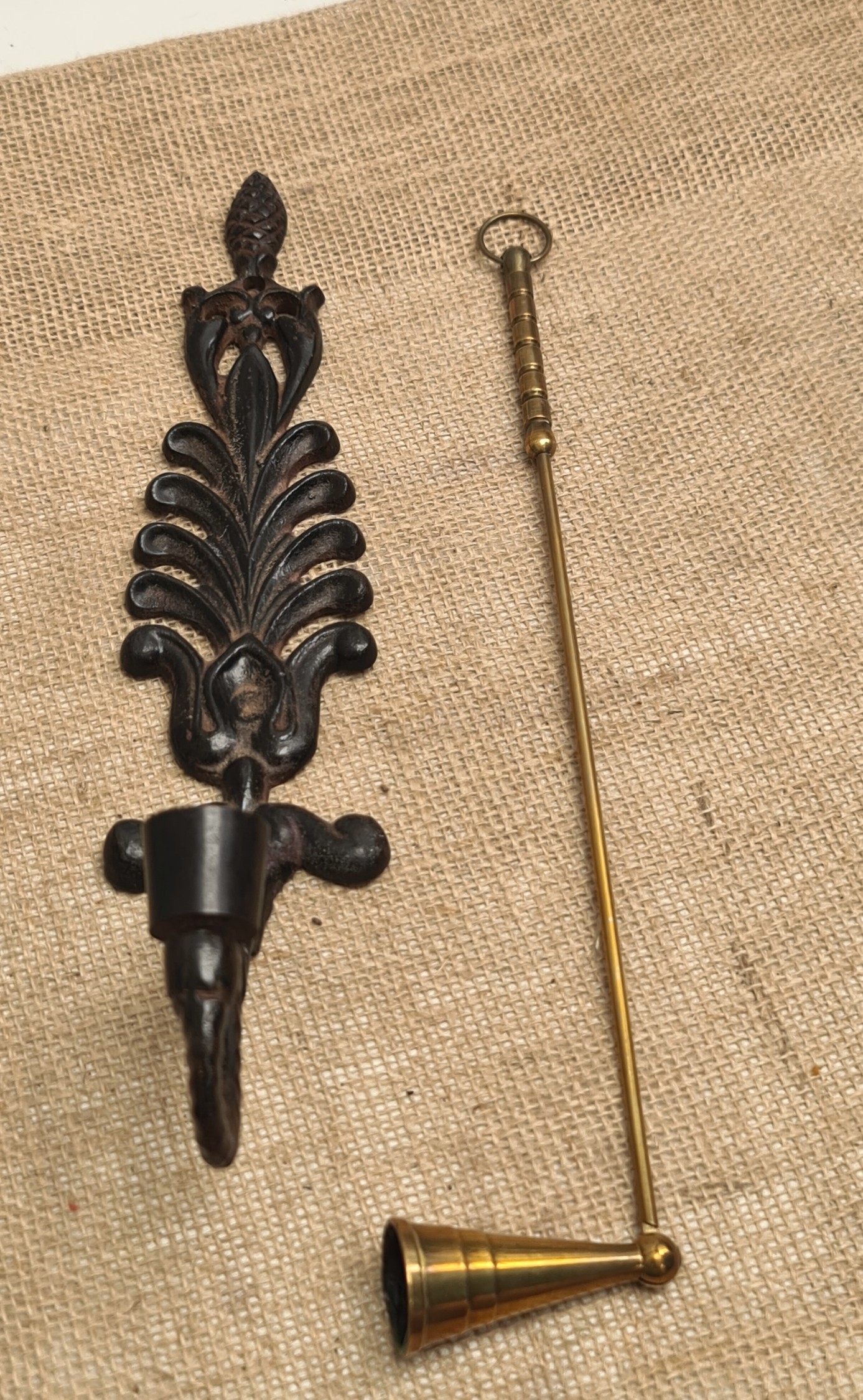 Antique Brass Candle Snuffer and Vintage Wall Sconce Candle Holder. The candle snuffer measures 14 inches long. Shipping is available. Please ask for a quote before bidding. Where possible we combine shipping costs. Remember, if you are the highest bidder above reserve on this Lot you have bought the item and are legally responsible for the item. Viewing is recommended in either person or via video link. Contact us to arrange.