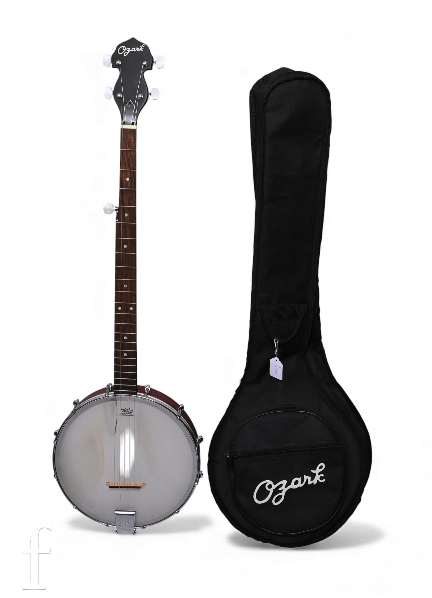 An Ozark five string banjo in original black zip canvas case.