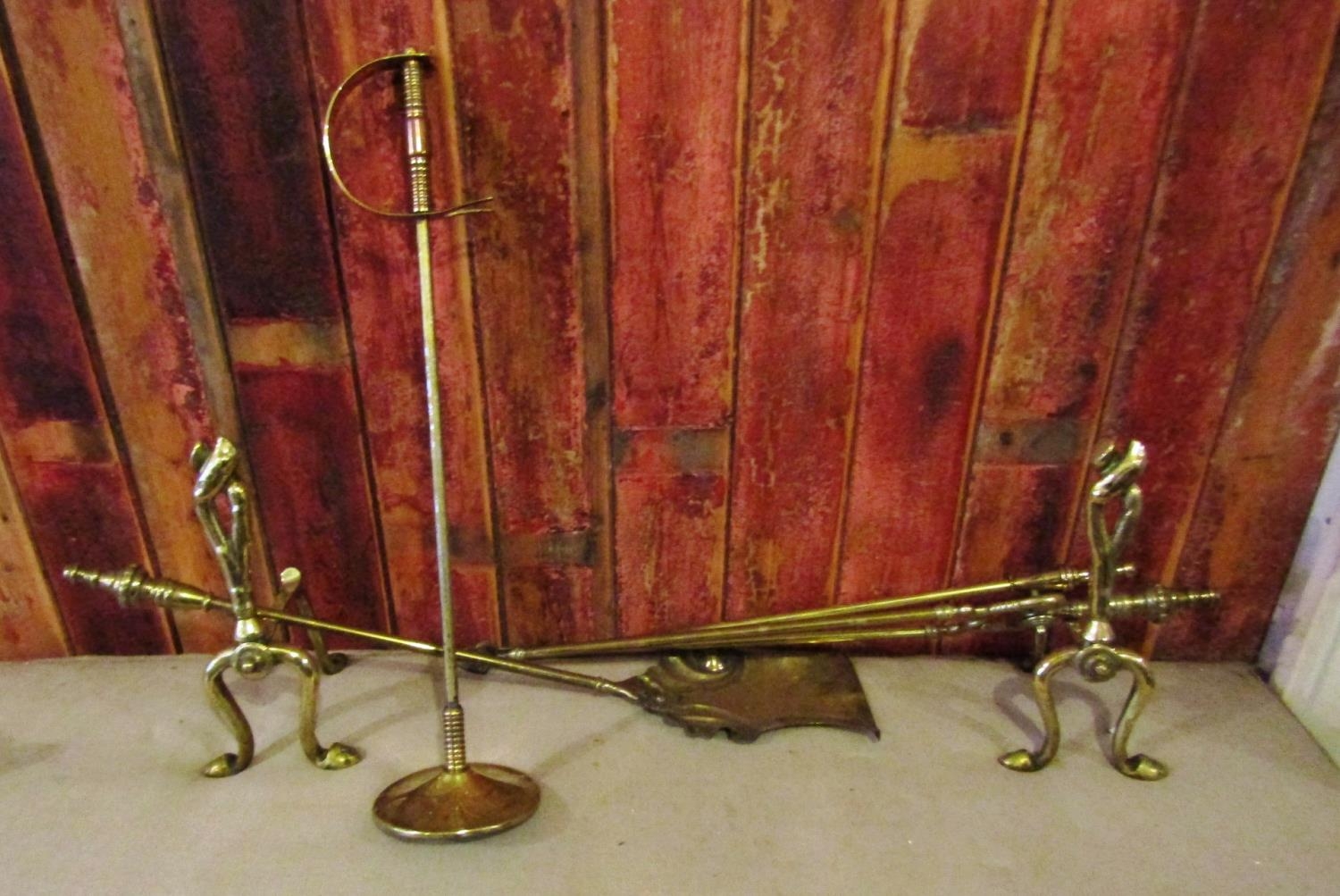 Set of Three Cast Brass Fire Irons Antique with Matching Fire Dogs and Sabre Form Fire Poker with Integral Rest Six Items in Lot