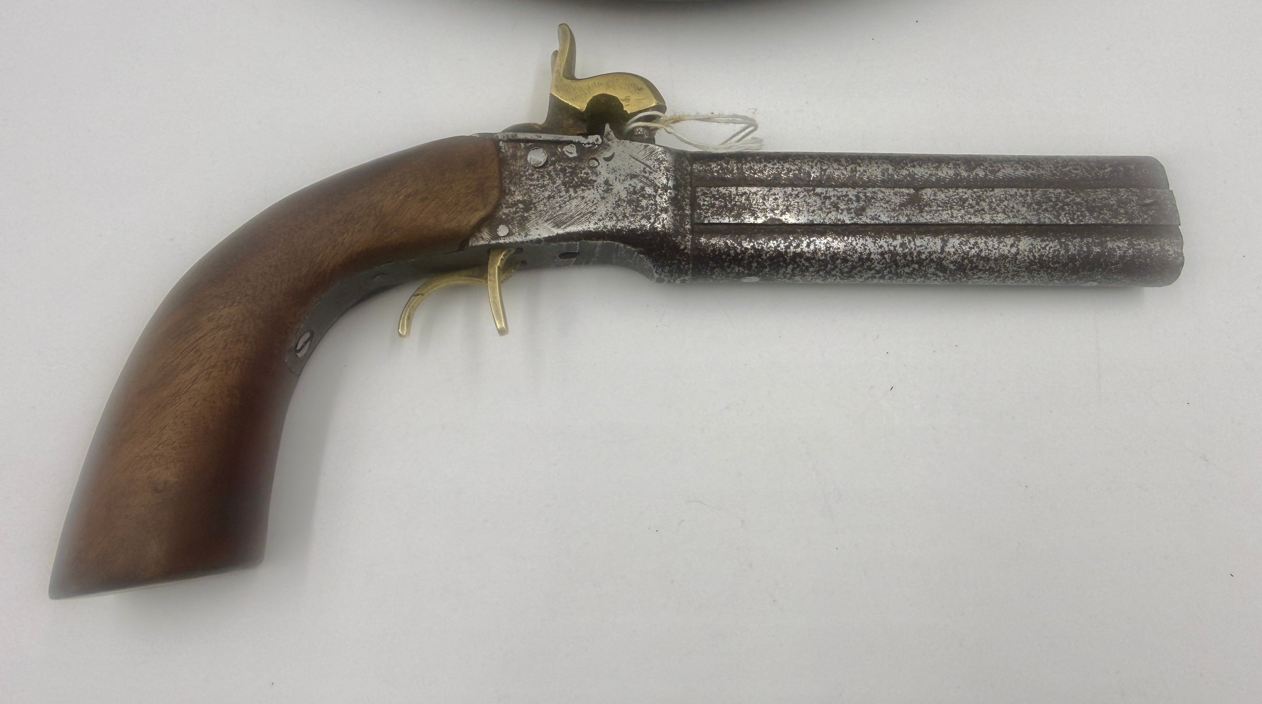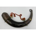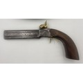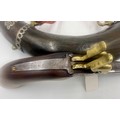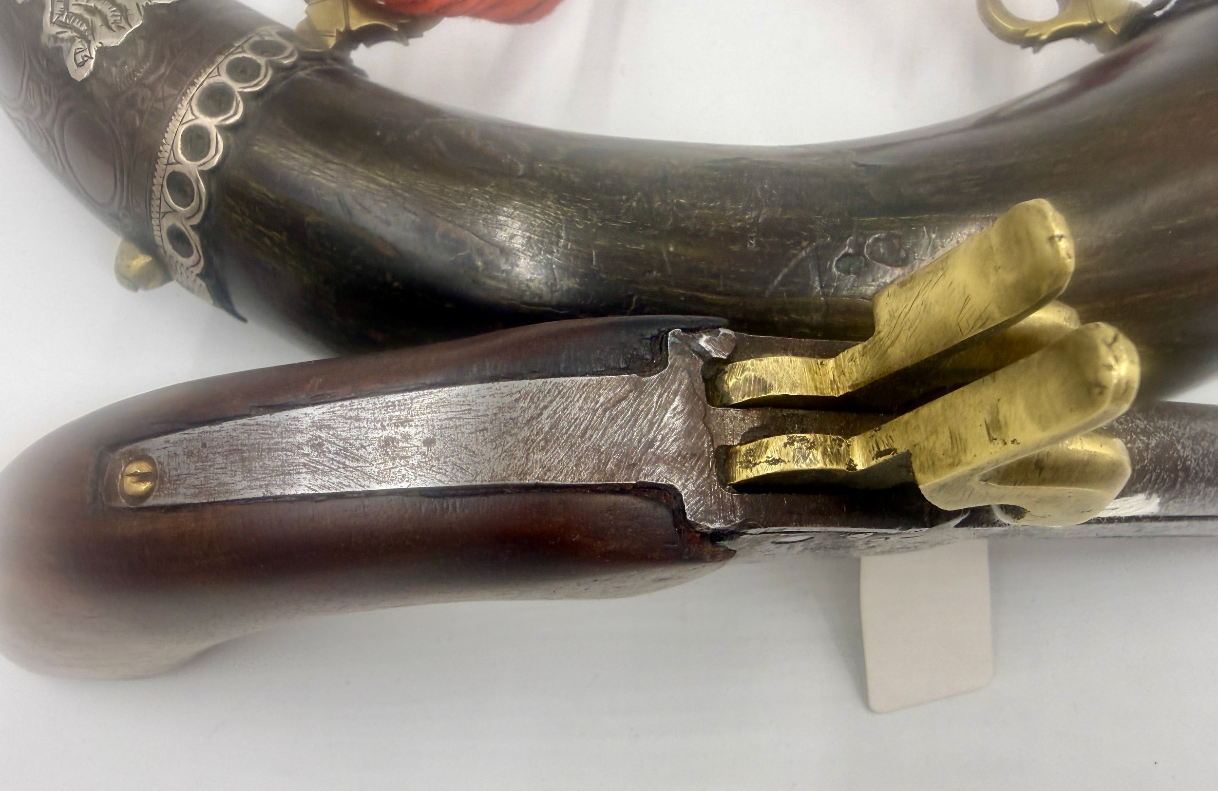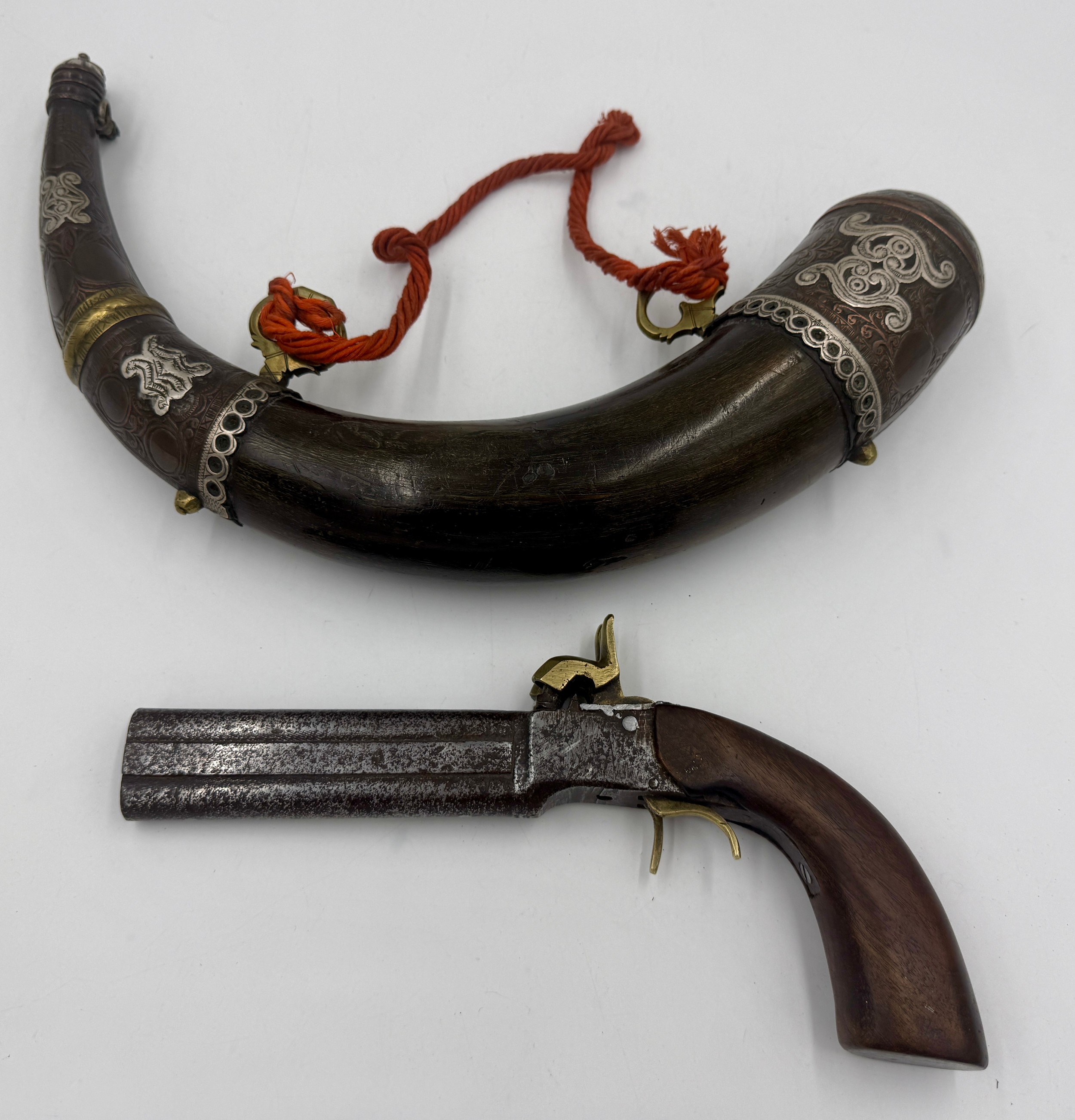 A double barrel over and under percussion pistol, 25cm l together with a brass and white metal powder horn.