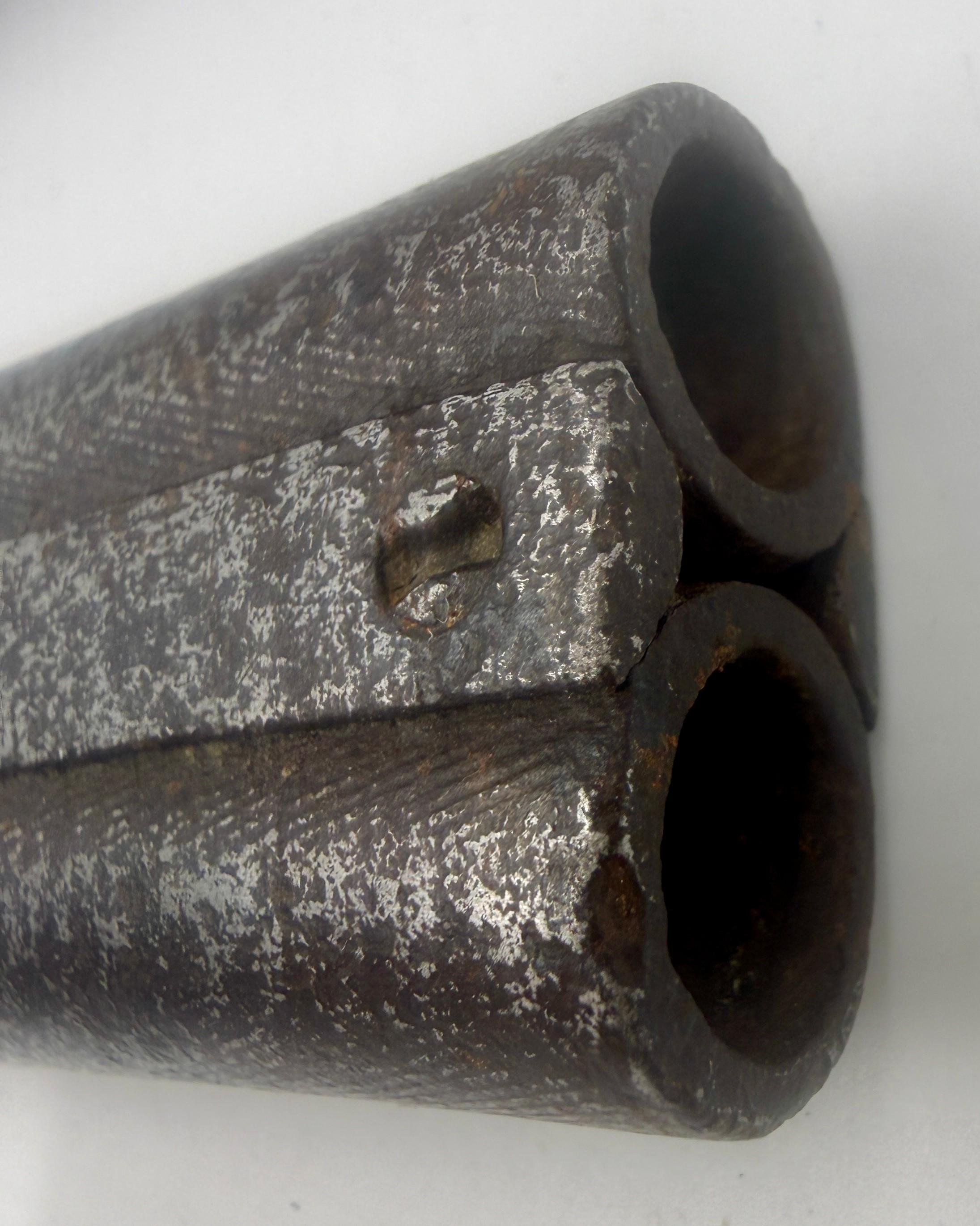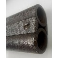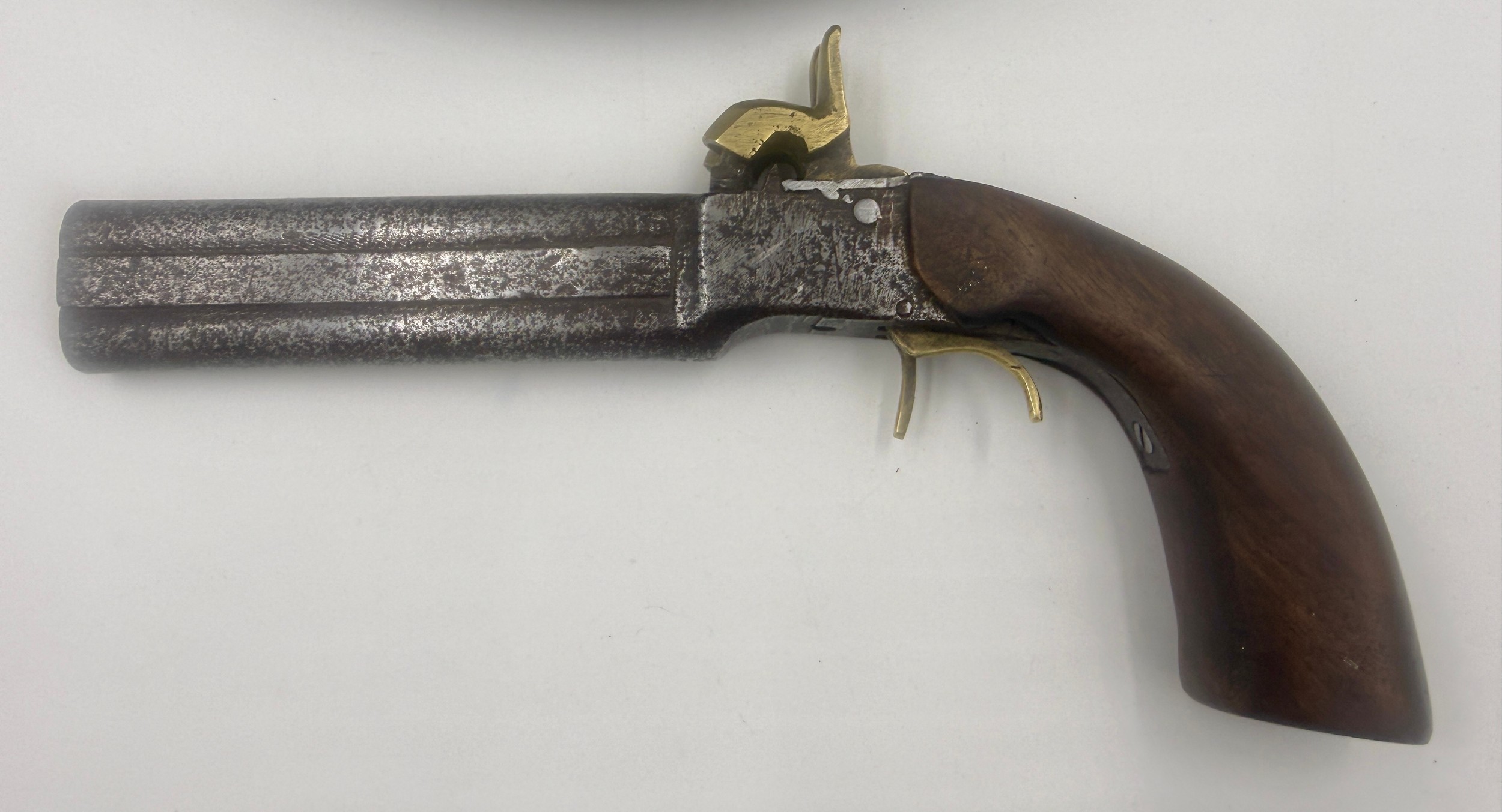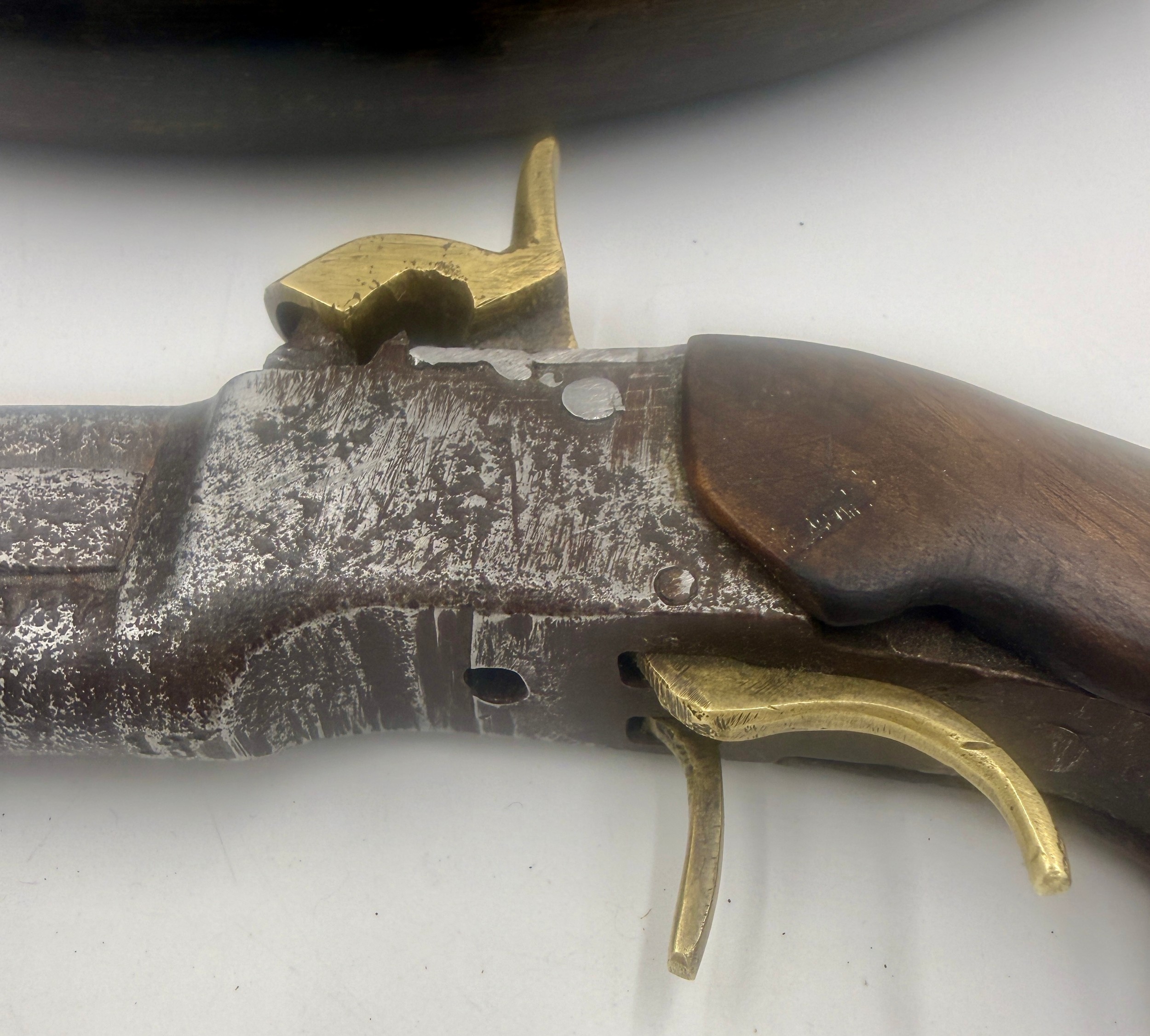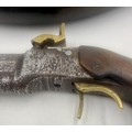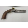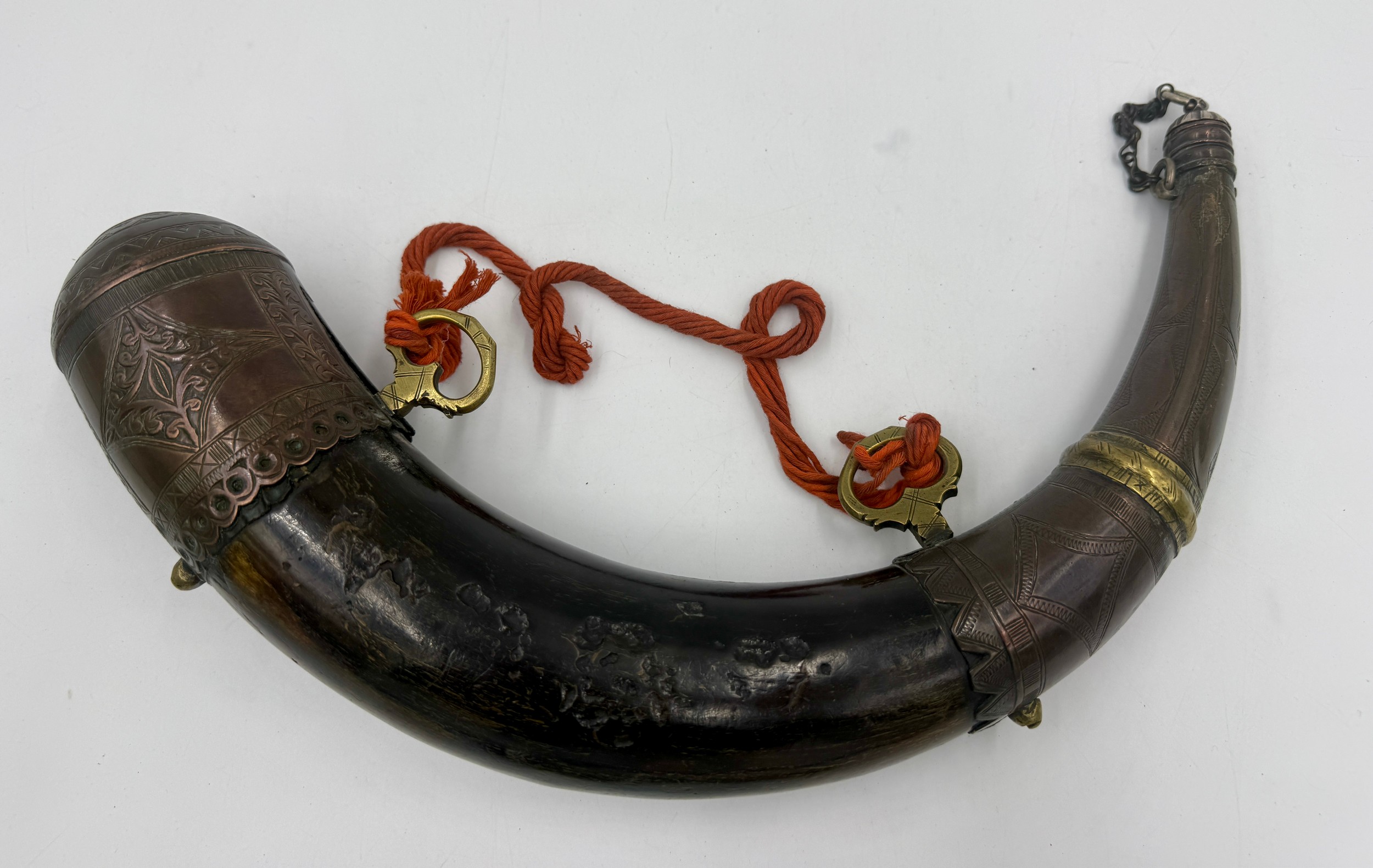 A double barrel over and under percussion pistol, 25cm l together with a brass and white metal powder horn.