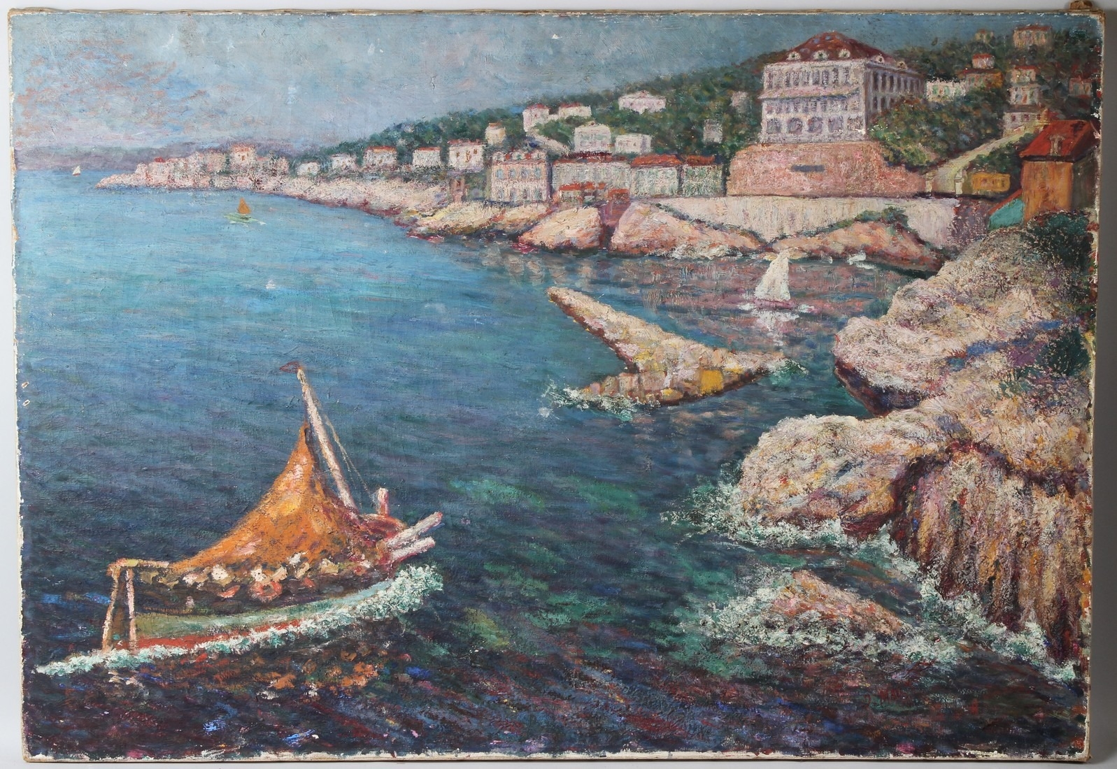 MEDITERRANEAN SCHOOL (POSSIBLY MALTESE) Fishing boat entering a harbour town oil on canvas unframed 81 x 116cm