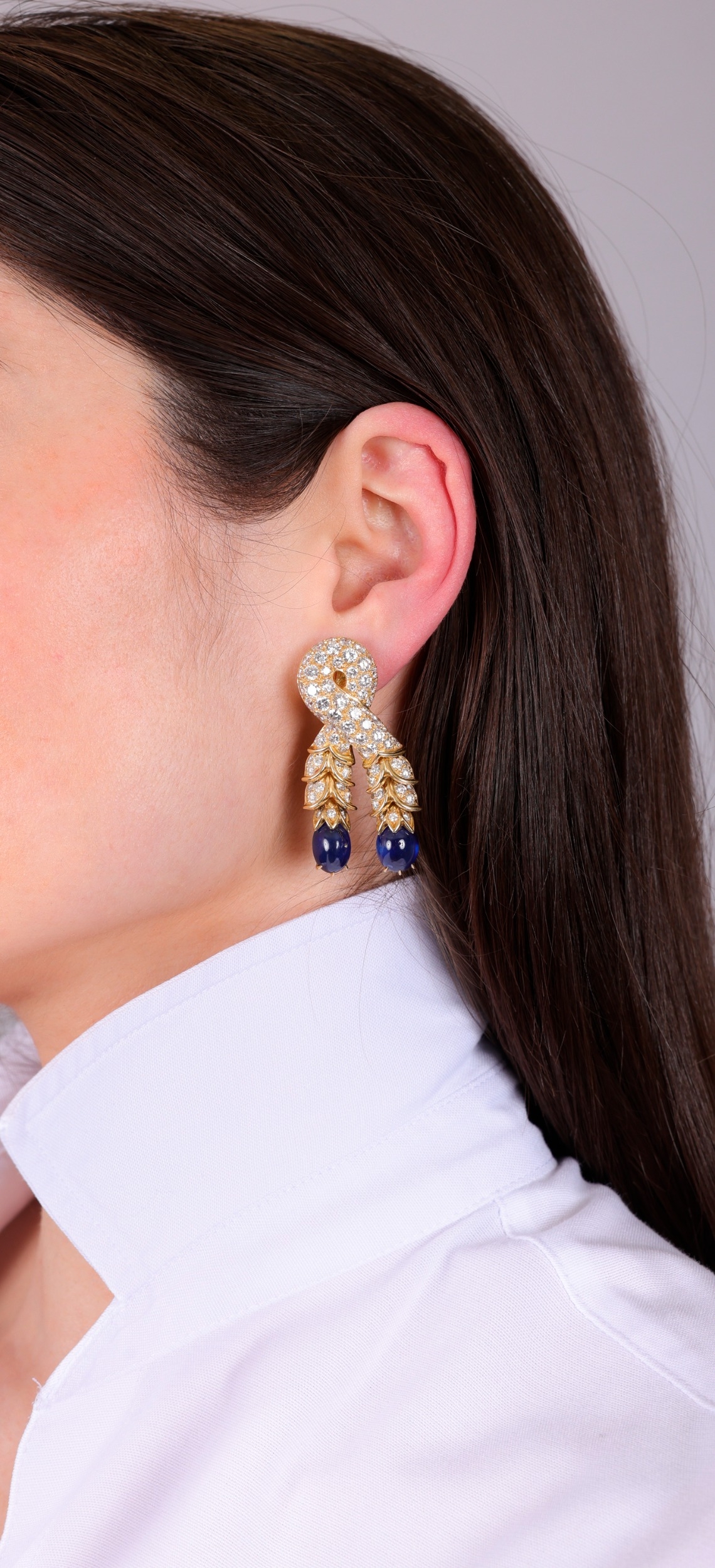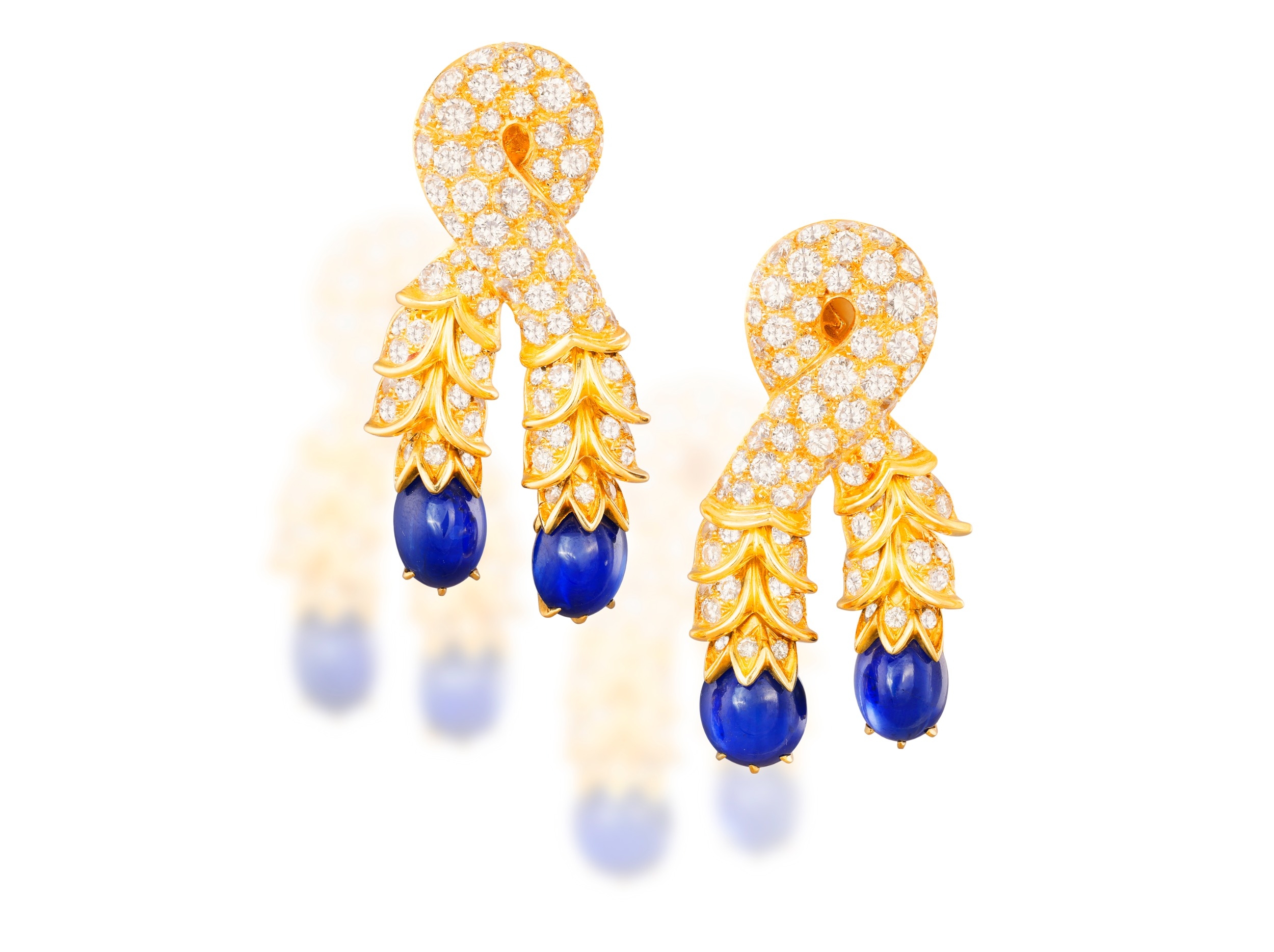Each designed as a stylised knot, pavé-set with brilliant-cut diamonds, suspending two articulated tassels pavé-set with brilliant-cut diamonds, highlighted with two oval-shaped sapphire cabochon drops, mounted in 18K gold, diamonds approximately 12.00cts total, sapphires approximately 20.00cts total, signed R. Boivin, with maker's marks for René Boivin, French assay marks, length 5cm