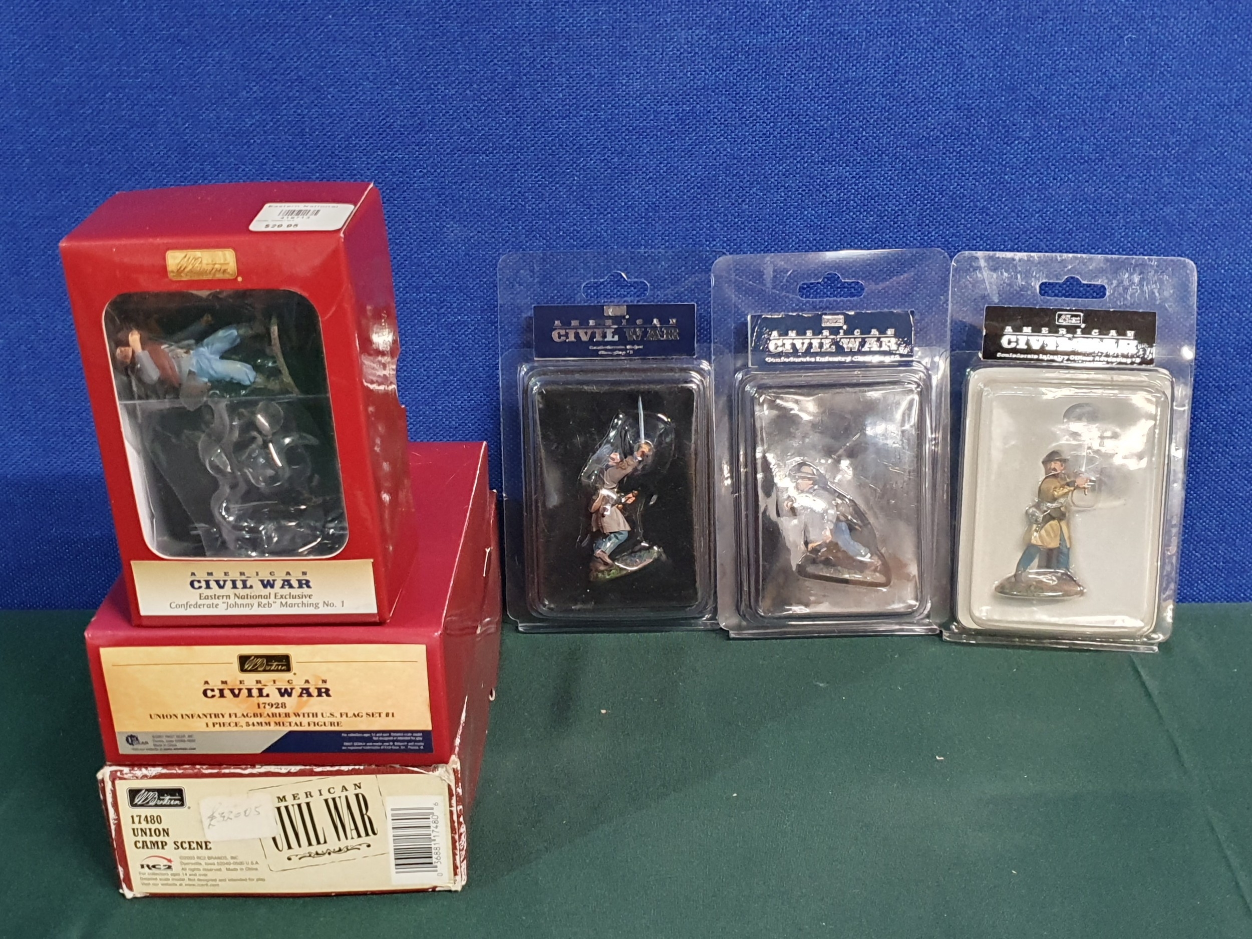 Five boxed Britains American Civil War Figures comprising 31190 Eastern National Exclusive Confederate 'Johnny Reb' Marching No.1, 17928 Union Infantry Flagbearer with US Flag Set No.1, 31013 Confederate Infantry Officer Advancing No.2, 31044 Confederate Infantry Charging No.3 and 31035 Confederate Major Charging No.1, together with a boxed 17480 Union Camp Scene, G-As new