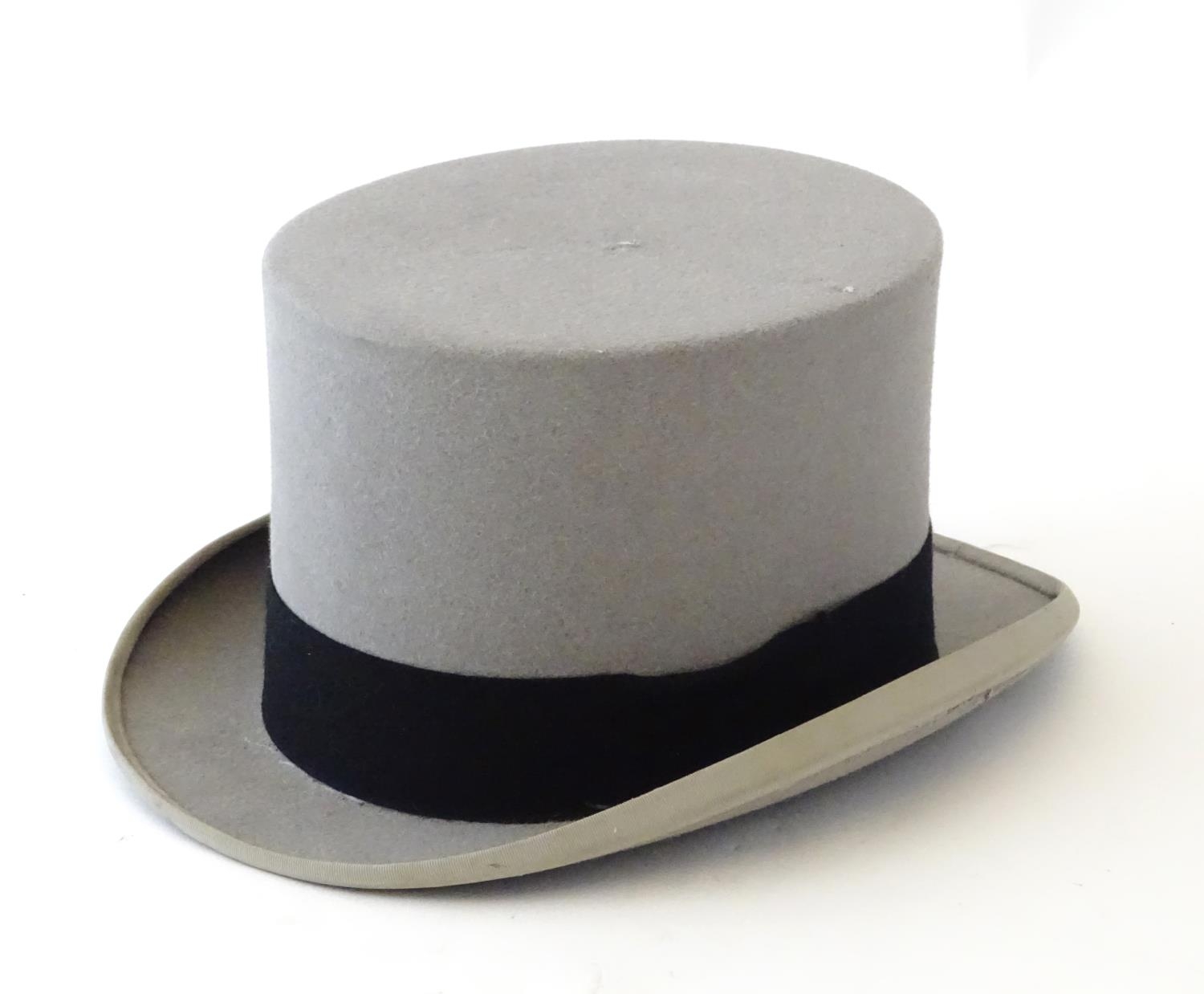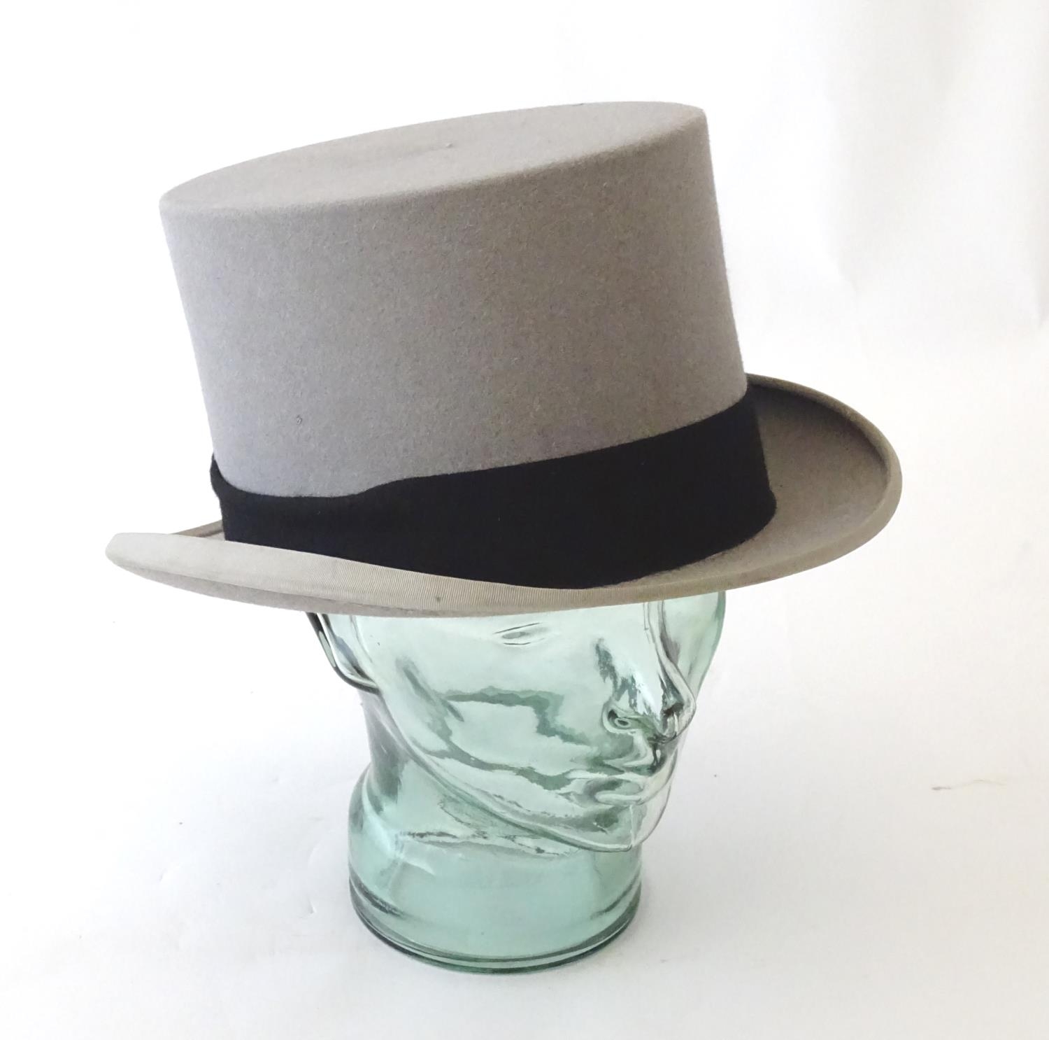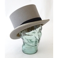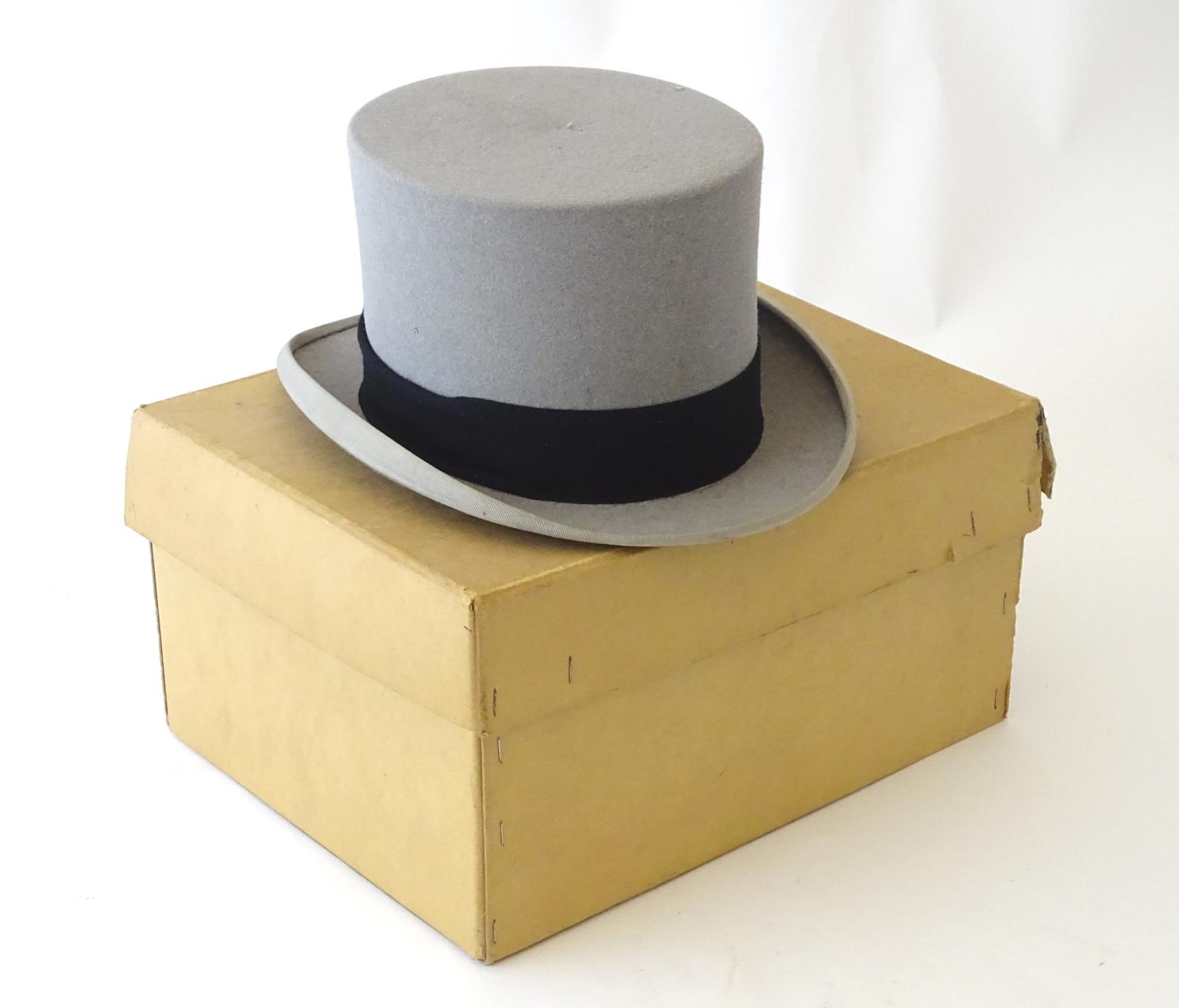 A Gieves of London grey felt top hat with a black trim, size 7 1/8 Contained within original card box.