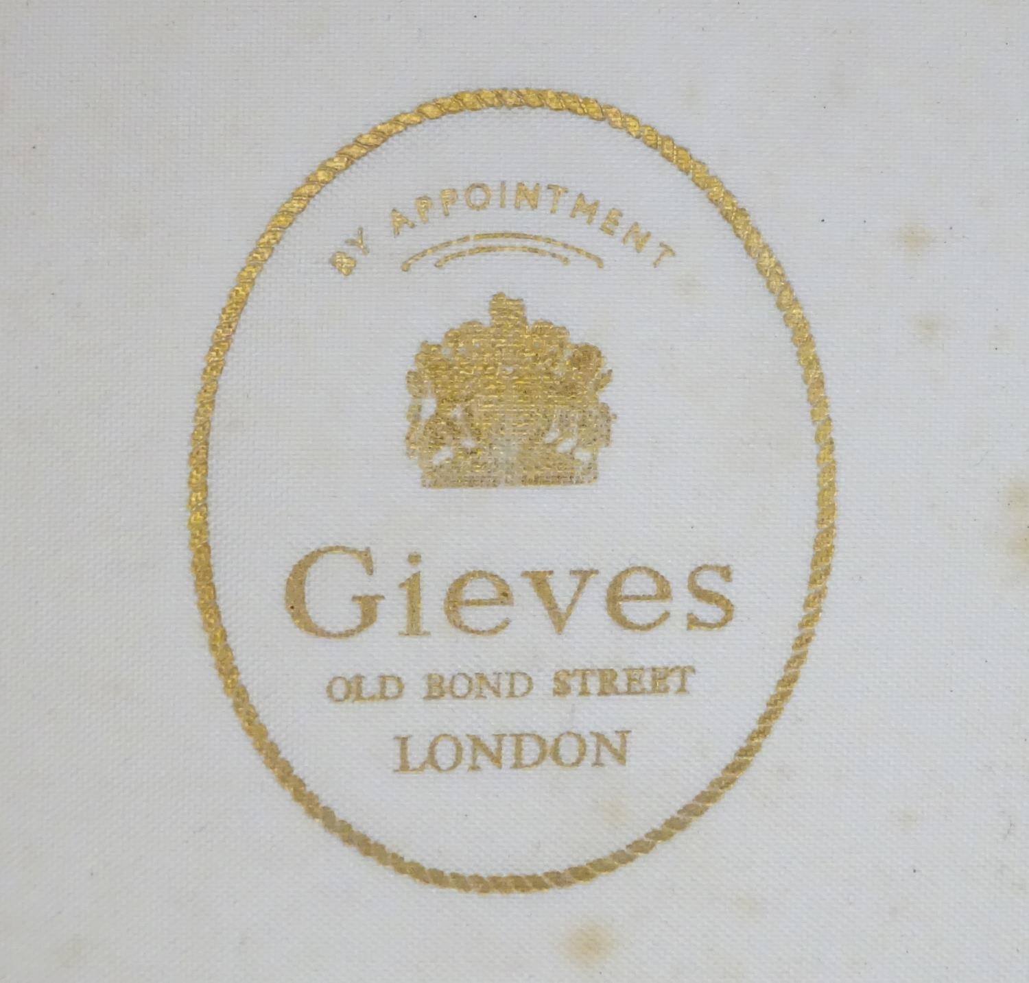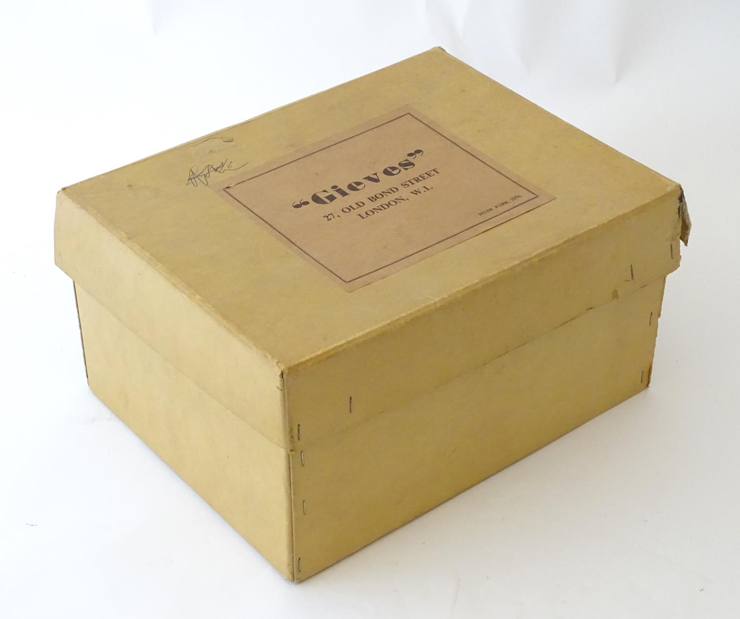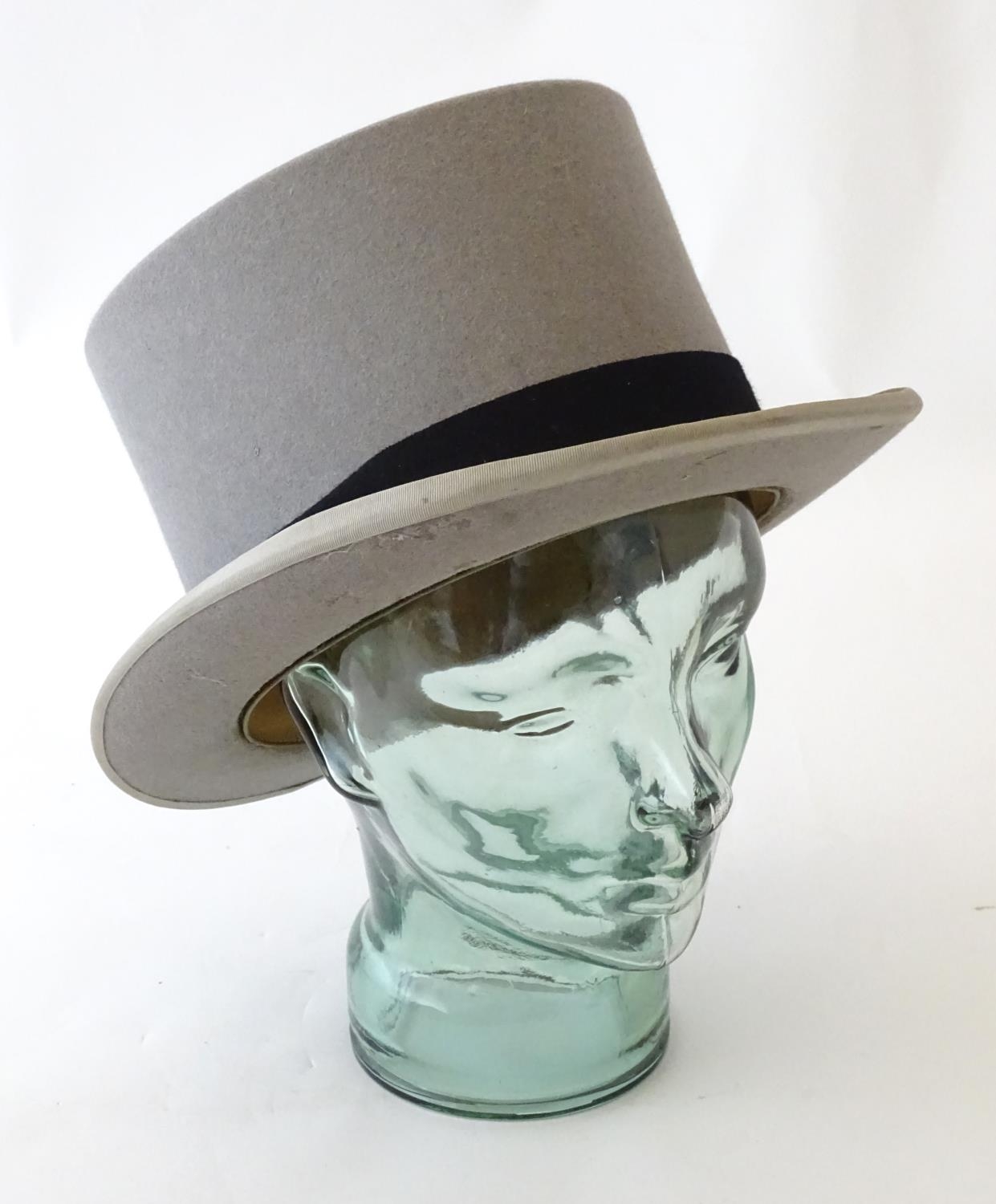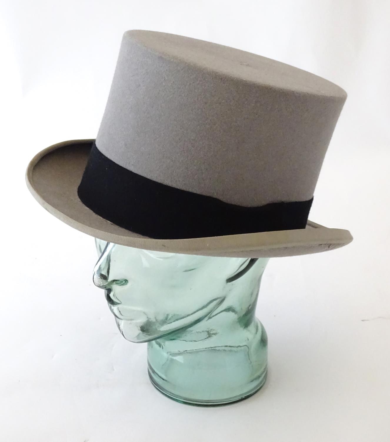 A Gieves of London grey felt top hat with a black trim, size 7 1/8 Contained within original card box.