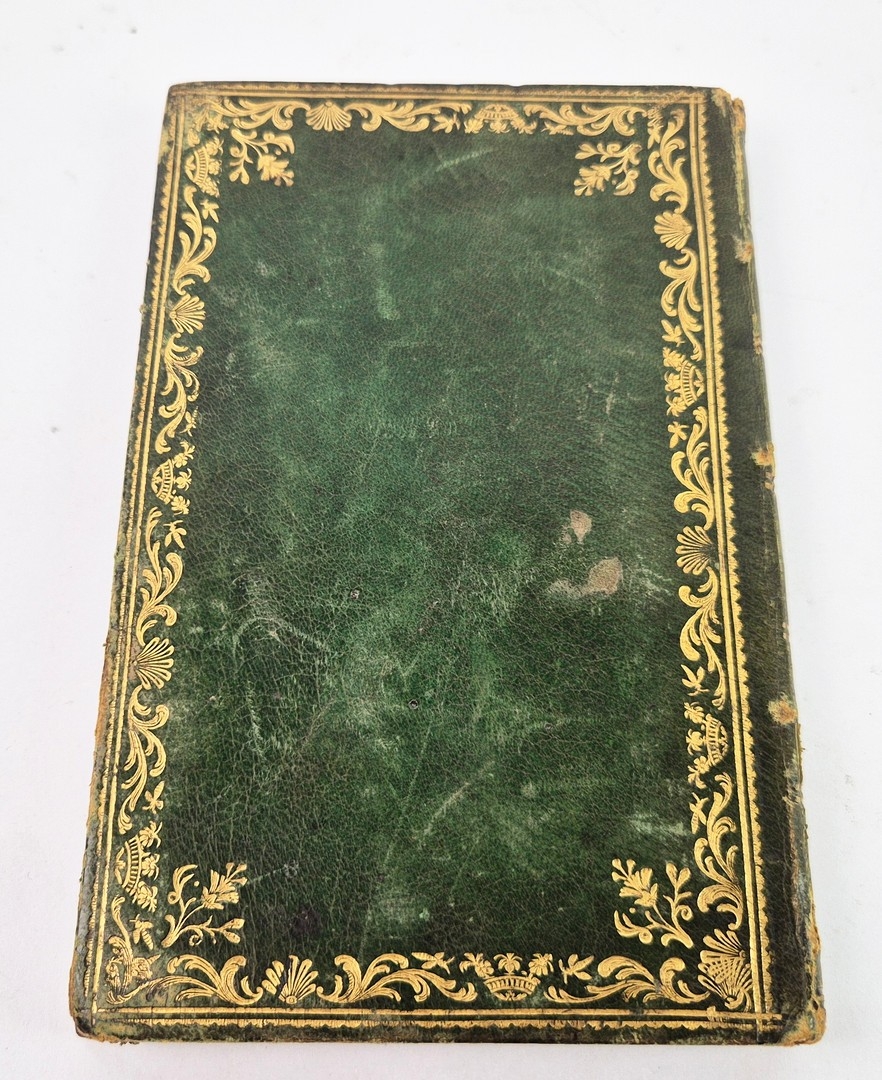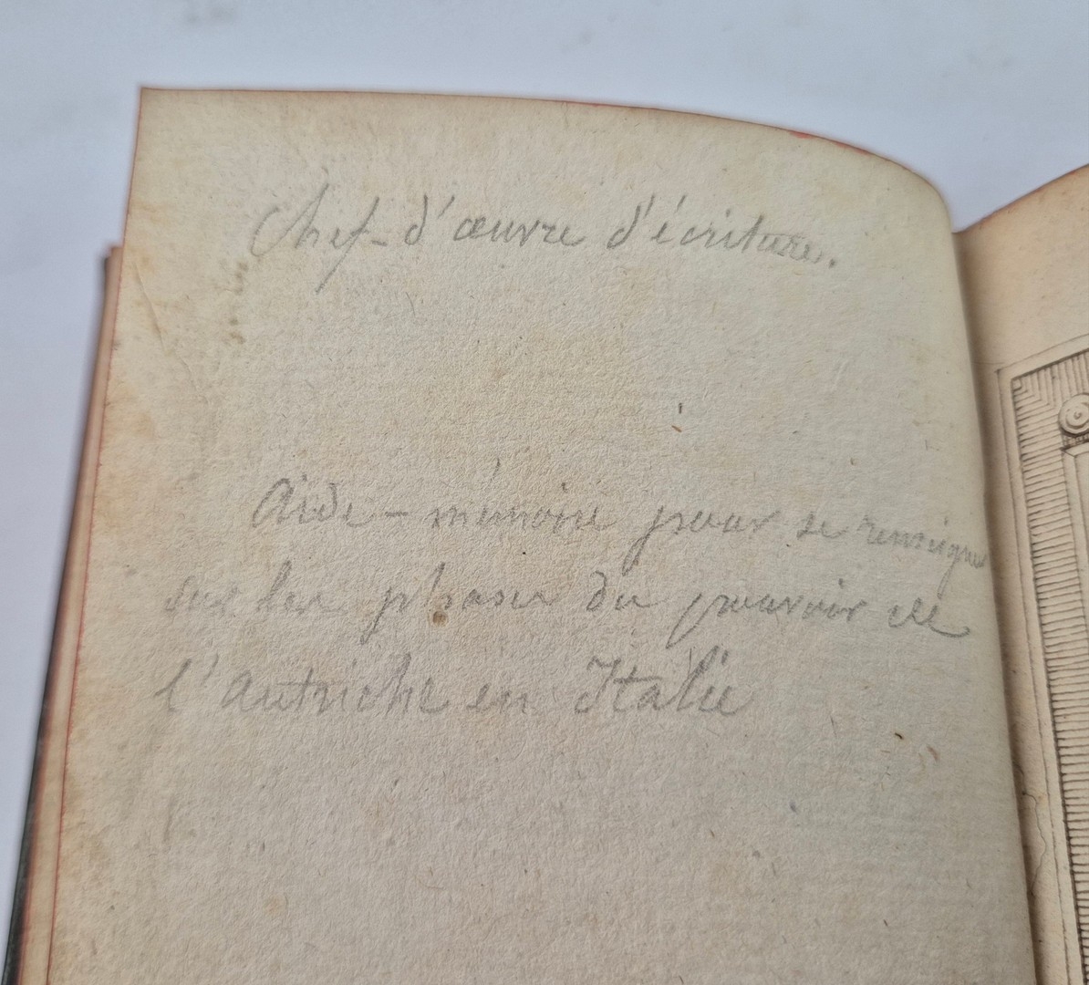 Bound in handsome full dark green morocco with elaborate gilt border tooling. Small gilt crown motifs suggest noble or high-status ownership. Likely produced for personal study or instruction: front flyleaf inscription in pencil "Chef-d'oeuvre d'ecriture. Aide-memoire pour se rememorer des phases du pouvoir de l'Autriche en Italie." ("Masterpiece of writing. Memo aid to remember phases of Austria's power in Italy.")