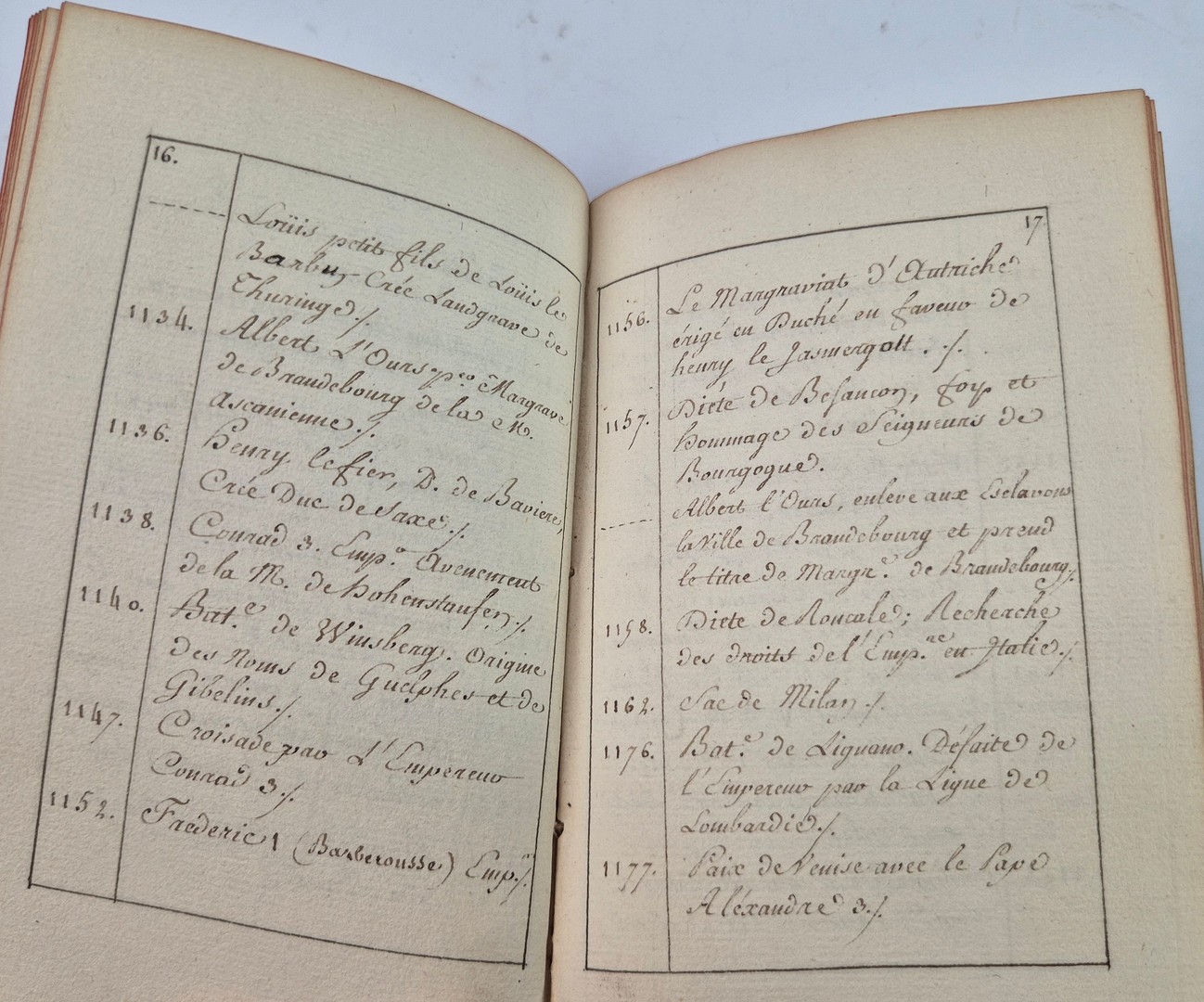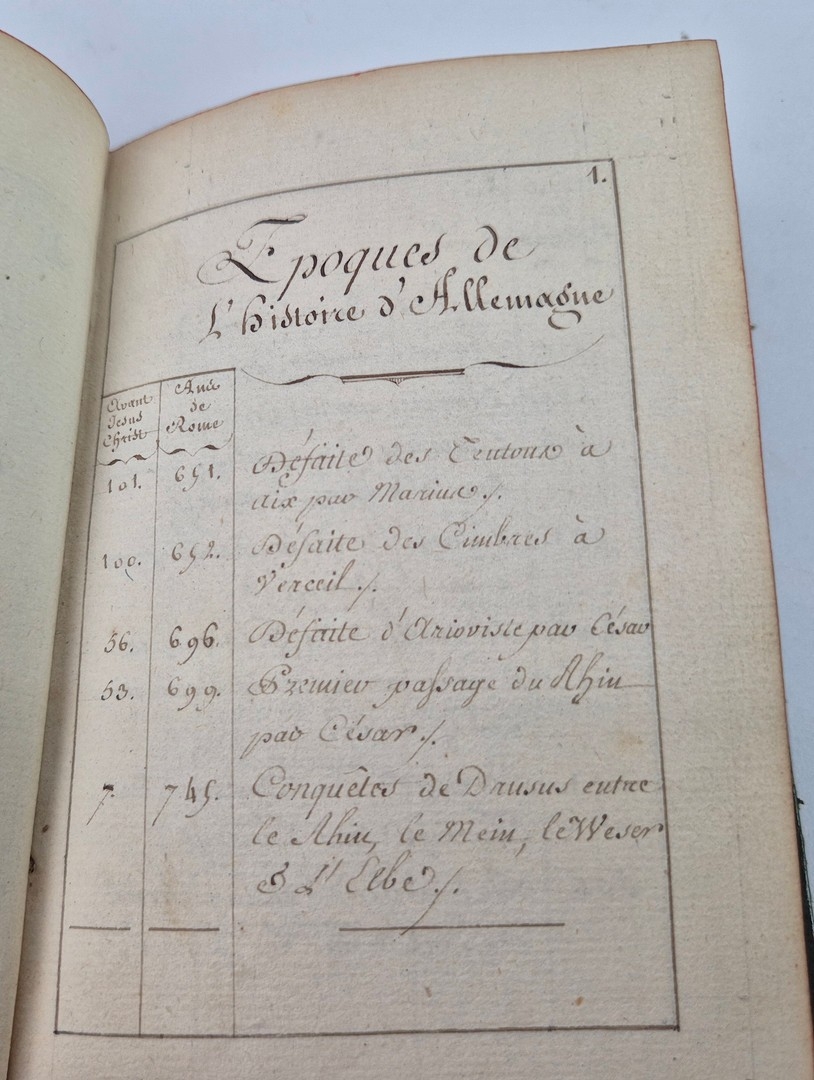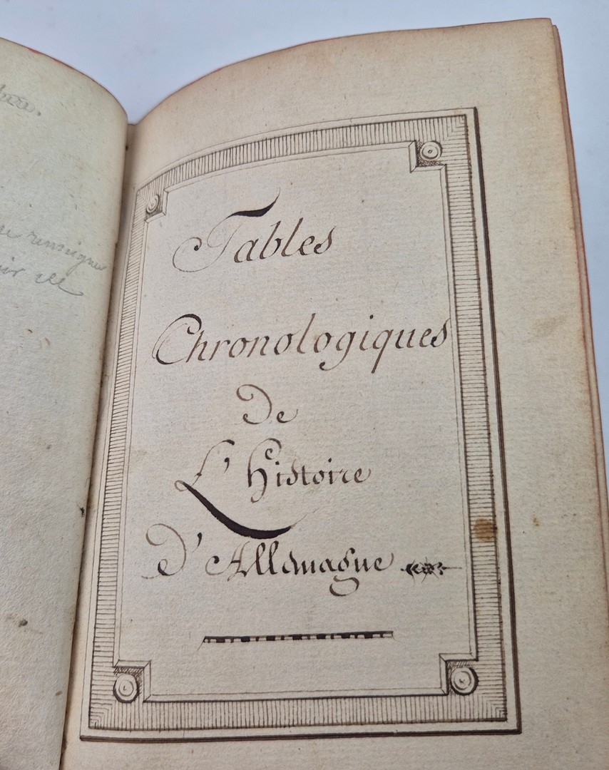 TABLES CHRONOLOGIQUES DE L'HISTOIRE D'ALLEMAGNE, CA. LATE 18TH CENTURY. 32mo French manuscript of approx. 65 leaves, neatly compiled and written in a fine 18th century hand, chronicling key events in German and Central European history from 691 to 1779. The entries, written in French, reflect a learned and systemic approach, focusing on the actions and influence of the Austrian Habsburgs.