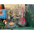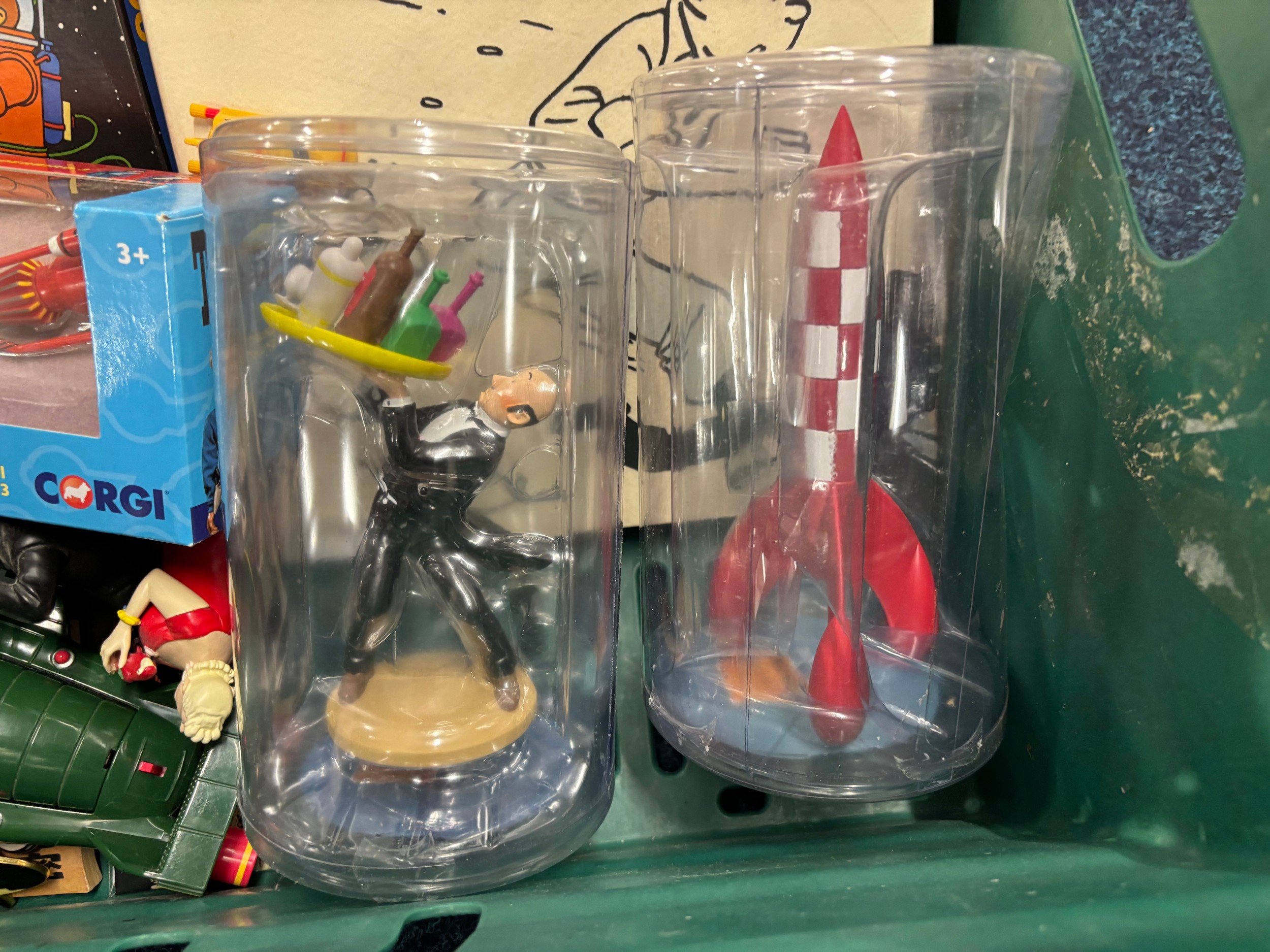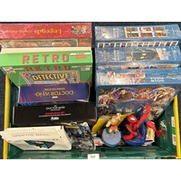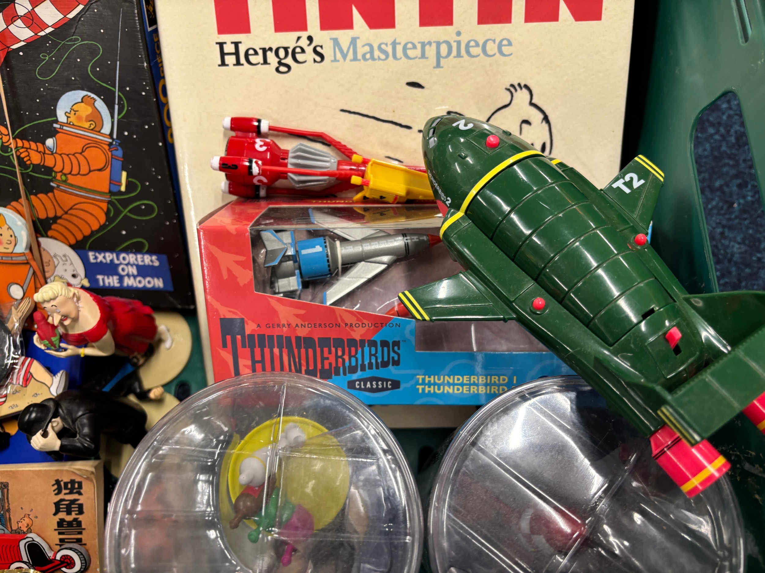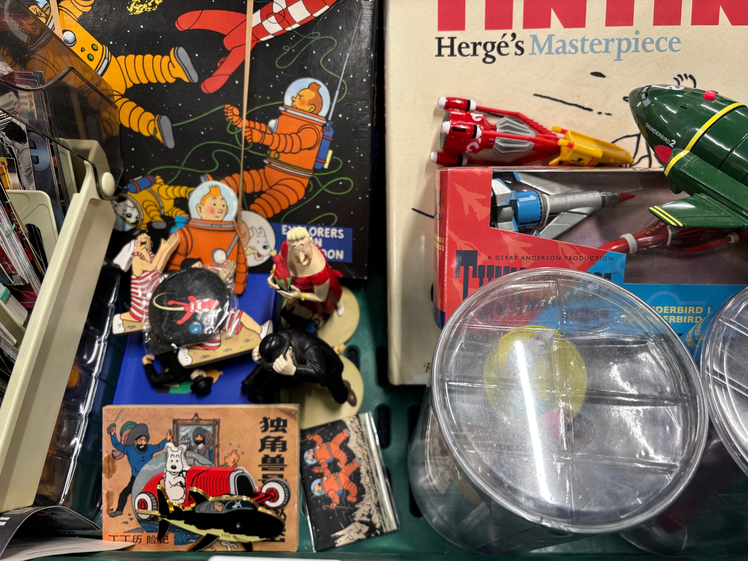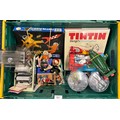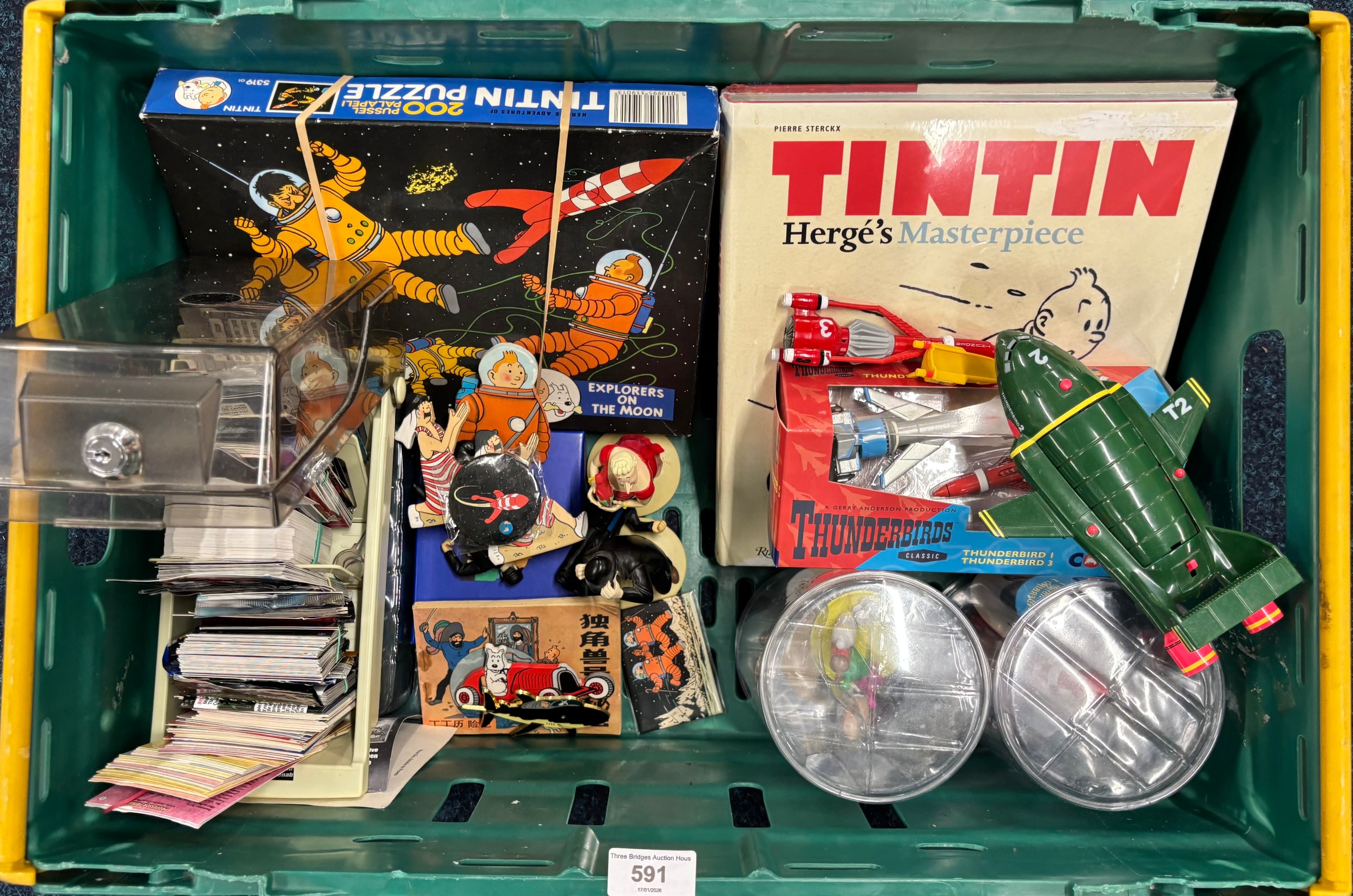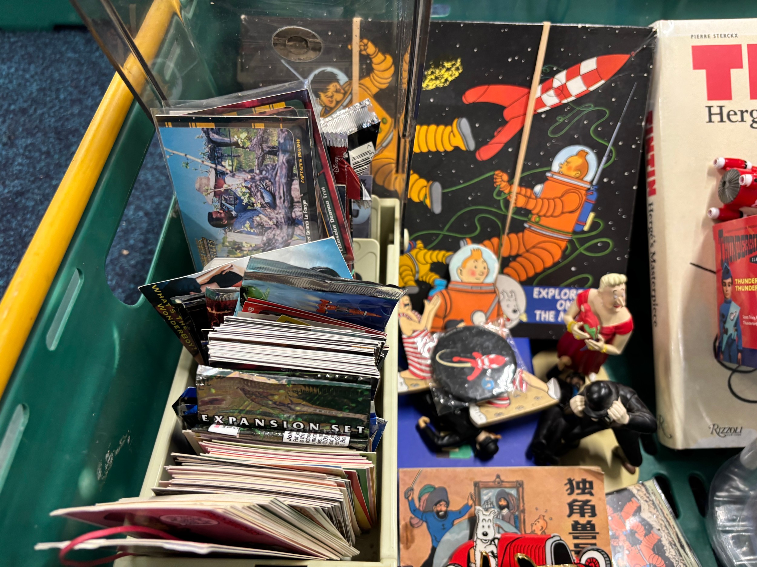 A Crate of Tin Tin Collectables and odds; Card deck containing mixed collectors cards- Simpsons, Star Trek and various movie cards.