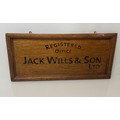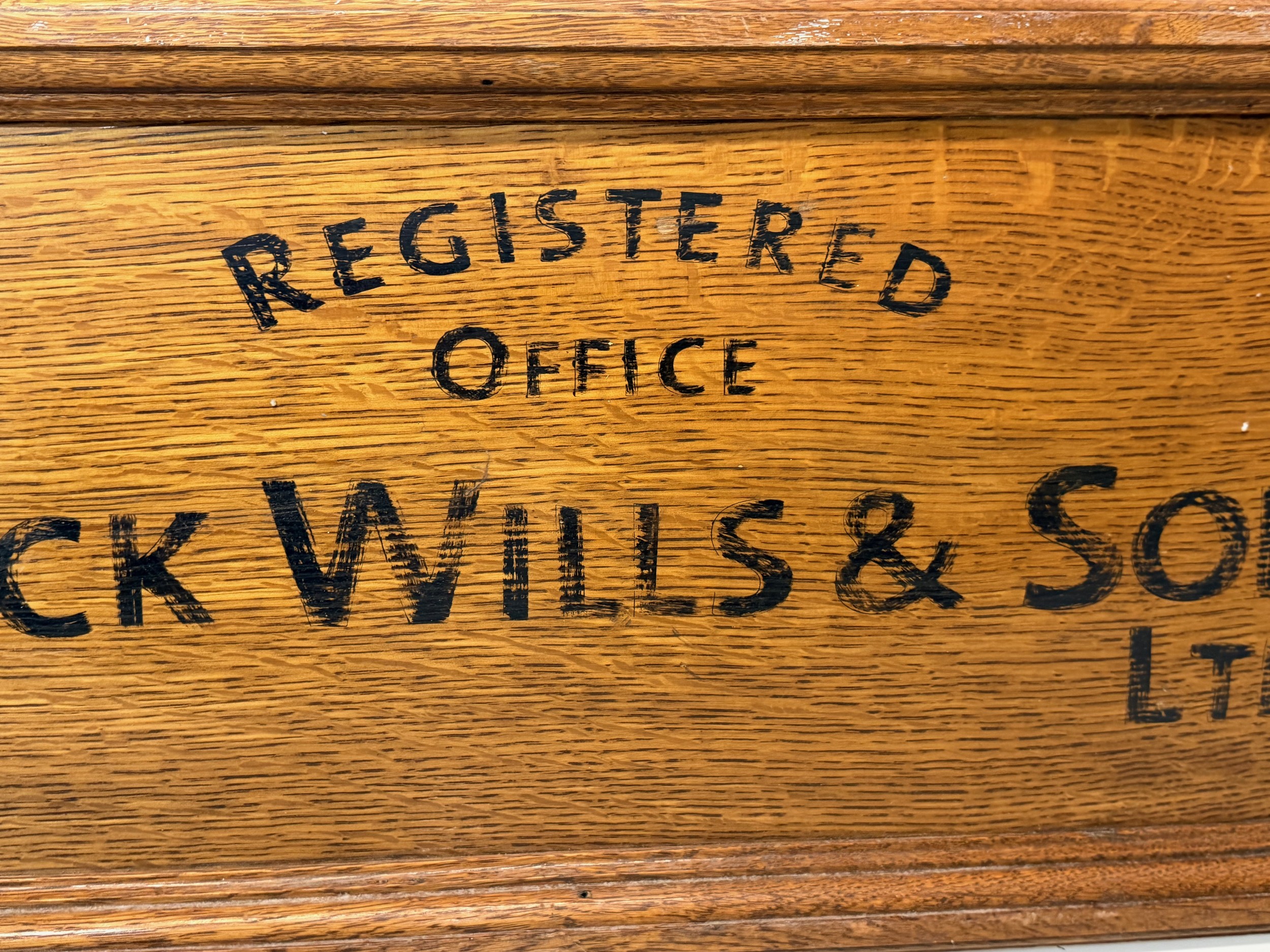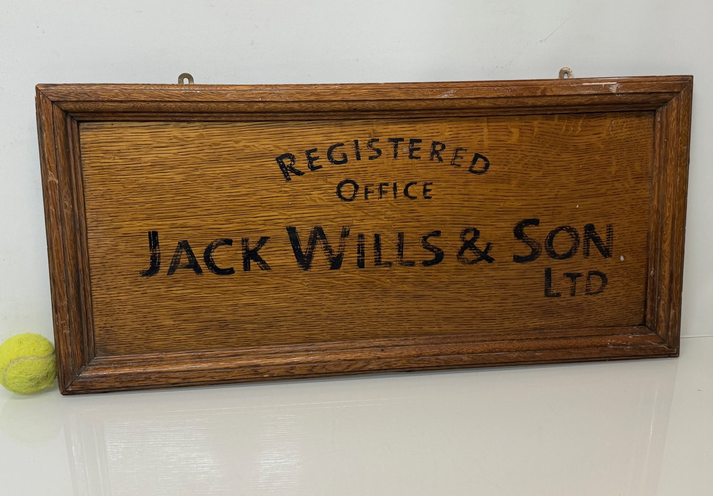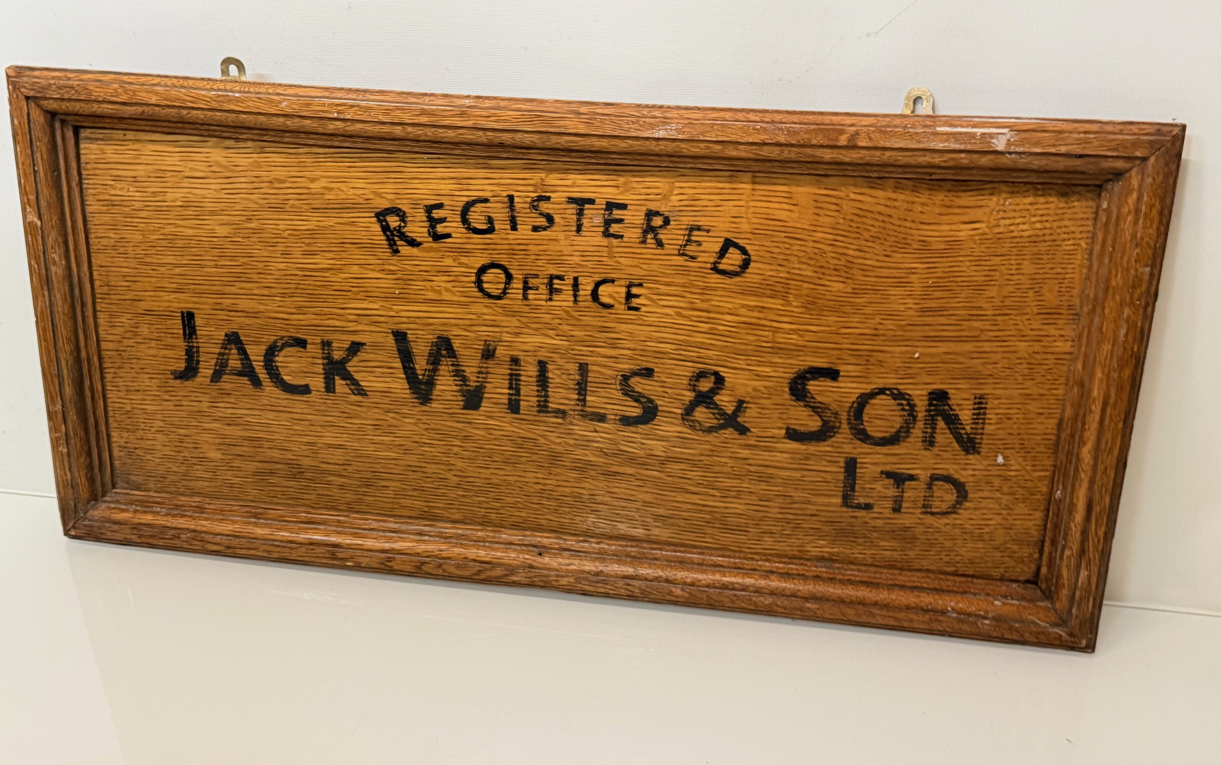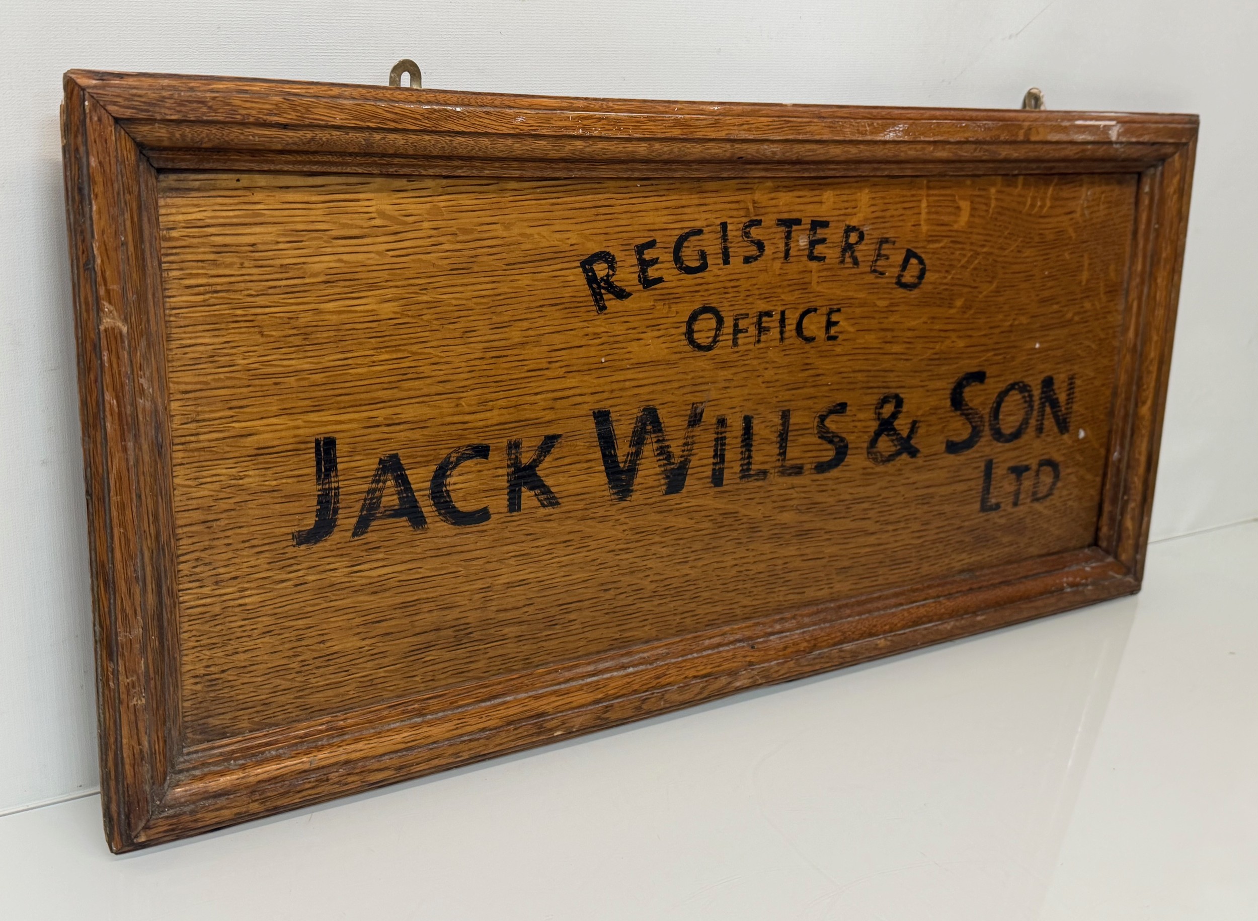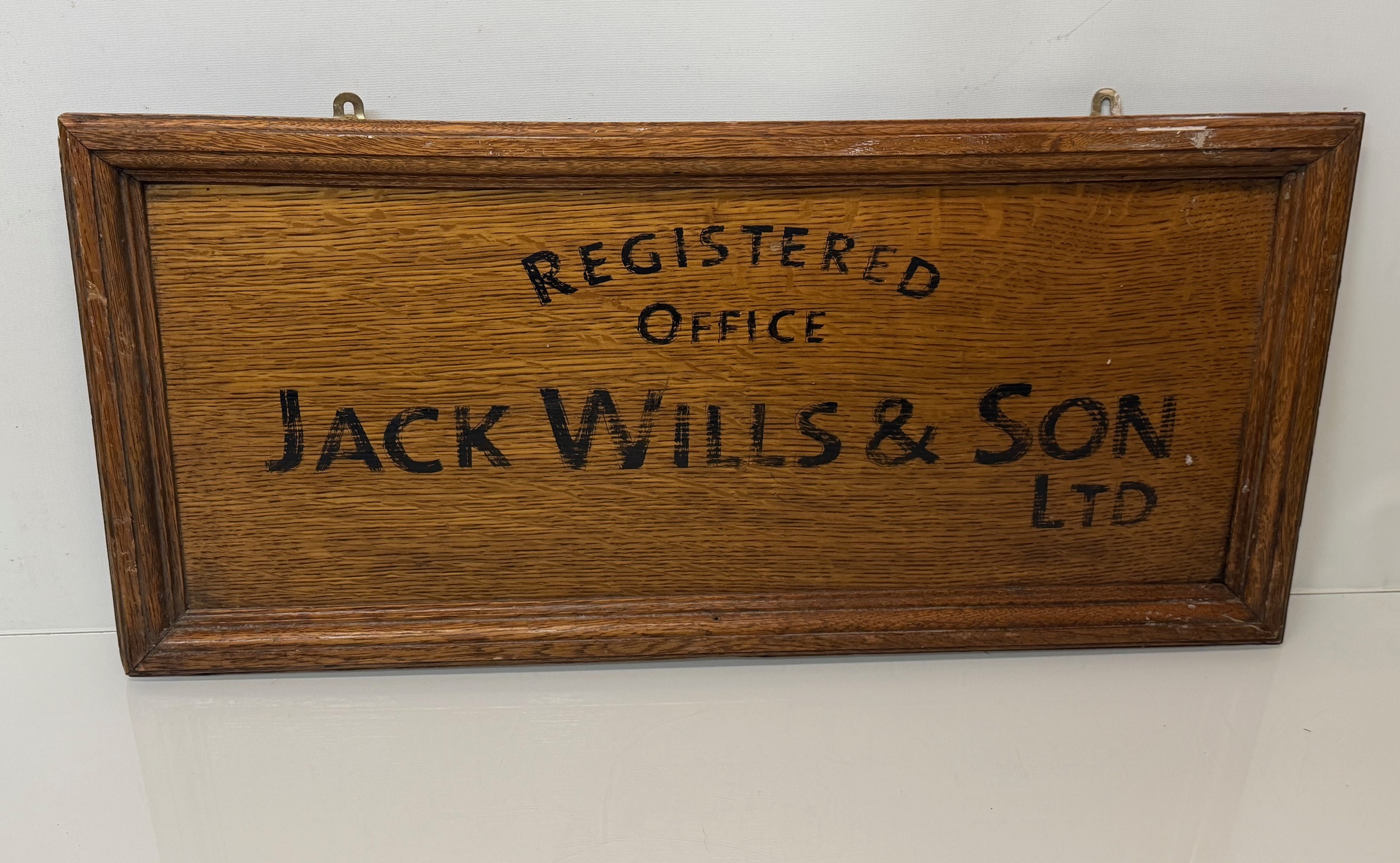 Oak business sign, Hand sign written for Jack Wills & Son Ltd, 71 cm x 33 cm.