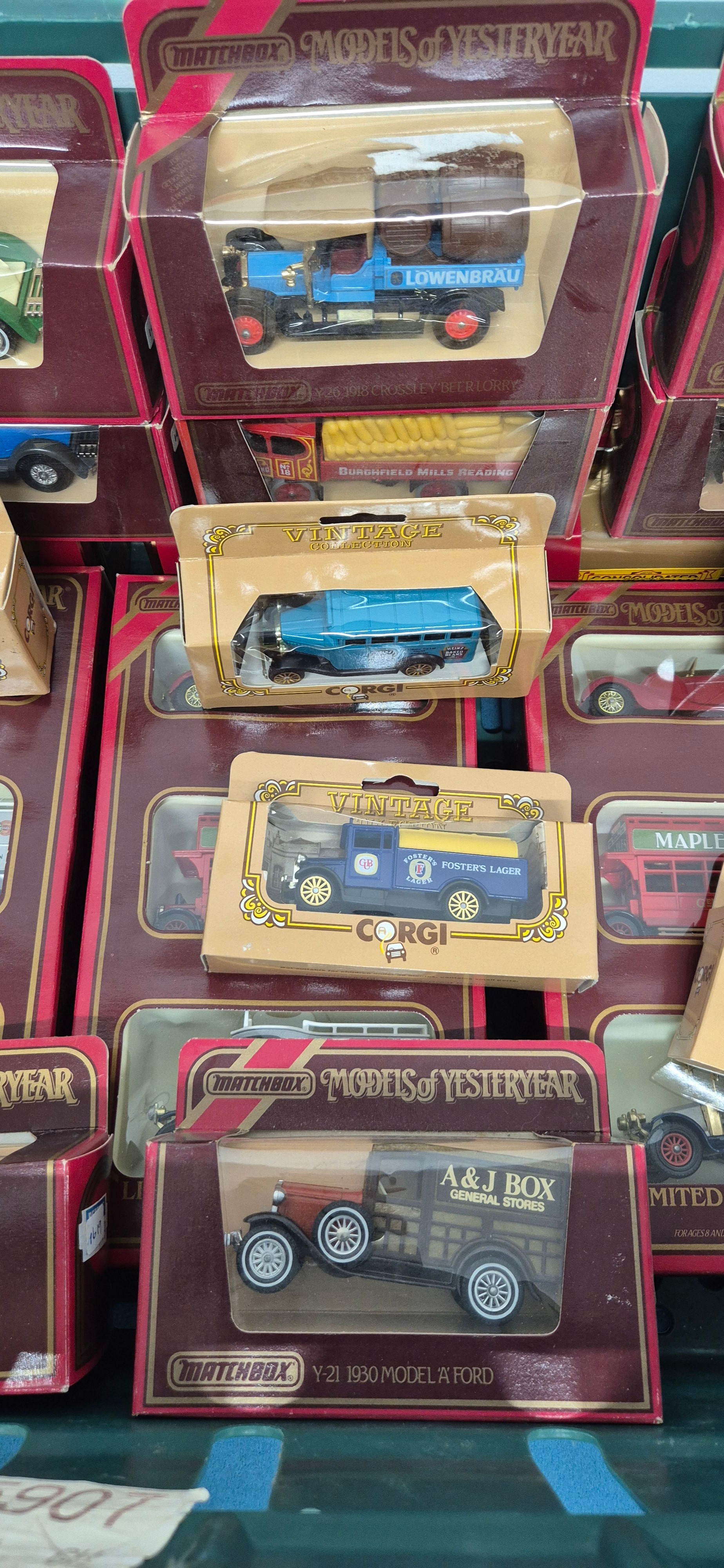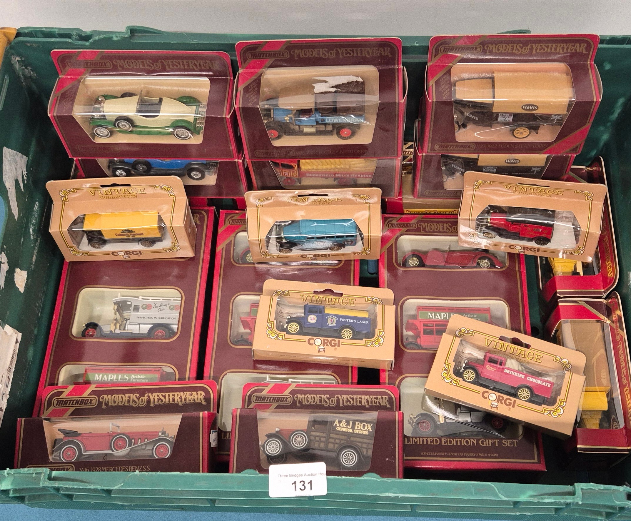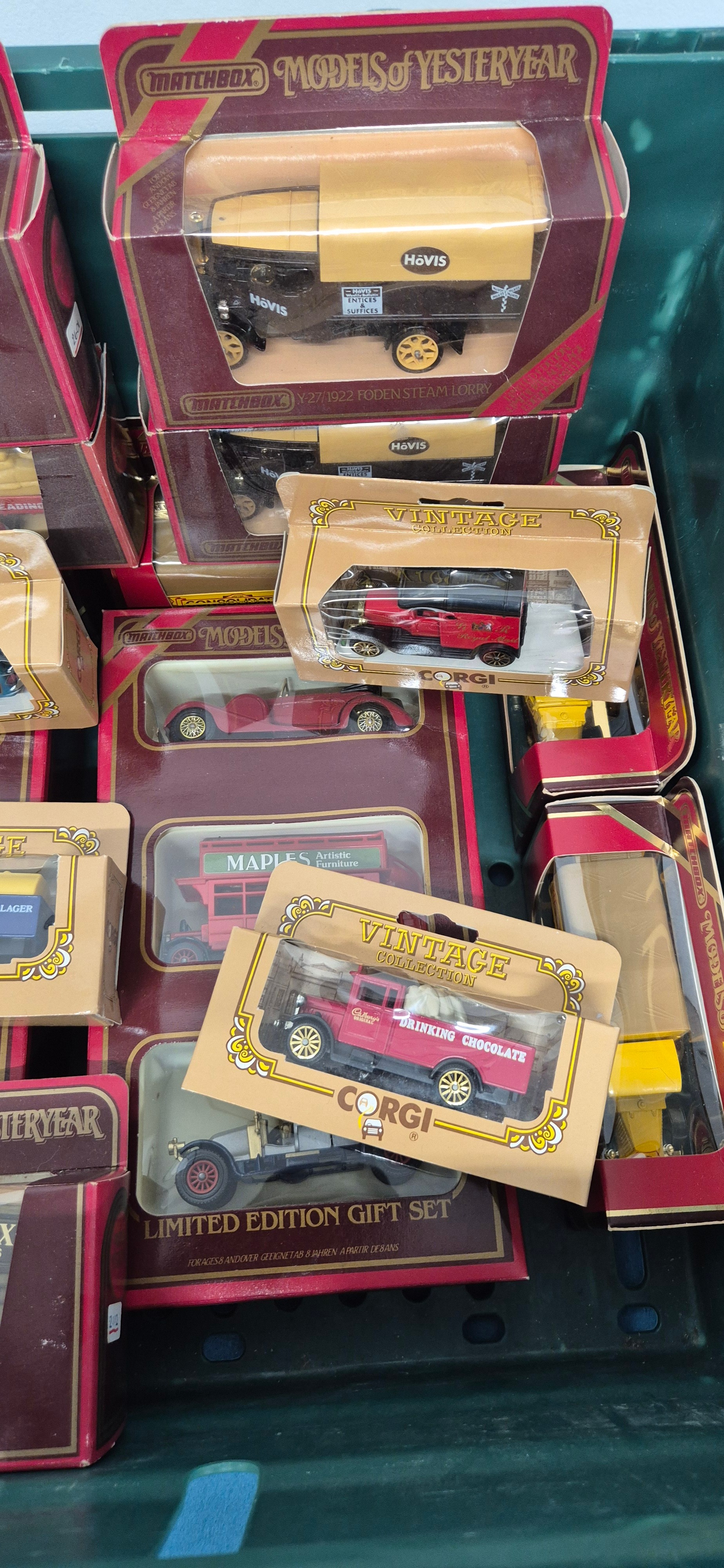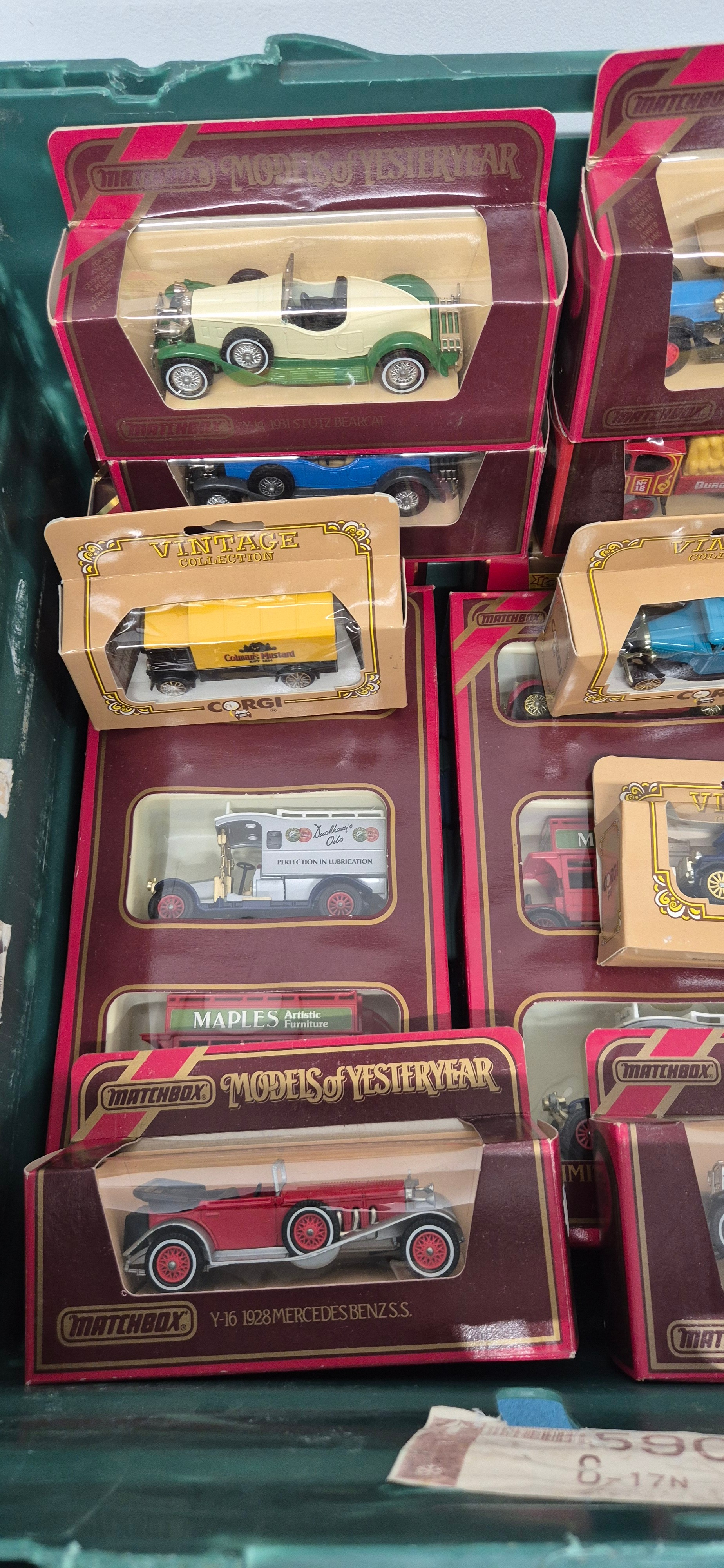 Crate of boxed Matchbox and Corgi vehicles.