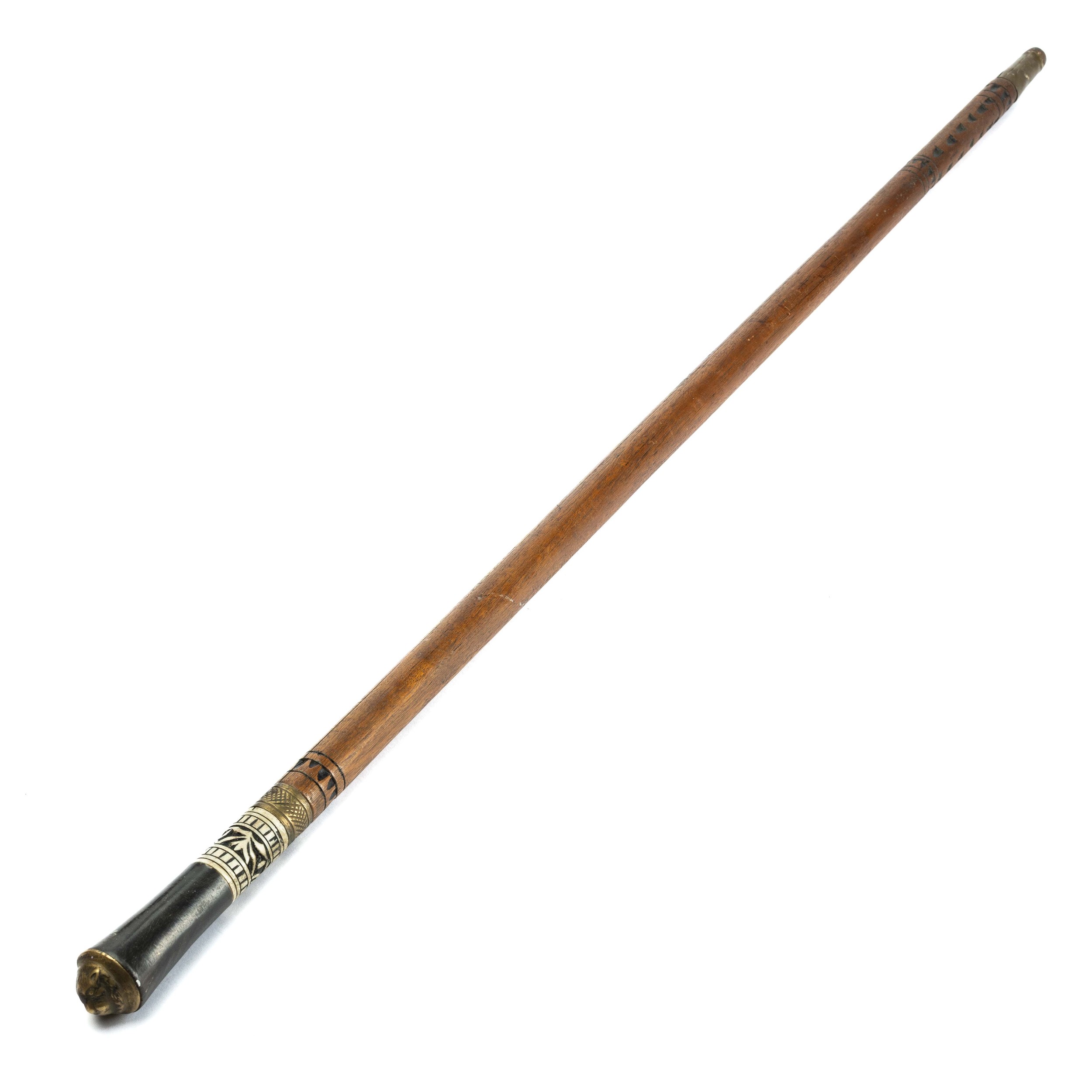 An early 20th century Indian swordstick, horn and carved bone handle, with a brass Lion mask cap, wooden shaft having chip carved decoration to the tip, overall 90cm tall